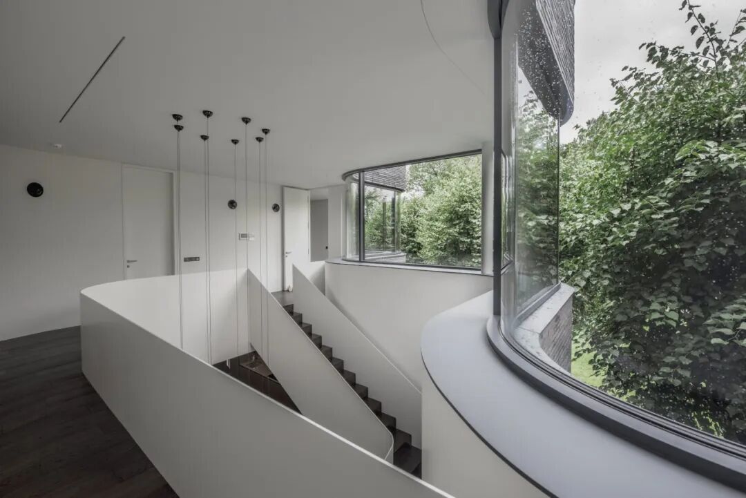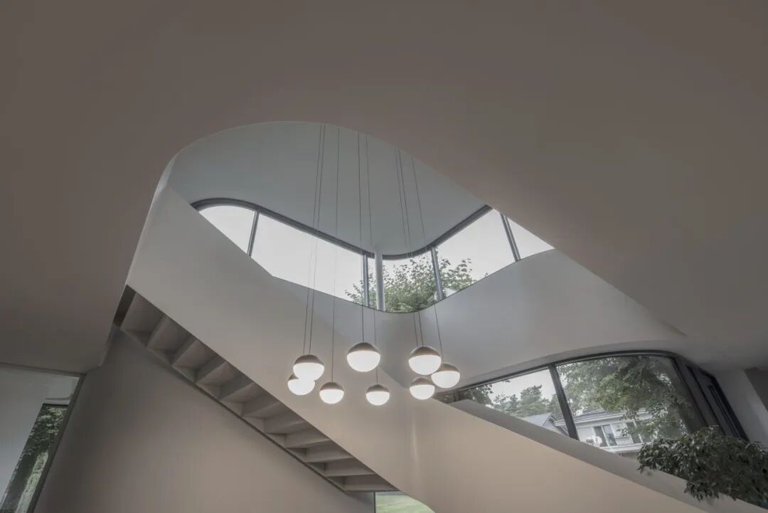 将建筑移到地块中间时,建筑师们有一个很好的创意空间机会,但他们想保留曾经排列在街道两旁的大而美丽的菩提树,因此决定将房子插入斜坡之间和椴树大道。在建筑物后面,中央有一大片空地,造成了一些不协调,但这导致了在斜坡旁边建造房子的想法,以保持与修道院和一段历史的无形联系,保留了曾经在斜坡轮廓上标记街道的古老菩提树大道。建筑师们必须弄清楚如何将房子插入斜坡和菩提树大道之间,所以这一排菩提树恰好决定了房子的某种配置。房子是卷曲的,看起来像是铺设了楼梯,楼梯是圆形的,这样房子就不会那麽咄咄逼人,它会很柔和,以至于视线会从中滑过。旁边生长的菩提树似乎与这种层次相呼应。