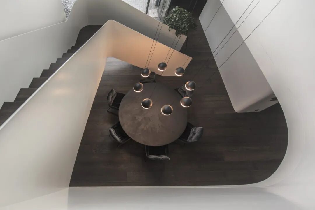 建筑的内部在这一点上很有趣,它再现了大尺度,一些隔断是圆形的,弯曲的窗户和立面的起伏在内部都能感受到。内部以高高的天花板、白色墙壁、白色栏杆、宽大的木板地板和坚固、优质的皮革家具为主。