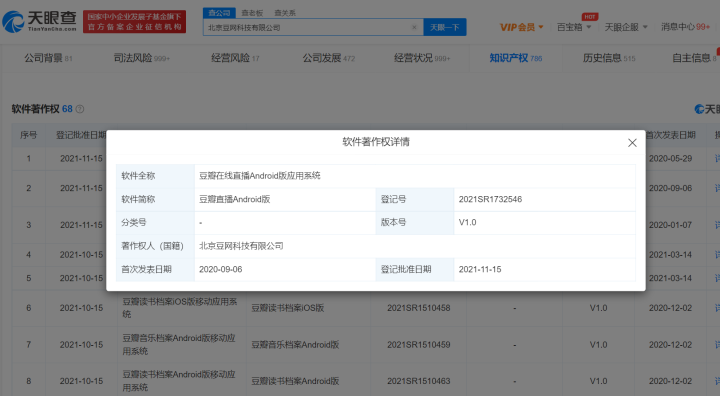 近日,据天眼查App显示,北京豆网科技有限公司“豆瓣在线直播Android版应用系统”获得登记批准,登记号为2021SR1732546,批准日期为2021年11月15日。目前版本号为V1.0。