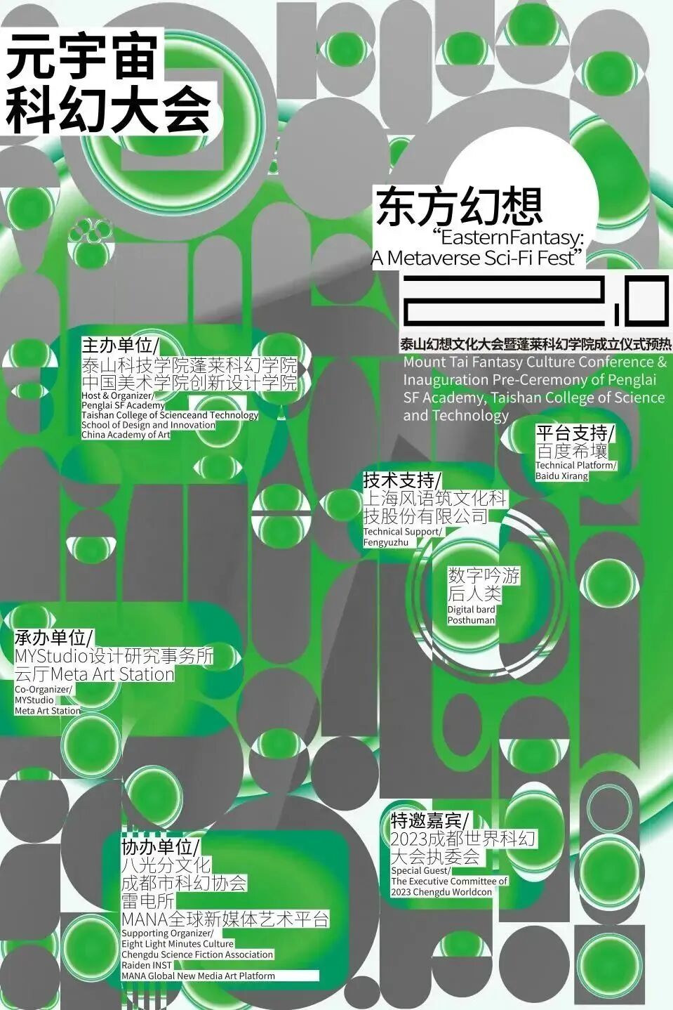“东方幻想”元宇宙科幻大会2.0由蓬莱科幻学院院长吟光与中国美术学院创新设计学院媒介与交互研究所副所长俞同舟发起,两院联合主办,特邀2023成都世界科幻大会执委会,由MYStudio设计研究事务所云厅Meta Art Station承办,八光分文化、成都市科幻协会、雷电所、MANA全球新媒体艺术平台协办,上海风语筑文化科技股份有限公司提供技术支持,百度希壤提供平台支持。大会包括元宇宙科幻文献展、“元宇宙:从数字吟游到后人类”高峰跨界论坛、2023成都世界科幻大会分享会、蓬莱科幻学院成立致辞。