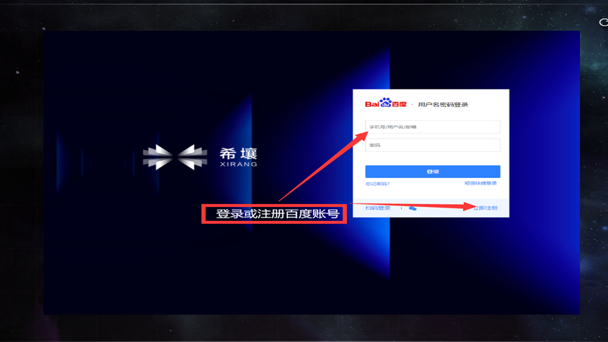 下载完成后,打开希壤,选择同意《服务协议》和《隐私协议》,点击登录/注册,在登录界面中输入您已有的百度账号或注册新的账号并登入。