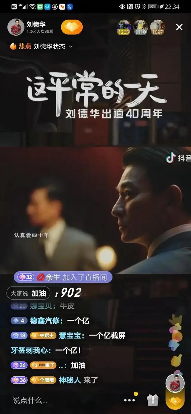 北京时间7月29日晚,刘德华在社交平台“抖音”进行出道40周年“这平常的一天”直播活动,直播间显示,观看人数破1亿。刘德华直播持续了2个多小时,在直播间演唱多首经典歌曲。