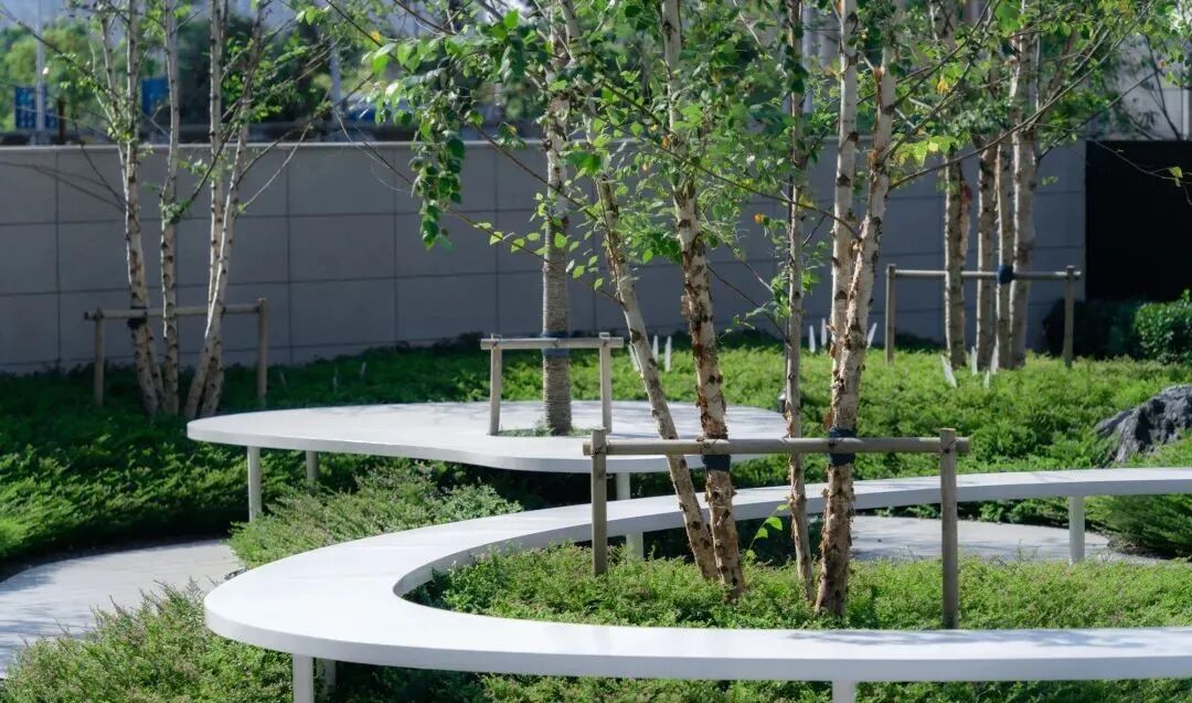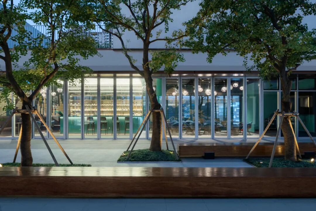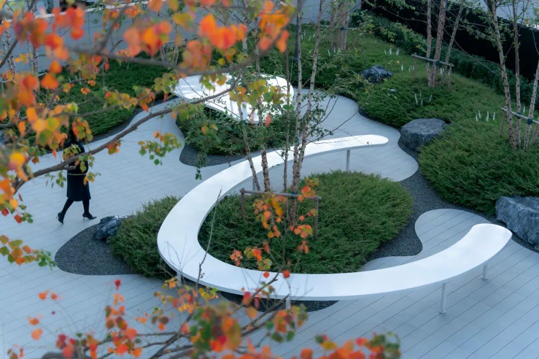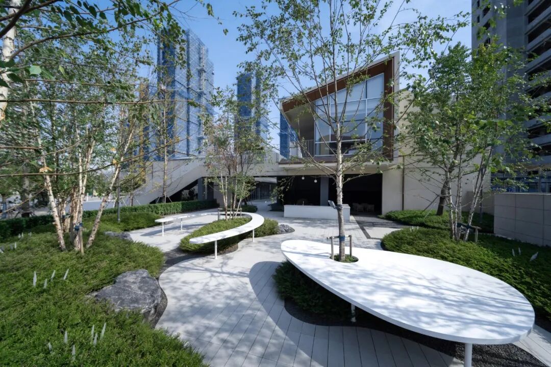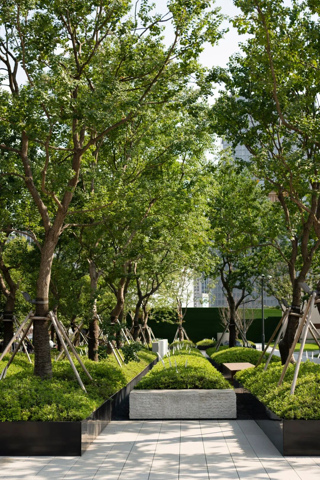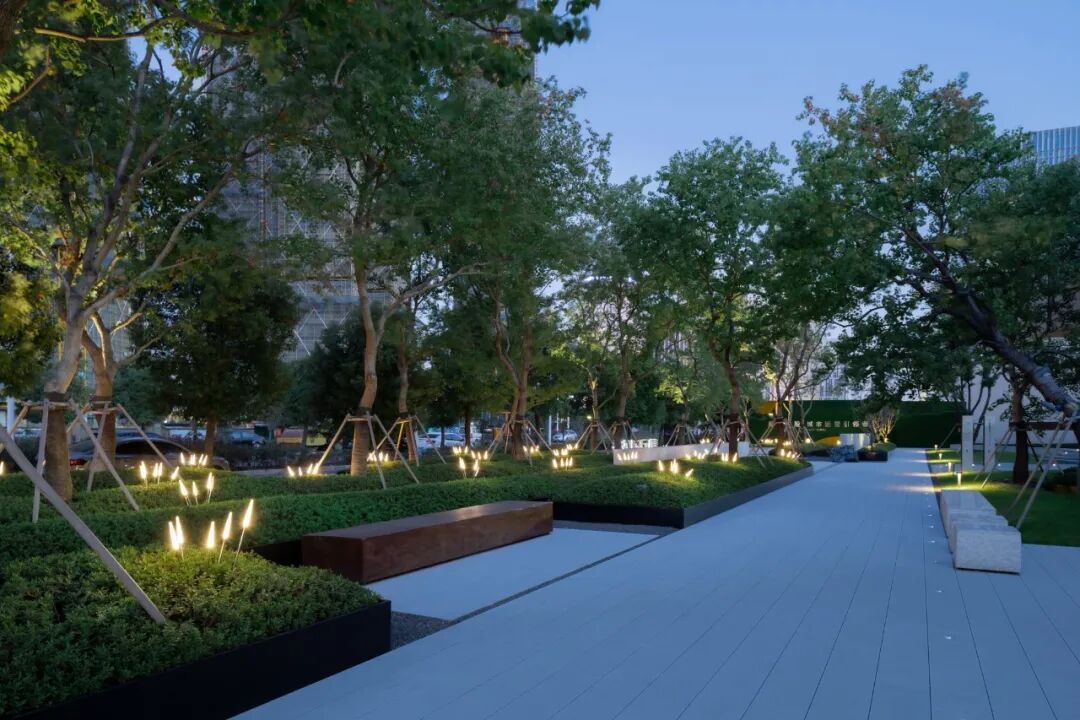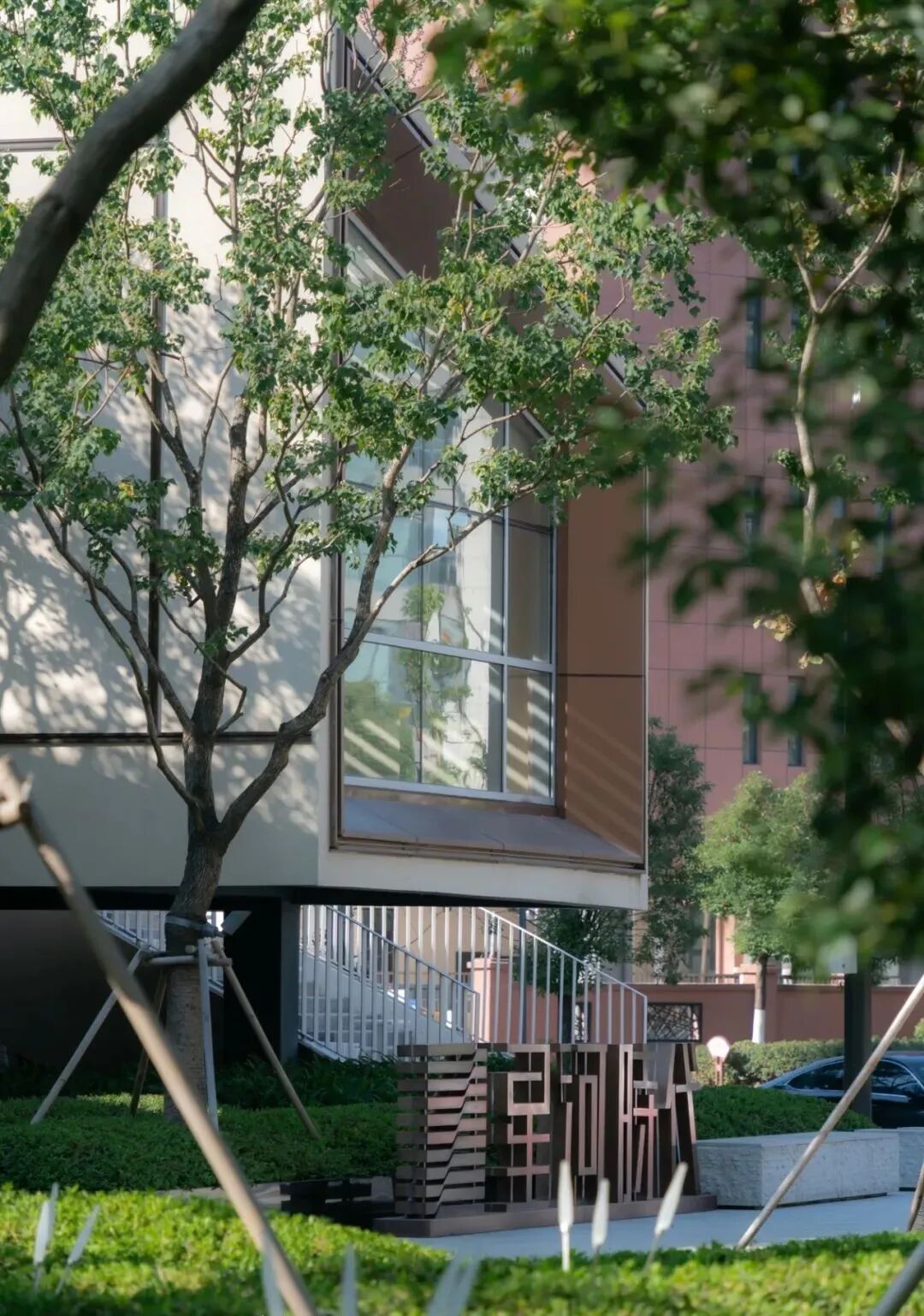 在后场的花园空间里,以极简的手法打造了一片树林,以开阔和舒朗贯穿格局,让景与物契合,借用自然的美学,激活花园的观赏功能与实用功能,人们可以在此处流畅的互动,在拓宽社交场域的同时沉浸地体验景观。