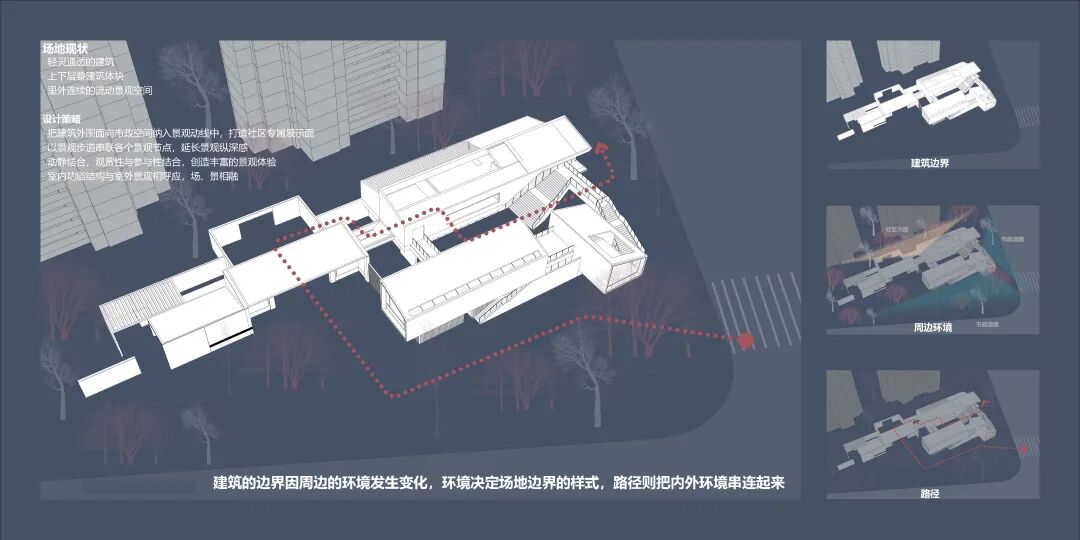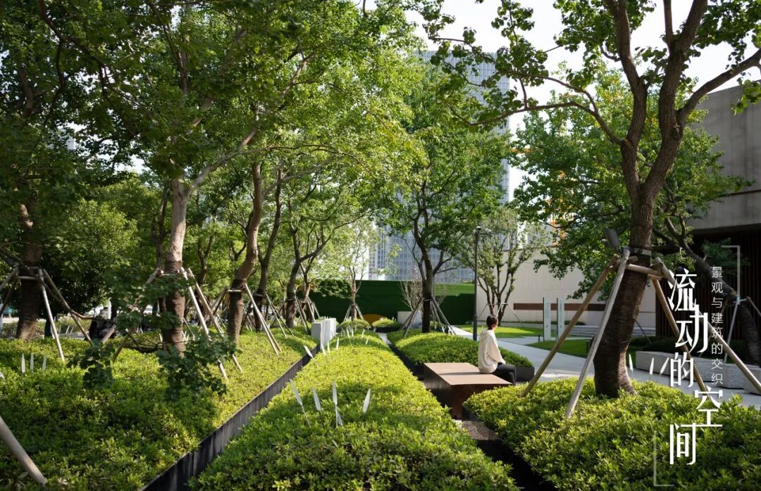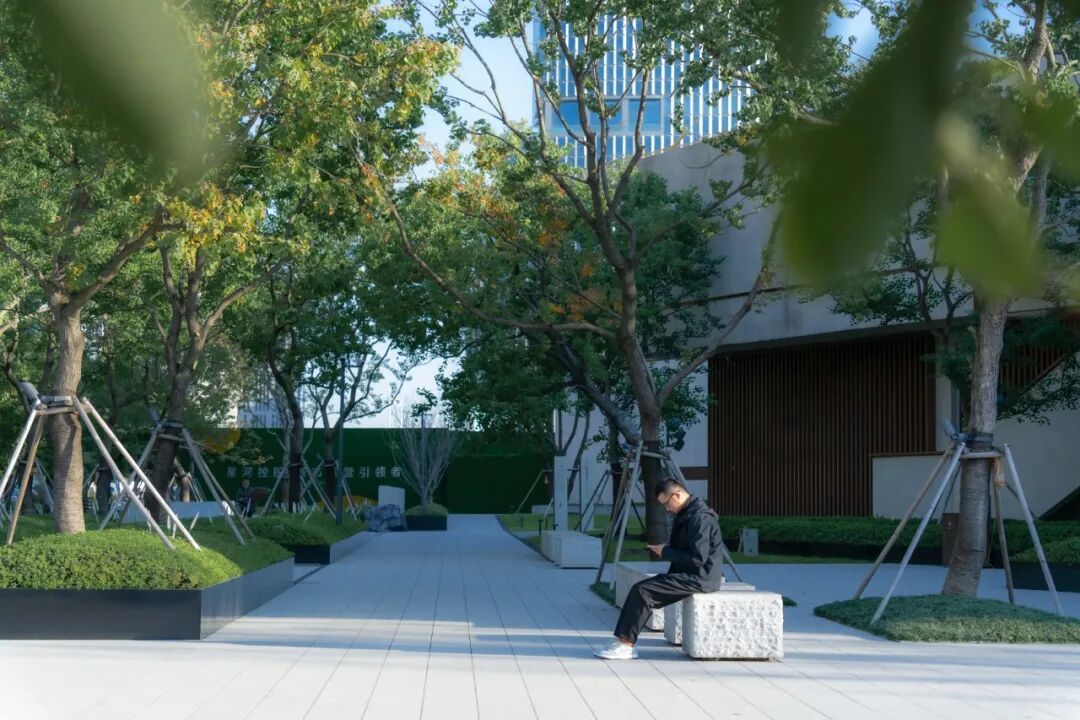 这是一个永久性的展示区,基地处于两条市政道路交叉界面上,整个场地不仅服务于内部社区,也为周边居民提供了一个拥有精致设计语言的、环境优良的、可供漫步、停留的林下公共空间。我们最初的想法是根据建筑未来的业态和建筑与景观的穿插关系,打造实用性高的休闲停留空间,吸引年轻群体前来打卡。