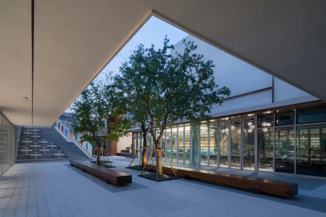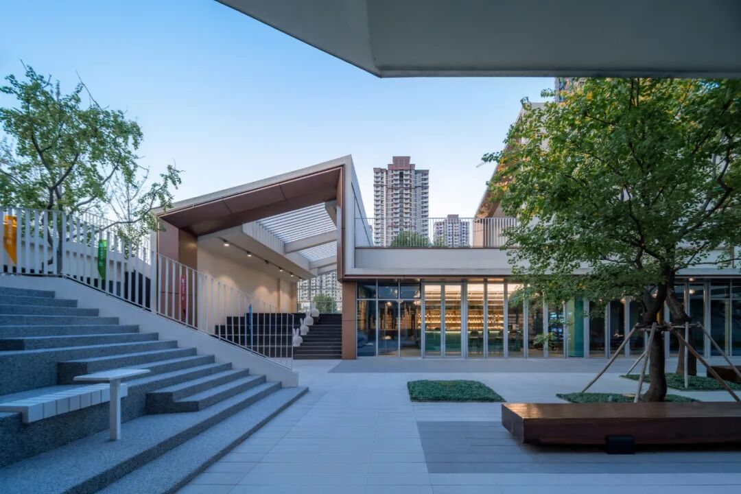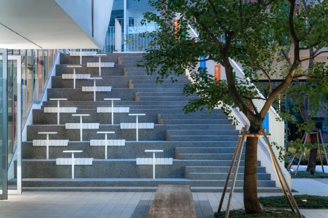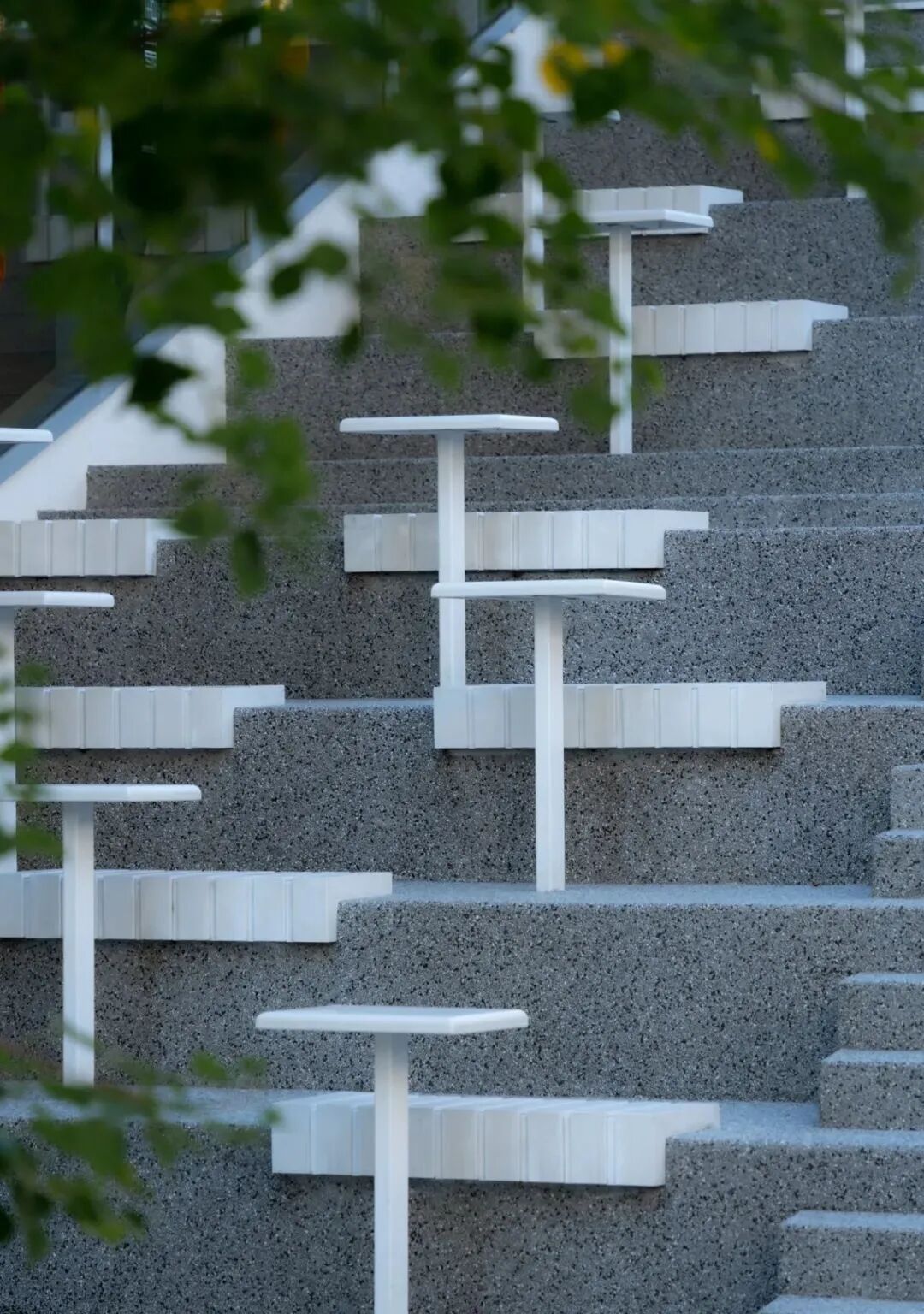 玻璃材质的建筑墙面模糊了建筑室内外的界限和公共空间的边界,让室内外不再有明显的隔离感,引入户外景观,可开展的活动内容也变得多样不再单一。旁边的休闲阶梯作为停留点的同时,也是通往外界的一条捷径。
