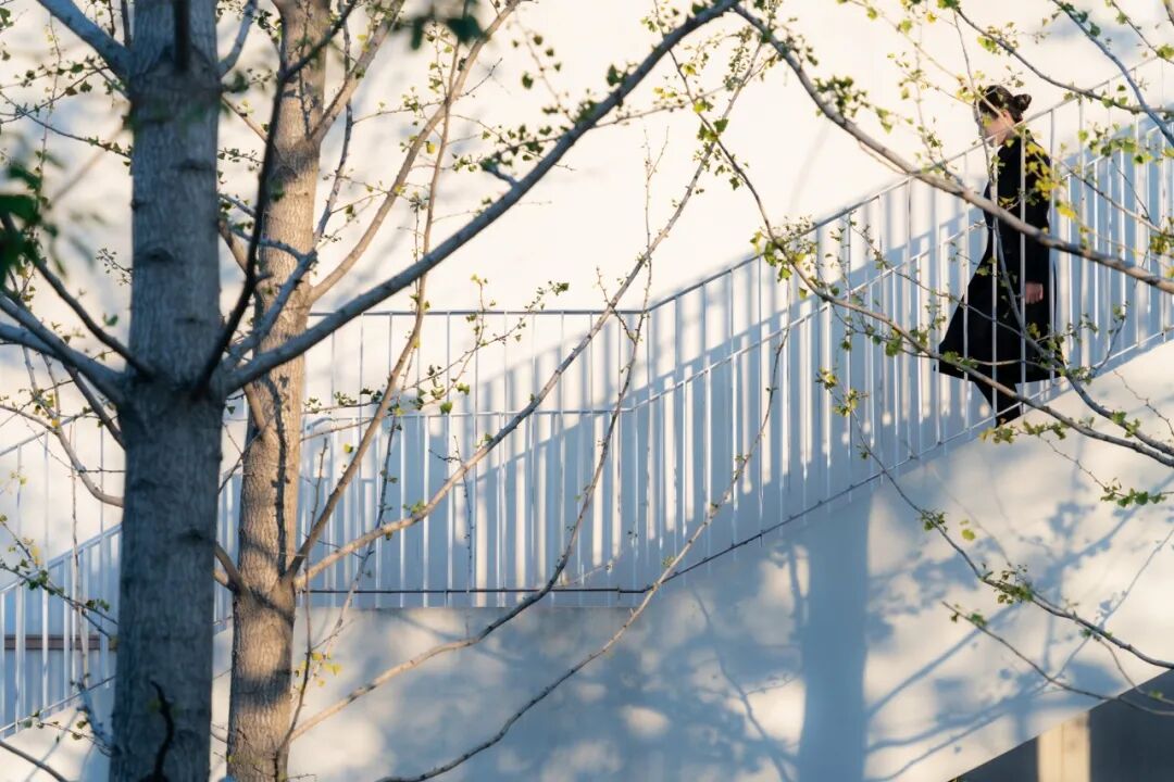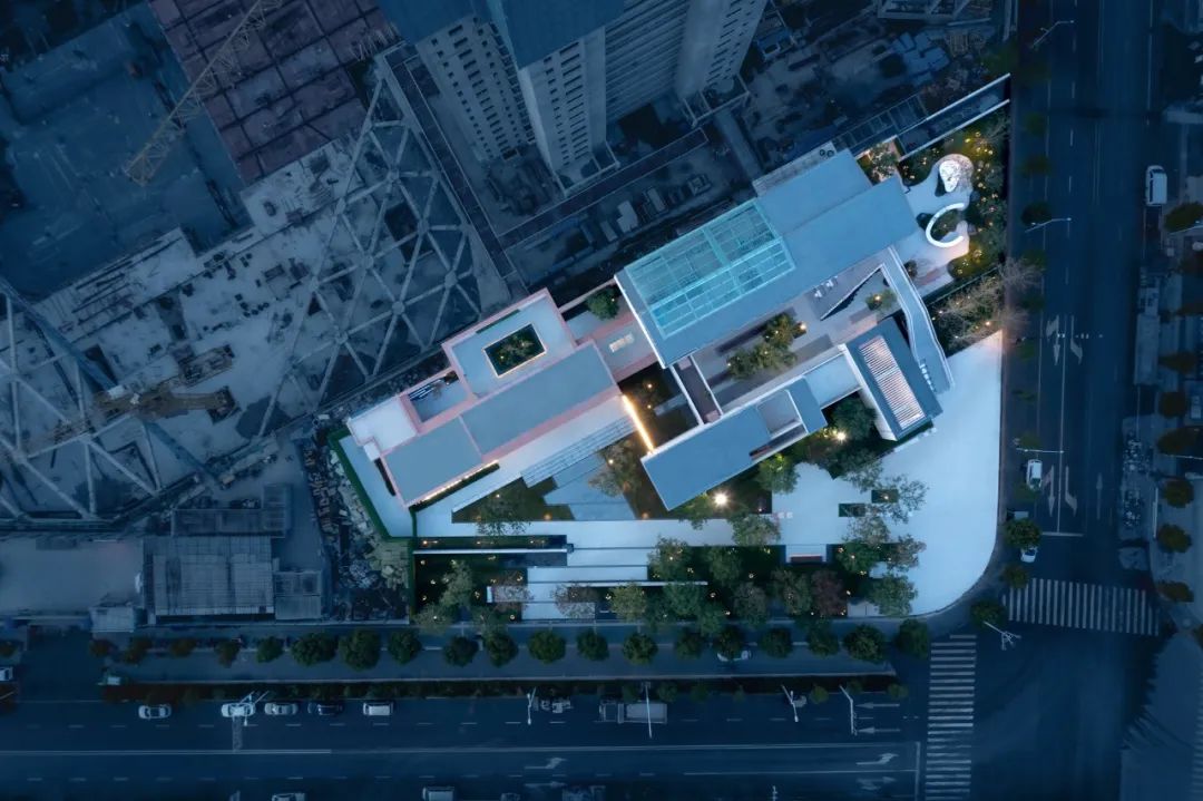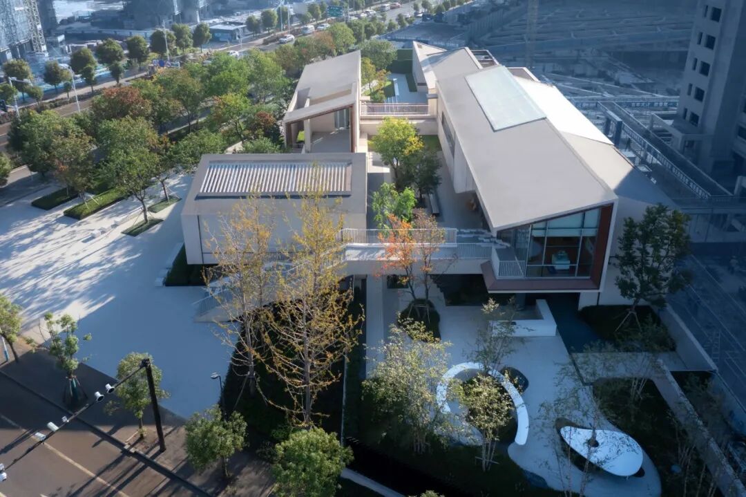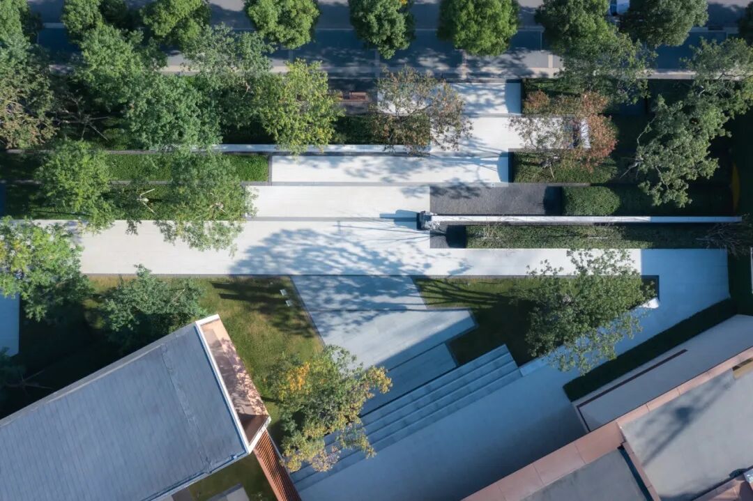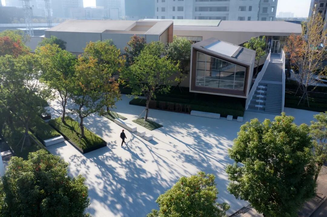 沿街面精选的乌桕,宛如一层绿色的屏障,将展示区隔离到一个从声音喧嚣、交通纷繁中抽离出来的场所——一个内向的可供漫步、停留的场所,而建筑盒子则掩映在树梢里。建筑在未来将用作商用,外来人员可经休闲阶梯上天桥直接到达内庭。