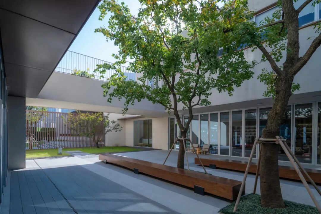 中庭四面围合空间有限,且多处可见,我们根据每个中庭的大小及性质营造开阔或是收拢的空间氛围。不需要太多复杂的元素,只要一棵树,即可得到一个除了光影的魅力,什么都不打扰的安静空间。