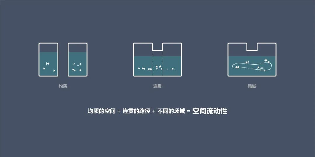 流动空间的主旨是不把空间作为一种消极静止地存在,而是把它看做一种生动的力量。在空间设计中,避免孤立静止地体量组合,而追求连续的运动空间。我们用通透的空间,引导性的线型,流畅的行动路径,增强空间的流动感。