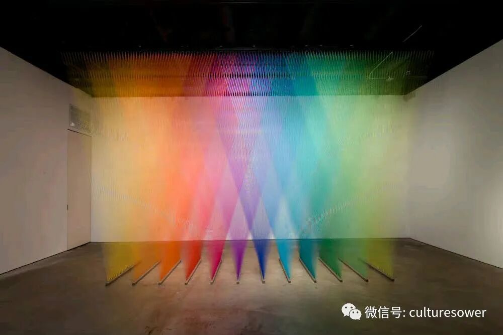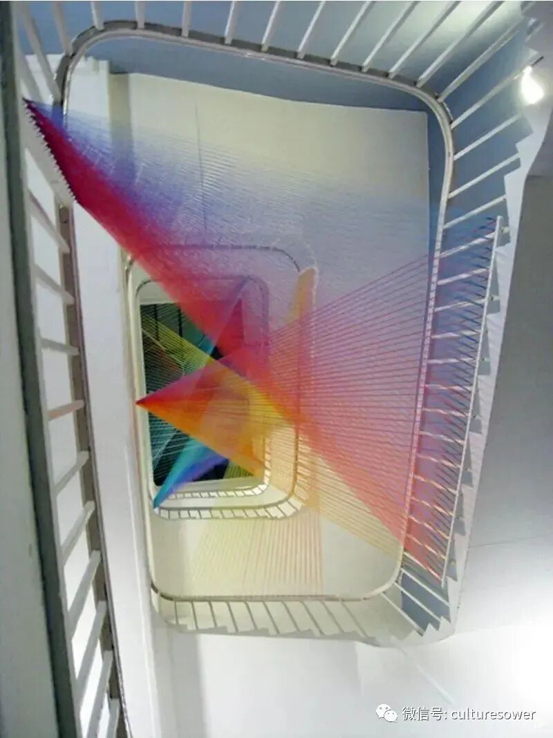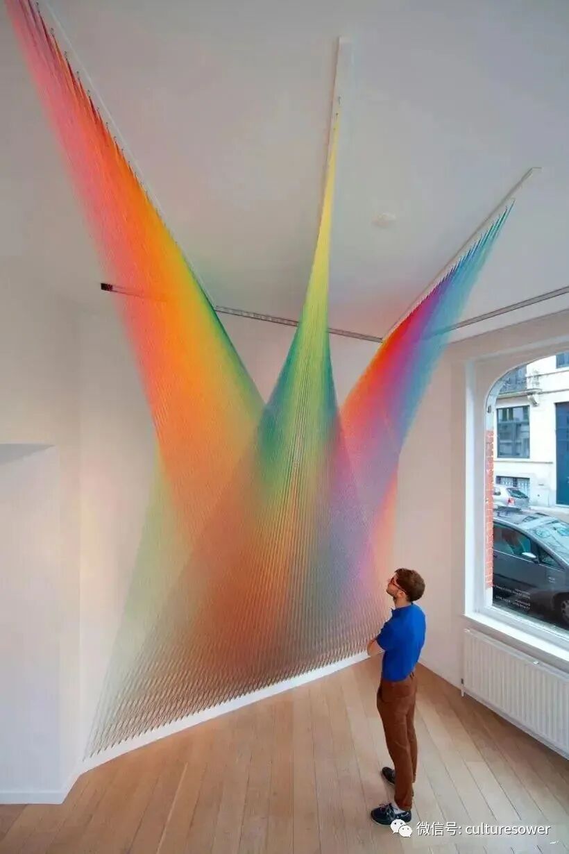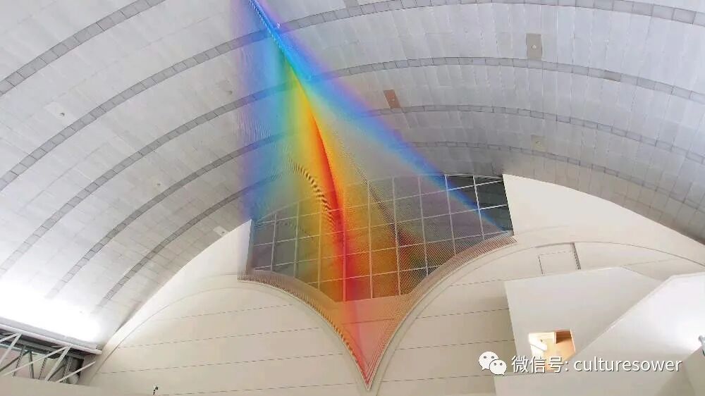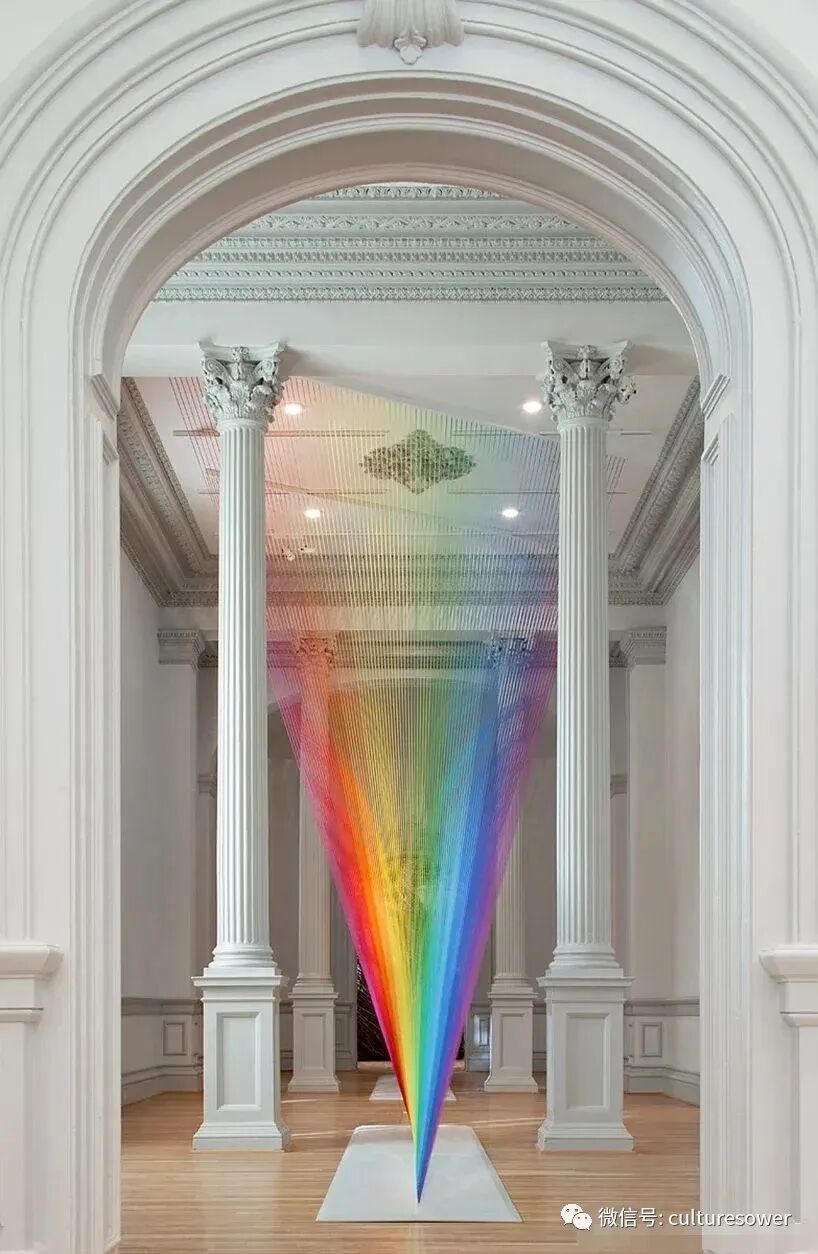 Dawe一位来自墨西哥的艺术家,他以2016“Plexus”系列丝线艺术装置而出名,他在室内编织出的彩虹简直如同梦境一般。他解释道“Plexus”来源是人与环境的连结,也是直接参与构成装置本身错综复杂的线网。丝线中固有的张力使得光谱仿佛在空间中是有形的,而色彩的视觉偏差是则光在丝线上震动的结果。彩虹代表着光,艺术家试图表达人与物的合一,选择“线”这个材料构成彩虹,与空间对话,与美术史历史对话,呈现自然又回到自然。我仿佛能看见那梦中的彩虹,带着我穿梭到过去,未来。(注图文均来源网络,版权属于原作者)