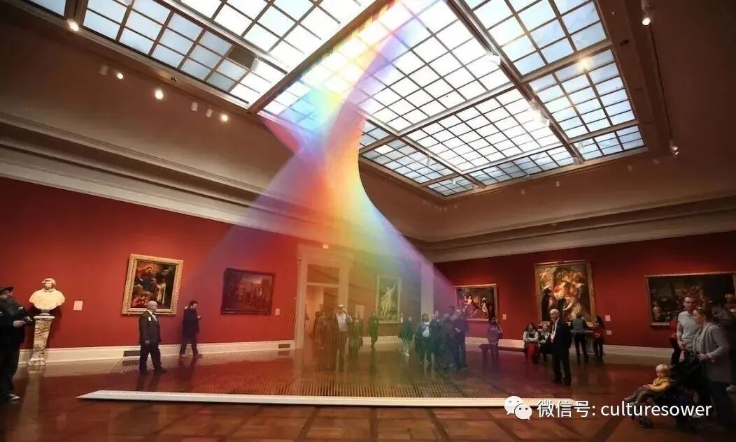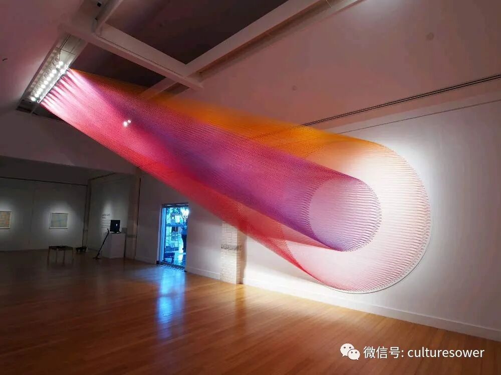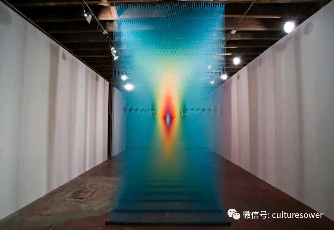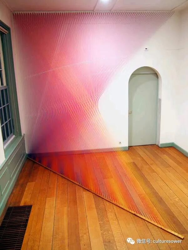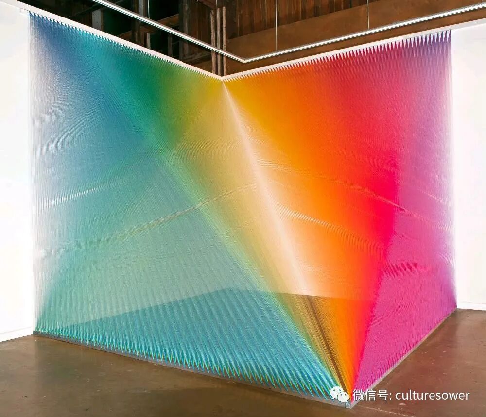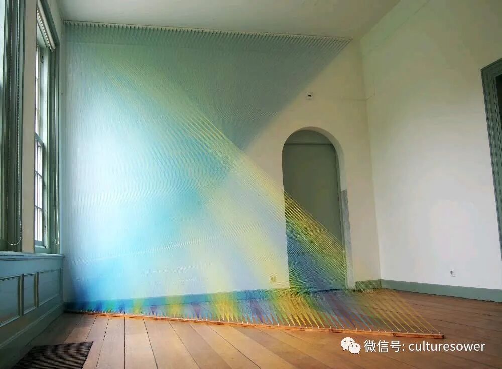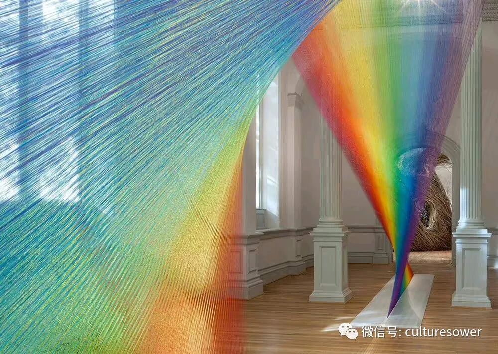 Dawe一位来自墨西哥的艺术家,他以2016“Plexus”系列丝线艺术装置而出名,他在室内编织出的彩虹简直如同梦境一般。他解释道“Plexus”来源是人与环境的连结,也是直接参与构成装置本身错综复杂的线网。丝线中固有的张力使得光谱仿佛在空间中是有形的,而色彩的视觉偏差是则光在丝线上震动的结果。彩虹代表着光,艺术家试图表达人与物的合一,选择“线”这个材料构成彩虹,与空间对话,与美术史历史对话,呈现自然又回到自然。我仿佛能看见那梦中的彩虹,带着我穿梭到过去,未来。(注图文均来源网络,版权属于原作者)
