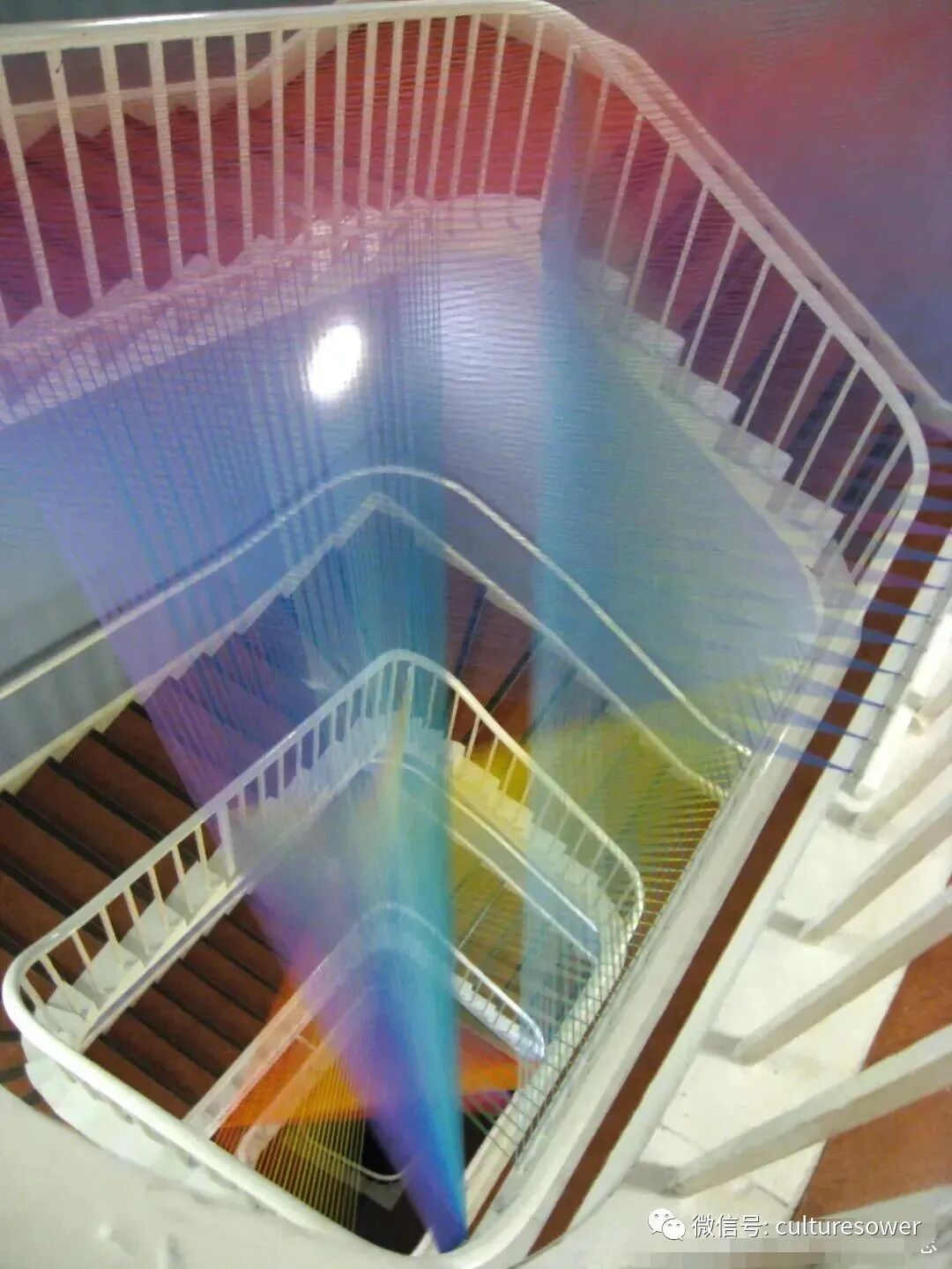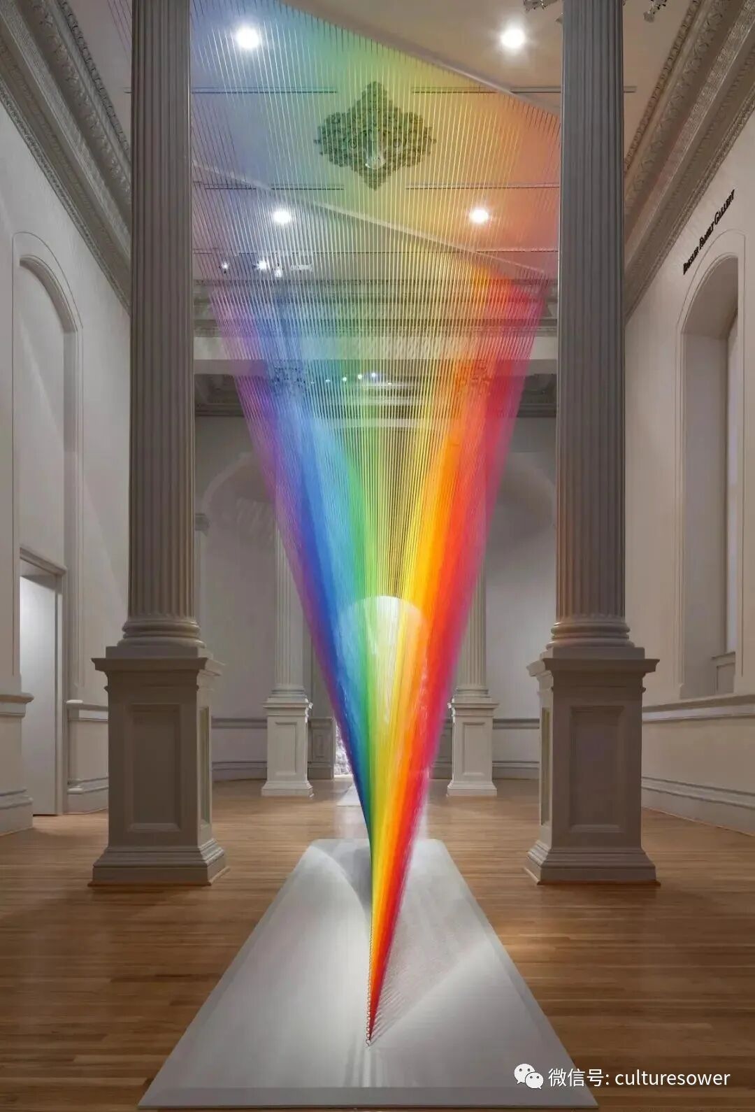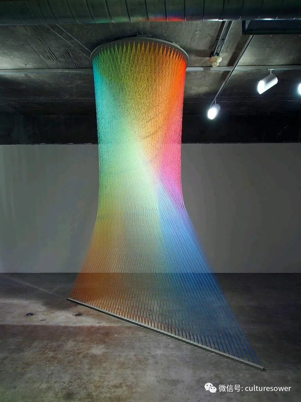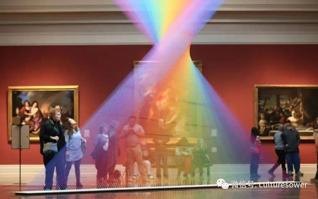 Dawe一位来自墨西哥的艺术家,他以2016“Plexus”系列丝线艺术装置而出名,他在室内编织出的彩虹简直如同梦境一般。他解释道“Plexus”来源是人与环境的连结,也是直接参与构成装置本身错综复杂的线网。丝线中固有的张力使得光谱仿佛在空间中是有形的,而色彩的视觉偏差是则光在丝线上震动的结果。彩虹代表着光,艺术家试图表达人与物的合一,选择“线”这个材料构成彩虹,与空间对话,与美术史历史对话,呈现自然又回到自然。我仿佛能看见那梦中的彩虹,带着我穿梭到过去,未来。(注图文均来源网络,版权属于原作者)