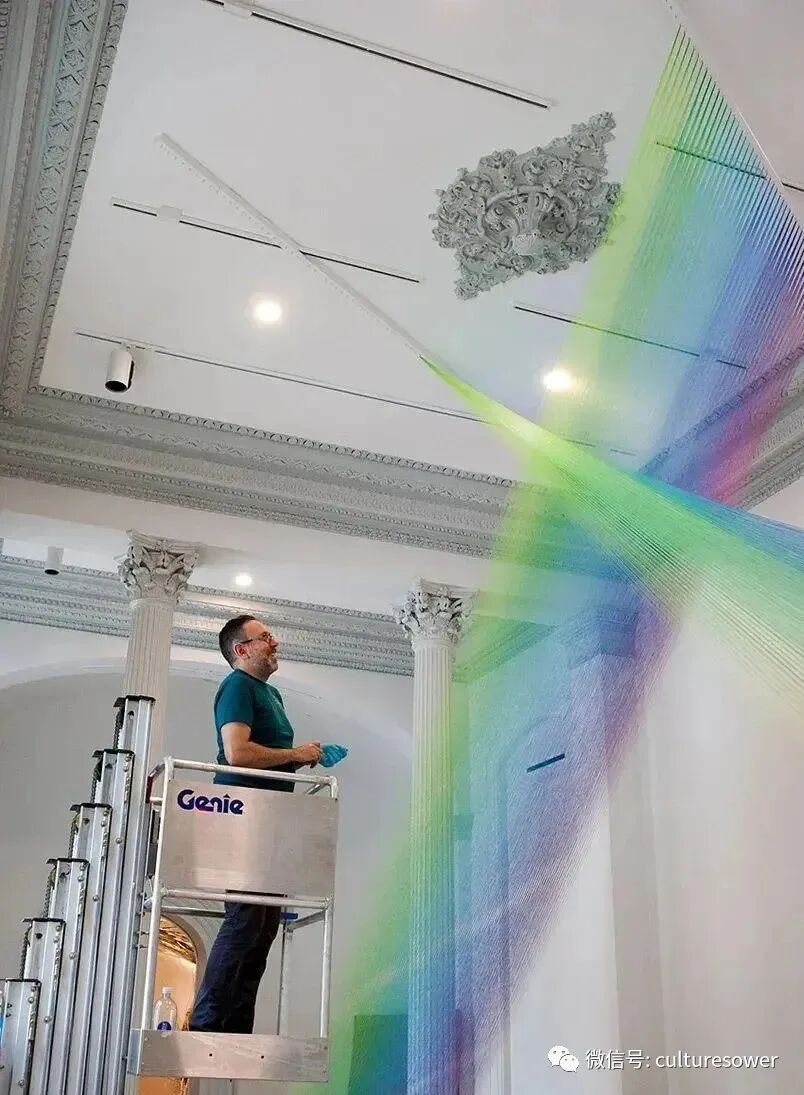 Gabriel Dawe的五彩线装置吸引眼球并挑战我们对空间的感知。起初,您可能认为自己看到的是全光谱的投射光:墙壁和地板上闪烁着饱和色调的彩虹。