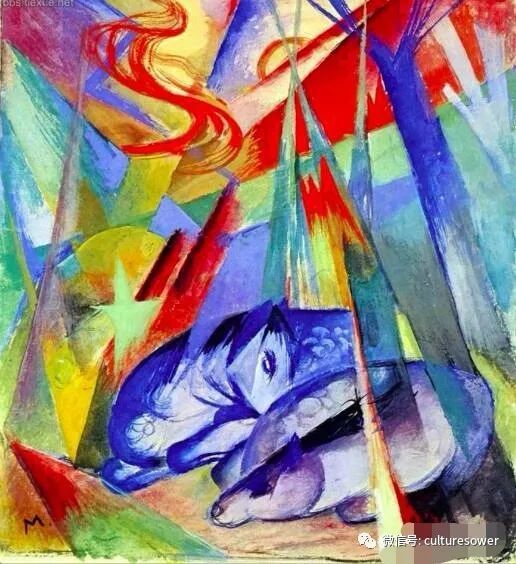 桥社的种种主张,与1912年在慕尼黑成立的“青骑士”形成了南北呼应。青骑士包括著名的艺术家奥古斯特·马克(August Macke)、弗兰茨·马尔克(Franz Marc)等人,当然其中最有名、最重要的人物当属康定斯基。他身兼数种重要身份,如抒情诗人、剧作家等,他快30岁的时候才进入绘画领域,却成为美术史上一个重要的革新者。关于“青骑士”一名的由来,据康定斯基自己的解释出奇得简单。康定斯基写道:“我和马尔克在位于辛德尔斯多夫(Sindelsdorf)园中小屋的咖啡桌上杜撰出了‘青骑士’这个名称;我们两个人都爱蓝色,马尔克是马,我是骑手。于是这个名字就自动冒出来。