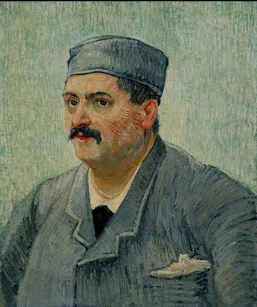 医生迦歇,是他守护了可怜的梵高短促生命中最后的日子;他瘦削,显得有些劳累憔悴,这位热爱印象派绘画的医生是平民阶层中辛苦的勤务员,梵高笔下的迦歇,是耶稣!邮递员露林是梵高的知己,在阿尔的小酒店里他们促膝谈心直至深夜,梵高一幅又一幅地画他的肖像,他总是高昂着头,帽箍上夺目的“邮差”一样一丝不苟,他为自己奔走在小城市里给人们传送音信的职是感到崇高。