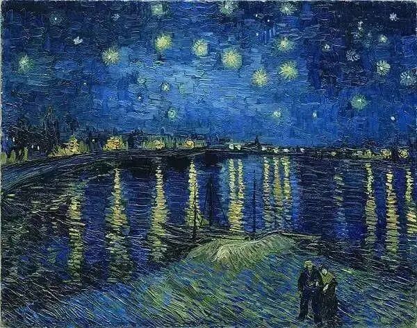 梵高几乎不用平涂手法。他的人像的背景即使是一片单纯的色调,也凭其强烈韵律感的笔触推进变化极微妙的色彩组成。就像是流水的河面,其间还有暗流和游涡。人们经常被他的画意带进繁星闪烁的天空、瀑布奔腾的山谷……