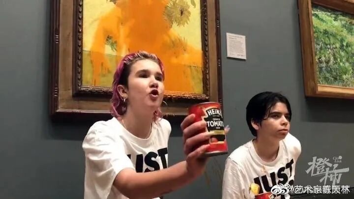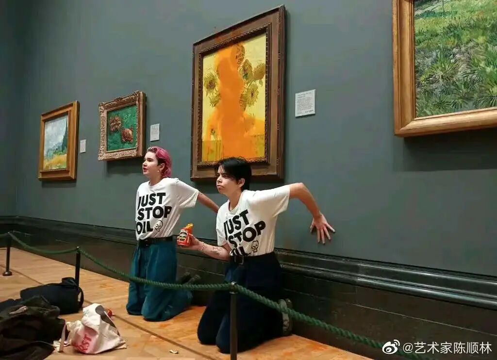 当地时间10月14日中午11时,英国国家美术馆内馆藏的梵高名作《向日葵》,被两名环保组织成员泼了两罐番茄汤罐头。社交网络上流传的视频显示,两人自称属于“停止石油(Just Stop Oil)”。往名画上泼完番茄罐头后,两人把手粘在画作下方的墙上。据悉,这幅《花瓶里的十五朵向日葵》,价值约7250万英镑,表面有一层玻璃保护。