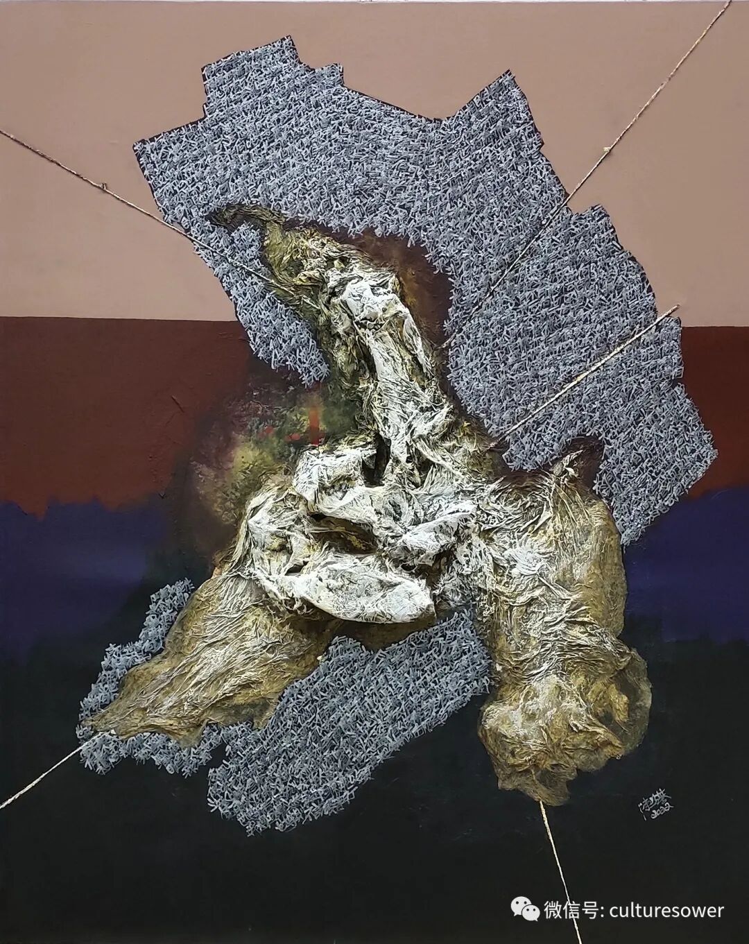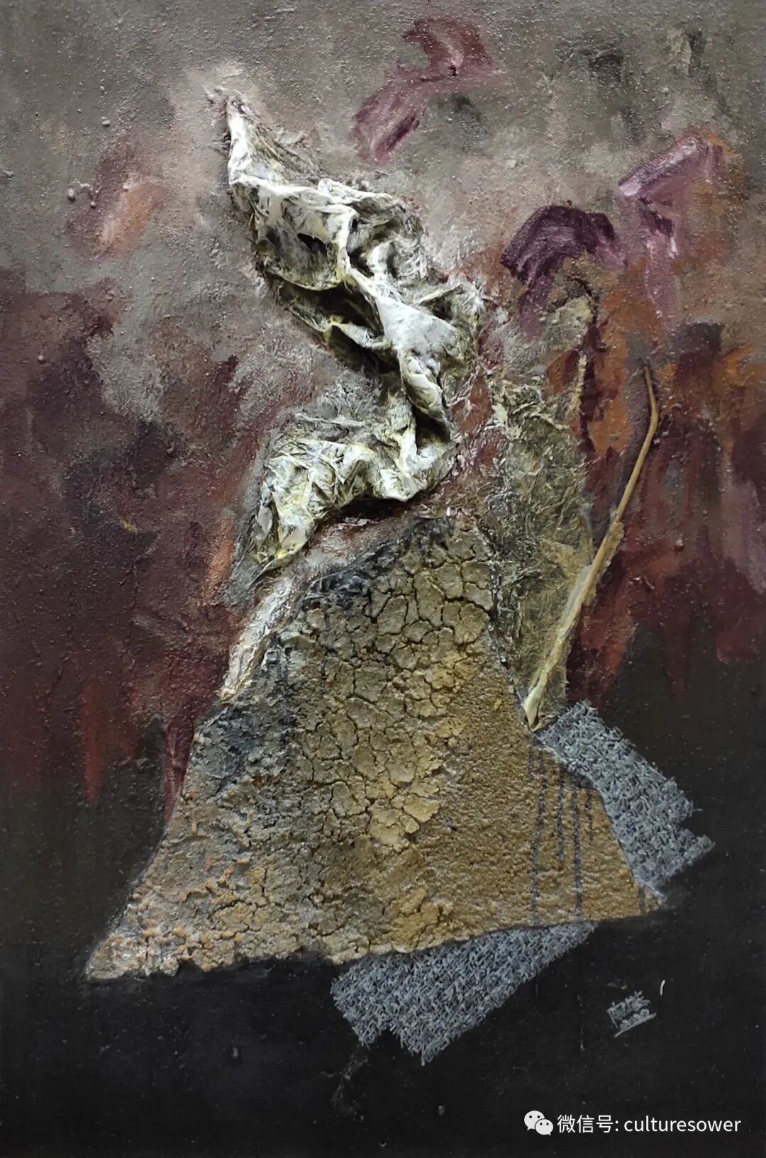 严格意义上来说,幺哥算我的“师爷”,我的启蒙恩师刘晓(贵州大学艺术油画研究生导师)就是他早年的学生,以此来说叫“师爷”理所当然。第一次与幺哥见面时就提及这个事,幺哥说:我们各玩各的,喊我“幺哥”即可。记得2017年11月幺哥在贵阳市美术馆“时光拼贴的个体——陈启基1967-2017艺术之路”作品展,刚好我从德国游历回来,看了很多德国表现主义基弗尔、博伊斯、吕佩尔茨等诸君的很多作品。再回到贵阳接着看了幺哥的这个个人展,一下子在我心里出现了中西方艺术家形式与语言的对话及碰撞。幺哥用东方的哲学智慧转换了德国表新现主义式的表达,这是让我不得不佩服他的智慧及艺术的敏感度。在展览现场,我们又彼此在画前探讨与碰撞,我记得当时油画作品《老树》,看上去像屏风的三联画,描绘贵州的山与雾还表现出烟云缭绕,我喜欢这一组作品。幺哥的作品不仅仅有地域的表达,还装着中国传统文化中的智慧与意象再现。幺哥的这些表达也影响了我后来提出的“中国书写意象表现主义”这一绘画流派。可以非常明确地说,幺哥是贵州书写意象表现主义的先驱代表性人物。