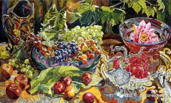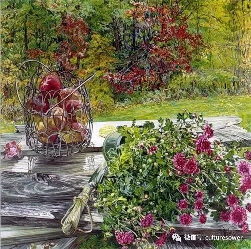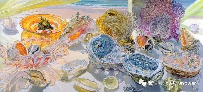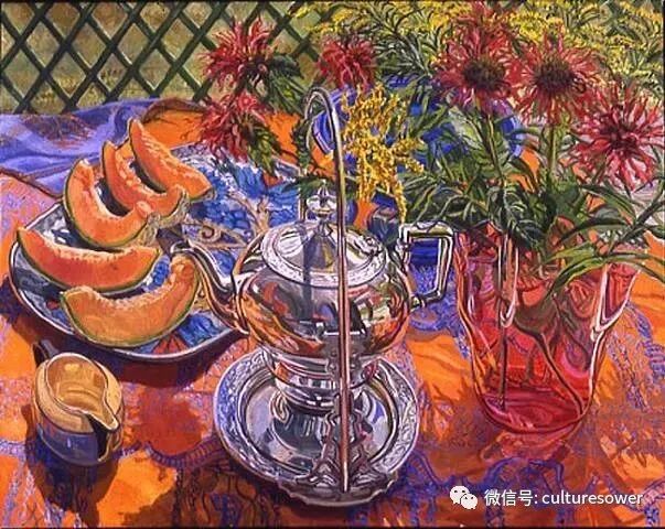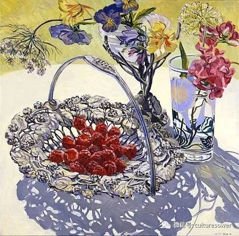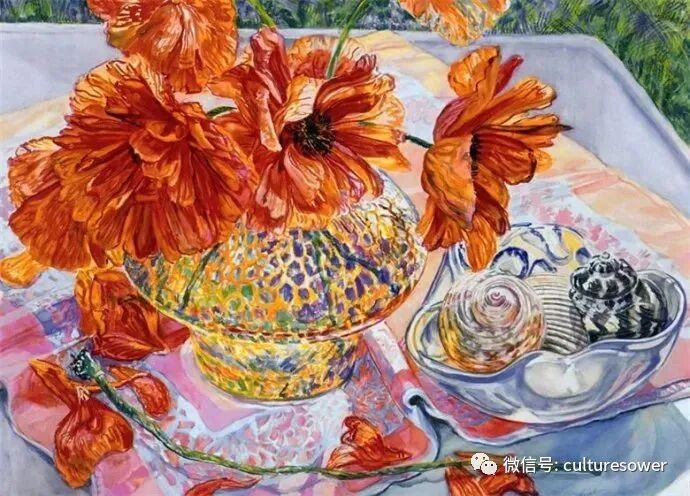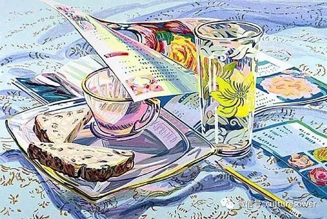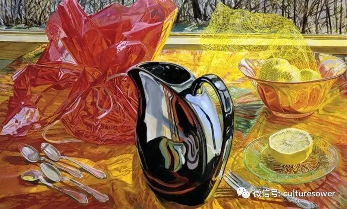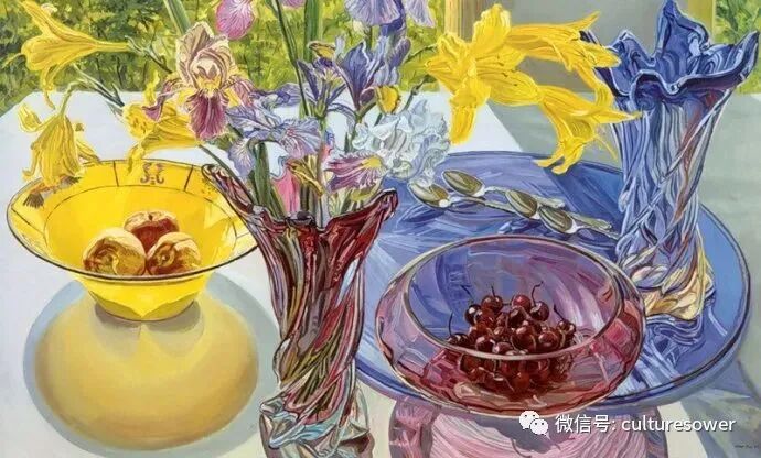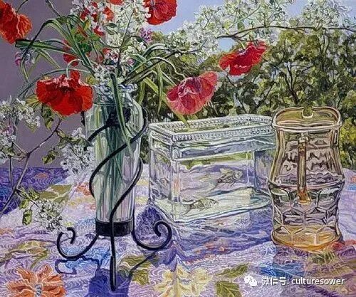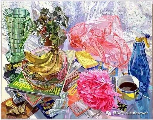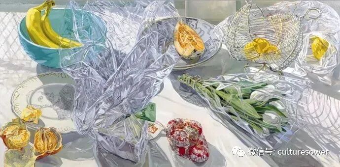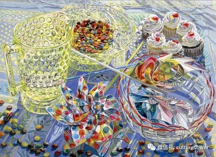 珍妮特·费诗(Janet Fish)1938年生于波士顿,是著名的当代美国艺术家。她的作品有别于传统的静物绘画,呈现出夺目的色彩和明亮感,用独特的笔触引导着人们的眼睛透过绘画上那透明的表面和繁复的图案。
