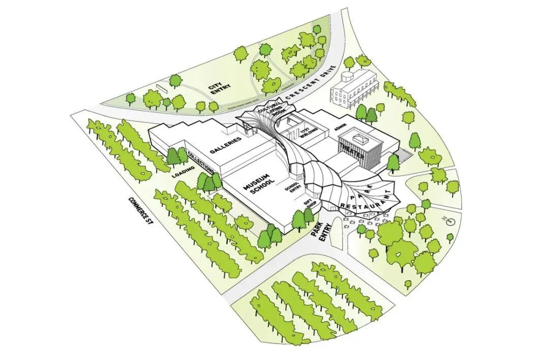 主要轴线被设想为南北向延伸的植物的茎,以主要的新游客设施为基础,设计在美术馆现有建筑之间进行调解,以定义一个新的公共画廊和聚集空间,连接不同功能空间,并满足其不断增长的游客需求。