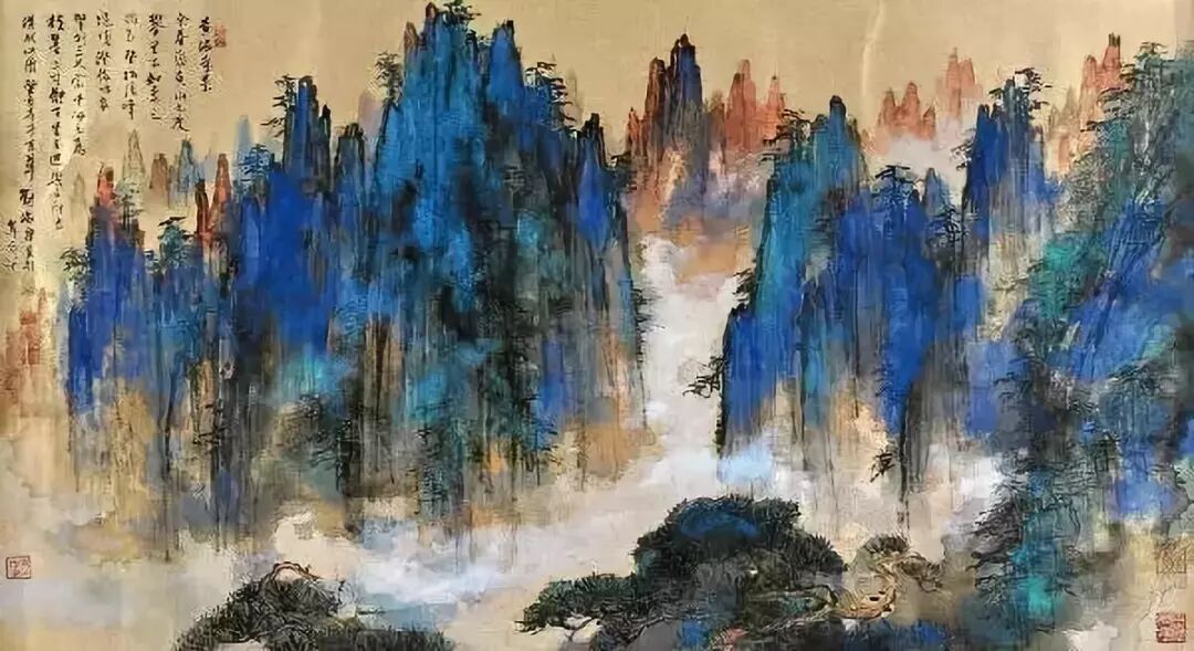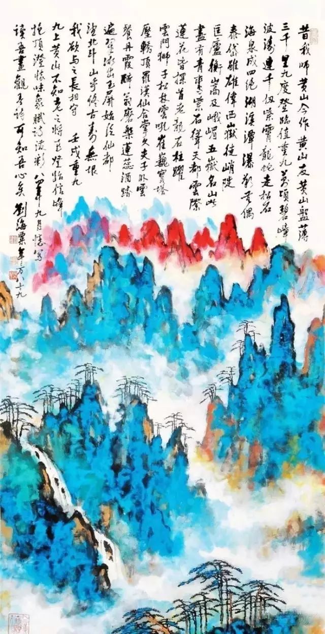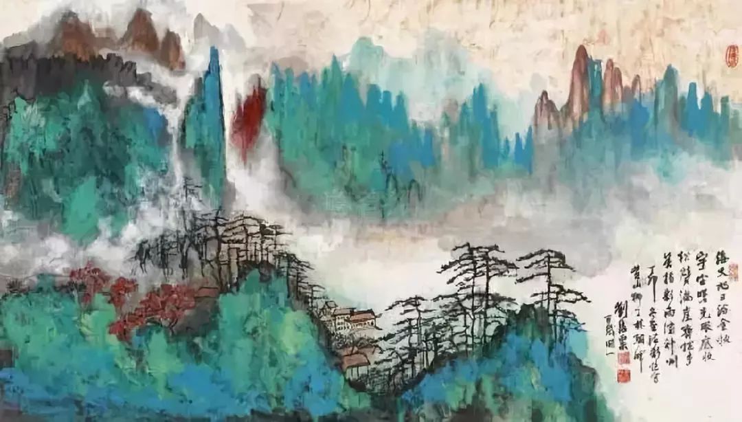 刘海粟在继承传统的基础上,对泼彩、泼墨的技巧加以发展创造,再和黄山的景致气息相通,他的自我风格更为突出。