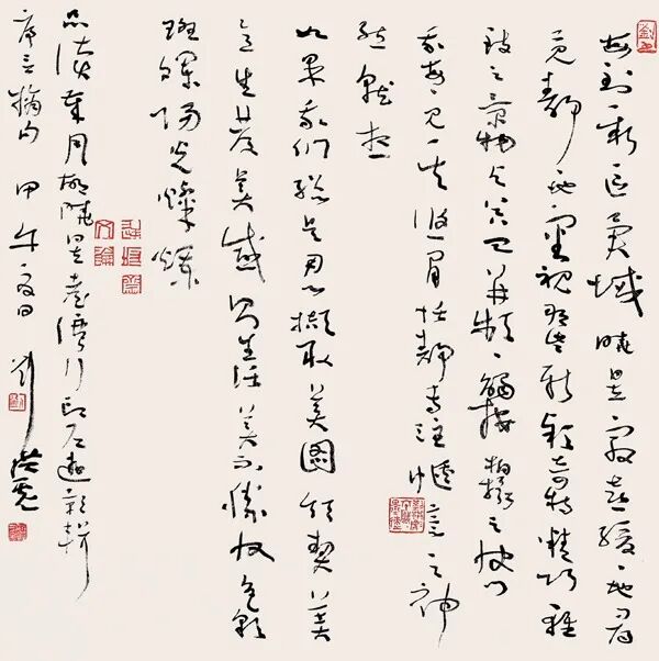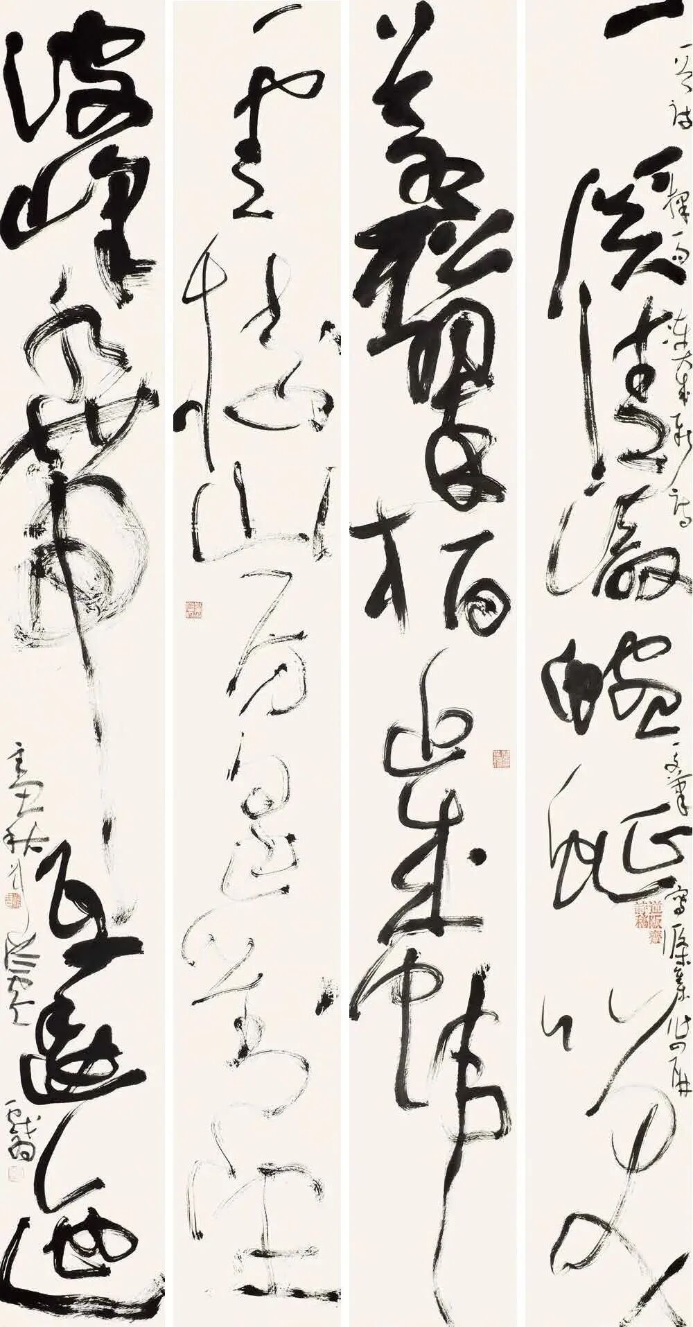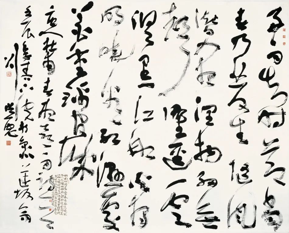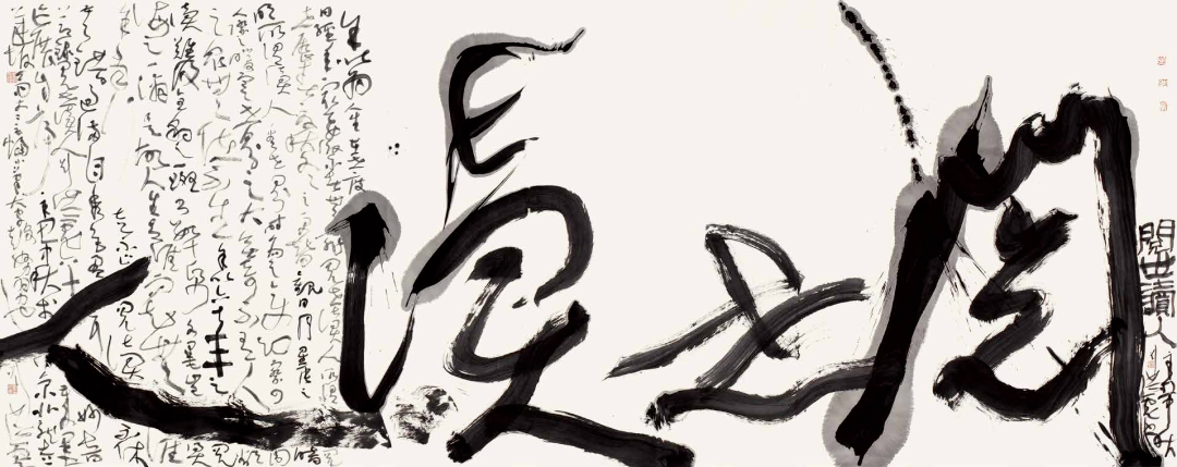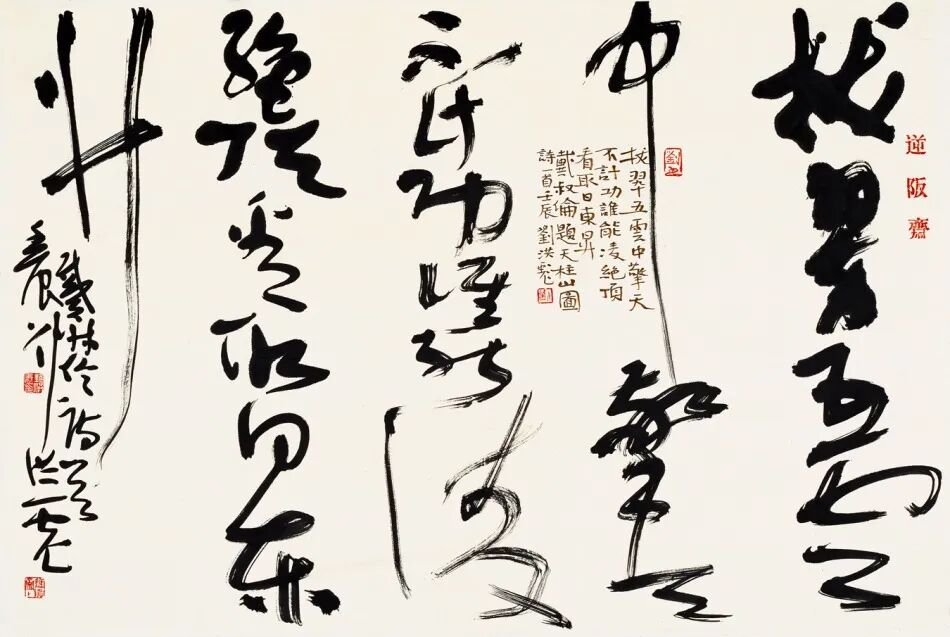 我不是只痴迷于书法,我只不过这几十年来一直在做这么一件事情,我有时候一两个月都没动过一笔,我不写字。我这个五十岁墨迹展五十件作品是在十四天内完成的,实际上是九天。书法创作,就是要变化,要与众不同,唯一性,不可重复,就是别人没有搞过的,自己也没有搞过的。对自己的重复和对他人的模仿都不叫创作。