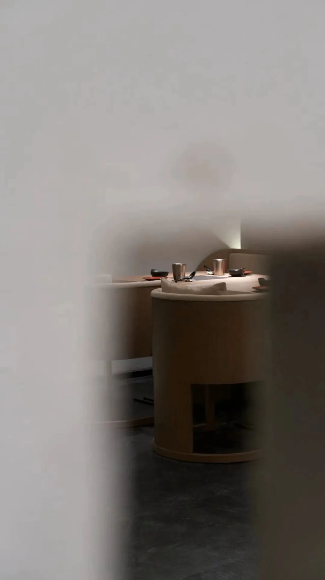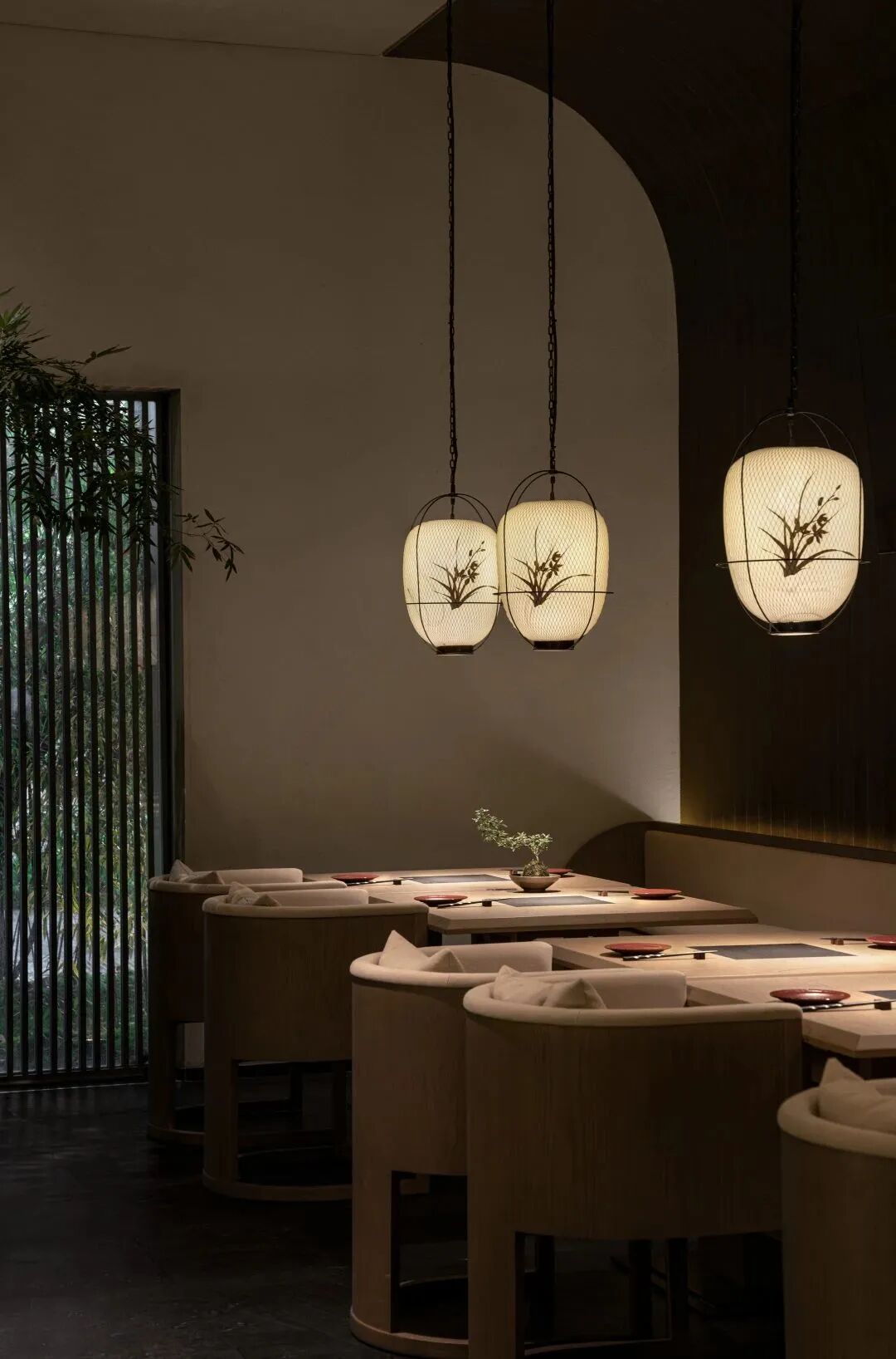 掀开帘幕,影影绰绰的格栅光影投在转承的通道门口,绿植在淡淡柔光中摇曳,打开连接室内和室外的同时,开启满目的柔和为客人提供餐饮服务。