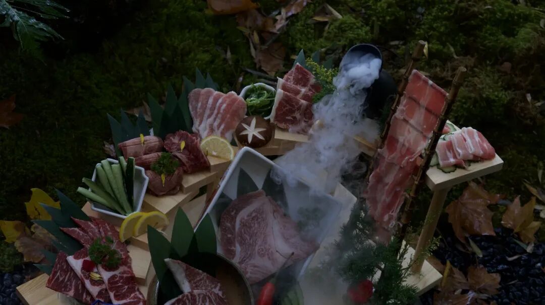 深谙日式空间的美学哲理,肌理墙、卵石、青苔、绿植,看似简约的陈设下,每一个自然之物都深有禅意。空间凝聚为独特的视觉艺术,呈现一种空灵和寂静俱在的餐饮氛围,令人沉浸。
