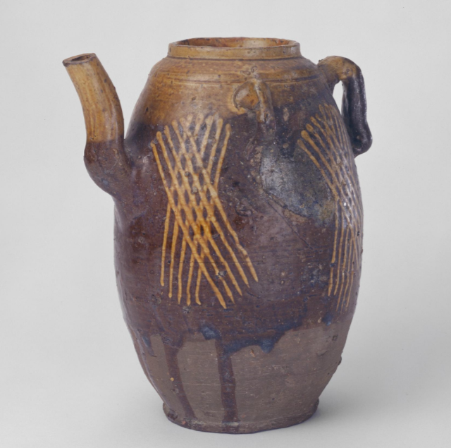 壶直口,无颈,长圆腹,浅圈足,一侧置曲状流,相对称一侧为短柄,肩部饰双系。壶体外腹上部施黄釉,中间施紫釉,釉面饰浅黄色交叉状复线纹共四组,下腹部及足部露紫黑色胎体。
