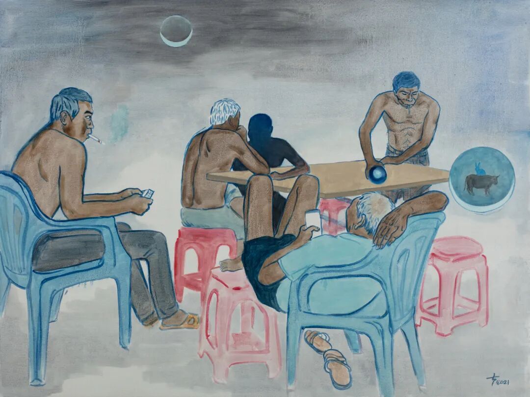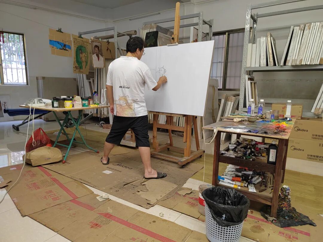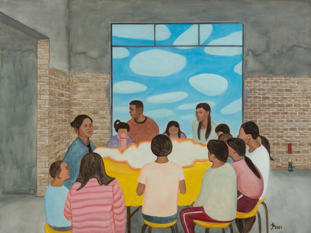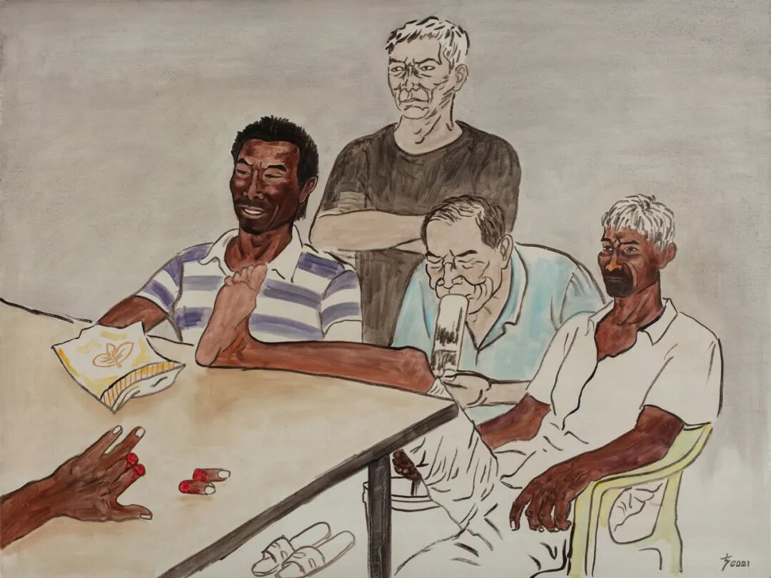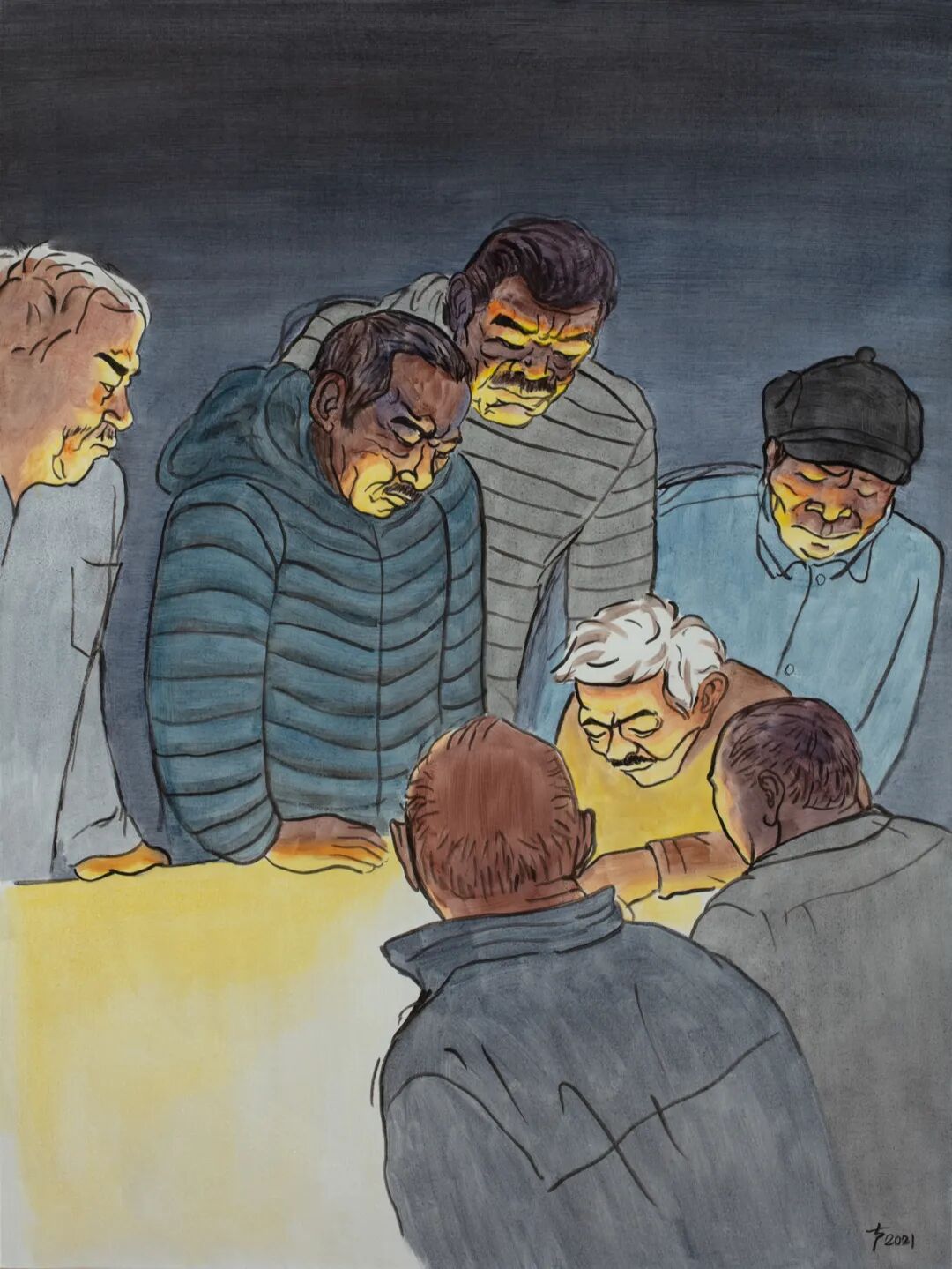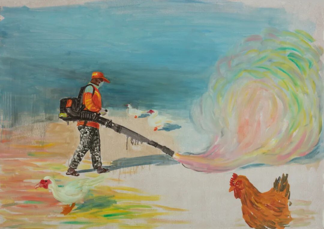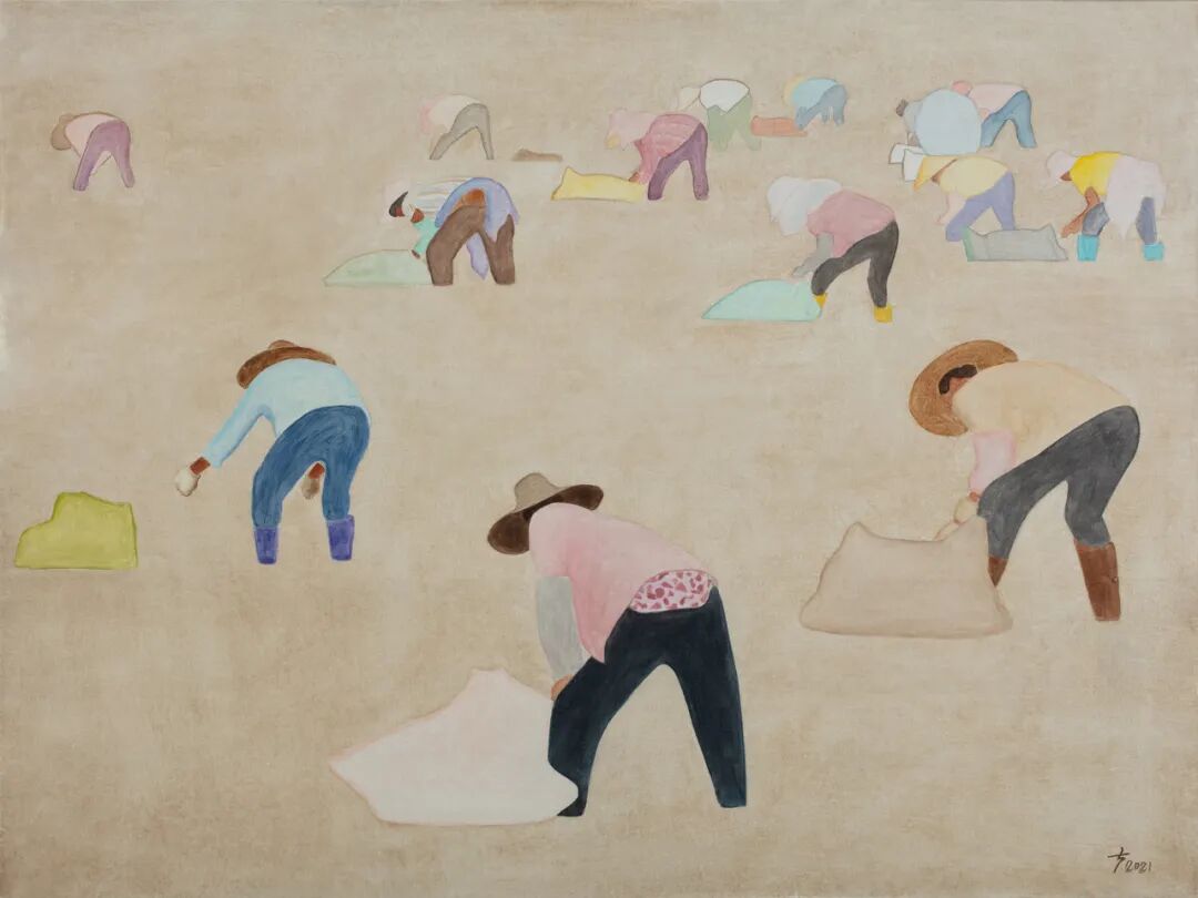 刘声是一位很关照现实的画家,他行走在珠三角,观察并记录着周围的人与物、人与人以及人与村,他们的模样、他们的关系,他们的变化。刘声通常会拍摄下周围的景象再作画,力求最大限度地还原大时代背景下社会的变迁。