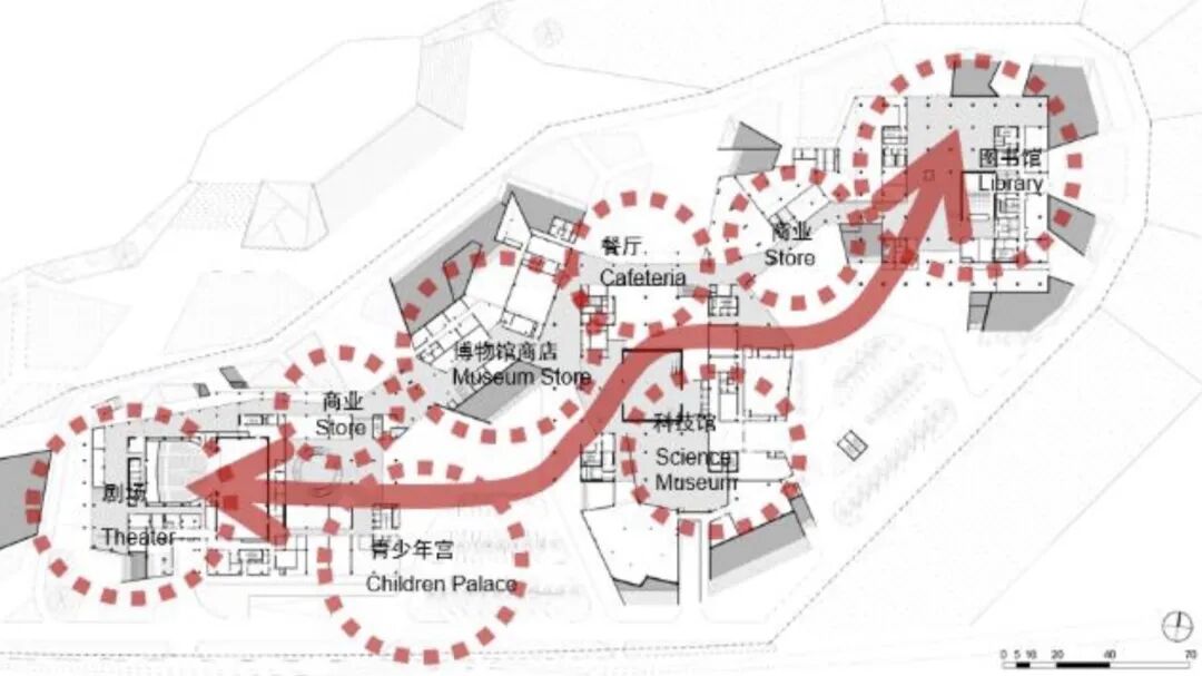 中国科技馆(下图)是一个体量简单、以封闭展厅为主的建筑,但在低层贯通了一个开放的城市空间廊道,汇集了电影娱乐、餐饮休闲、文创购物等商业性的公共服务功能 。相对于把一个寓教于乐的科普机构扩展成为主题城市生活场所的目标,这些内容不是附属性的,而是基础性的。