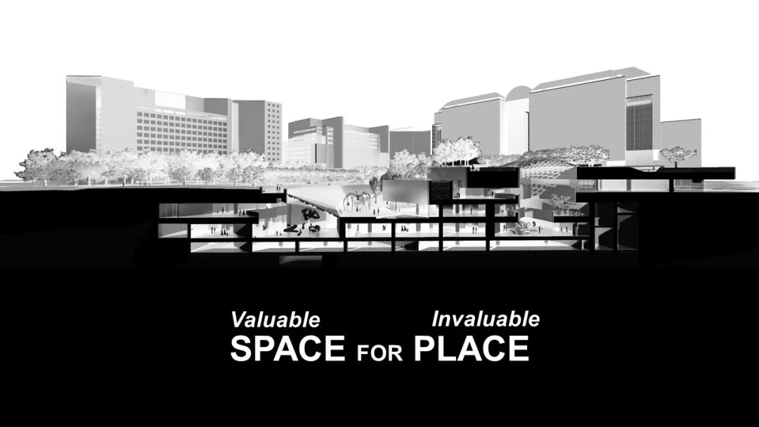设计的回应是构建大众空间和政治空间、地上空间和地下空间、园林空间和商业空间之间的有机关联,也就是“共生”。这即是针对这个项目的策略,也是对一个基本问题的认知。共生(Symbiosis)不是简单的物理性的混合(Mix),也有别于生物性的杂交(Hybrid),而是生态性的依存,不取消个体的存在,而重在关系的建构。最大量应用这些概念的是前述的城市综合体(Mixed-use),过去叫做商业综合体,前者更名正言顺,后者更实事求是。虽然混合功能早已成为成熟的开发模式,我们从设计理念和方法角度可能还远没有理解它的全部意义。