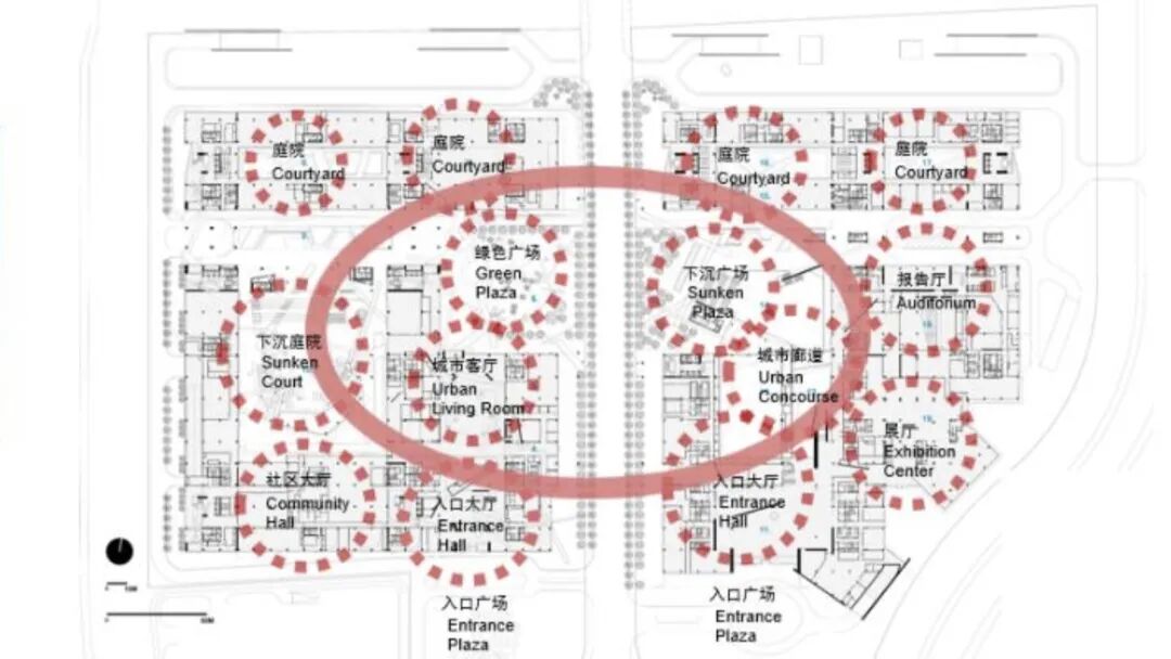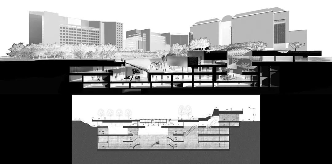 空间的开放是交互和互利的。地下商业让渡内部空间的同时,也向外辐射内部功能,共享城市空间。所有的景观空间同时也是活动场所,为各种可能的商业和公共艺术活动预设场景,搭建舞台。虽然这些在其它地方习以为常的城市生活方式,在这里还带有乌托邦色彩,但是设计要为未来的可能提供基础,做好准备。