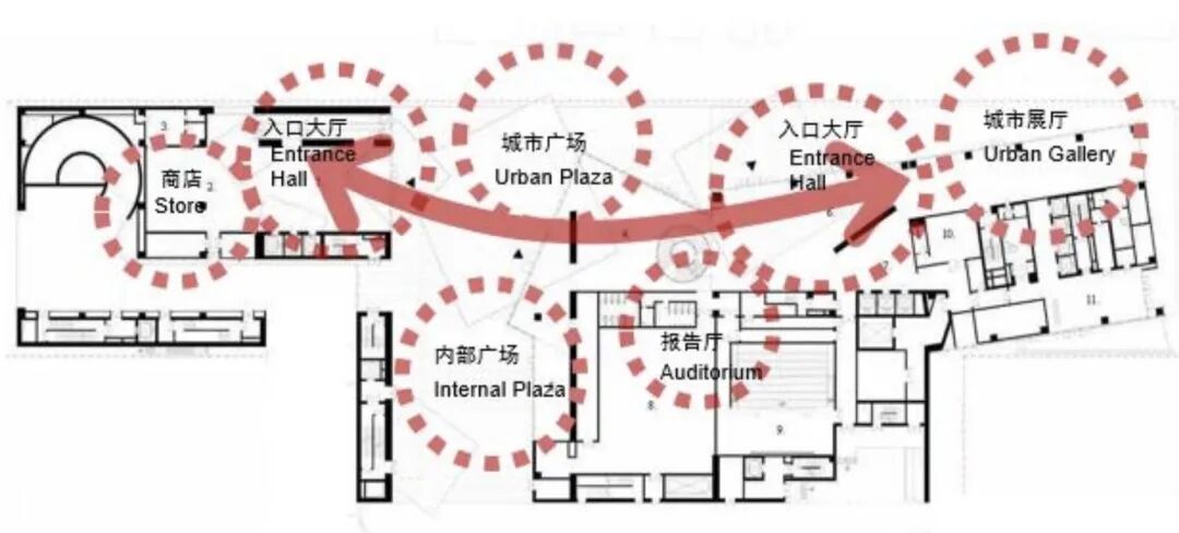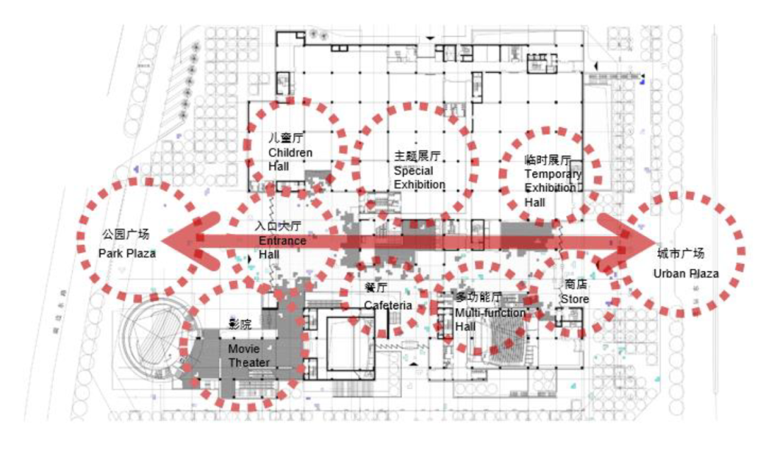 在中国电影博物馆(下图),同样可以看到一个附带多种娱乐和商业功能的开放空间系统,贯通并激活封闭的内部空间,为其注入城市的活力。