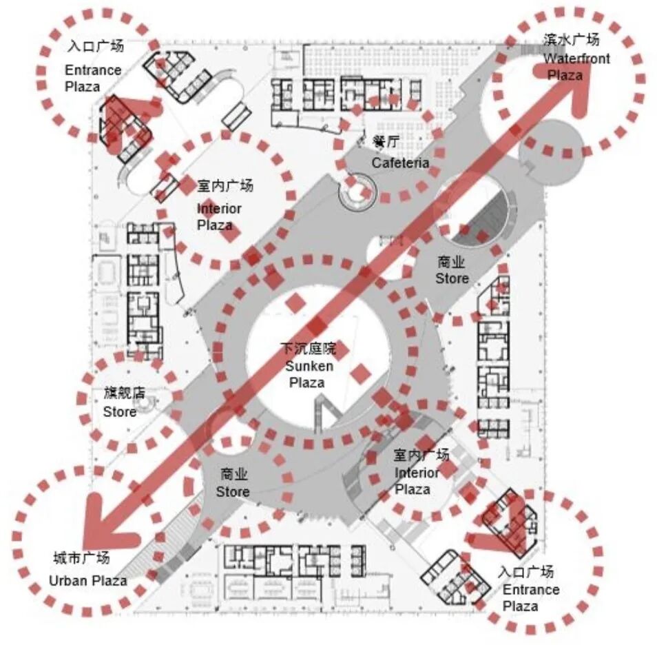 依靠关系图(Diagram)的设计方法具有代表性,其中最重要的内容是动线,聚焦在联接和流动,这也是商业建筑最接近规划和城市设计的地方。相对于商业地产Location, Location, Location的三大法则,商业建筑设计的传统法宝是Diagram, Diagram, Diagram,关注的都是基本关系,形式问题并不在优先考虑之列。新生的商业生态可能带来不同的认识,但遵从商业逻辑和行为规律、保证结构合理仍然是底层的设计原则。