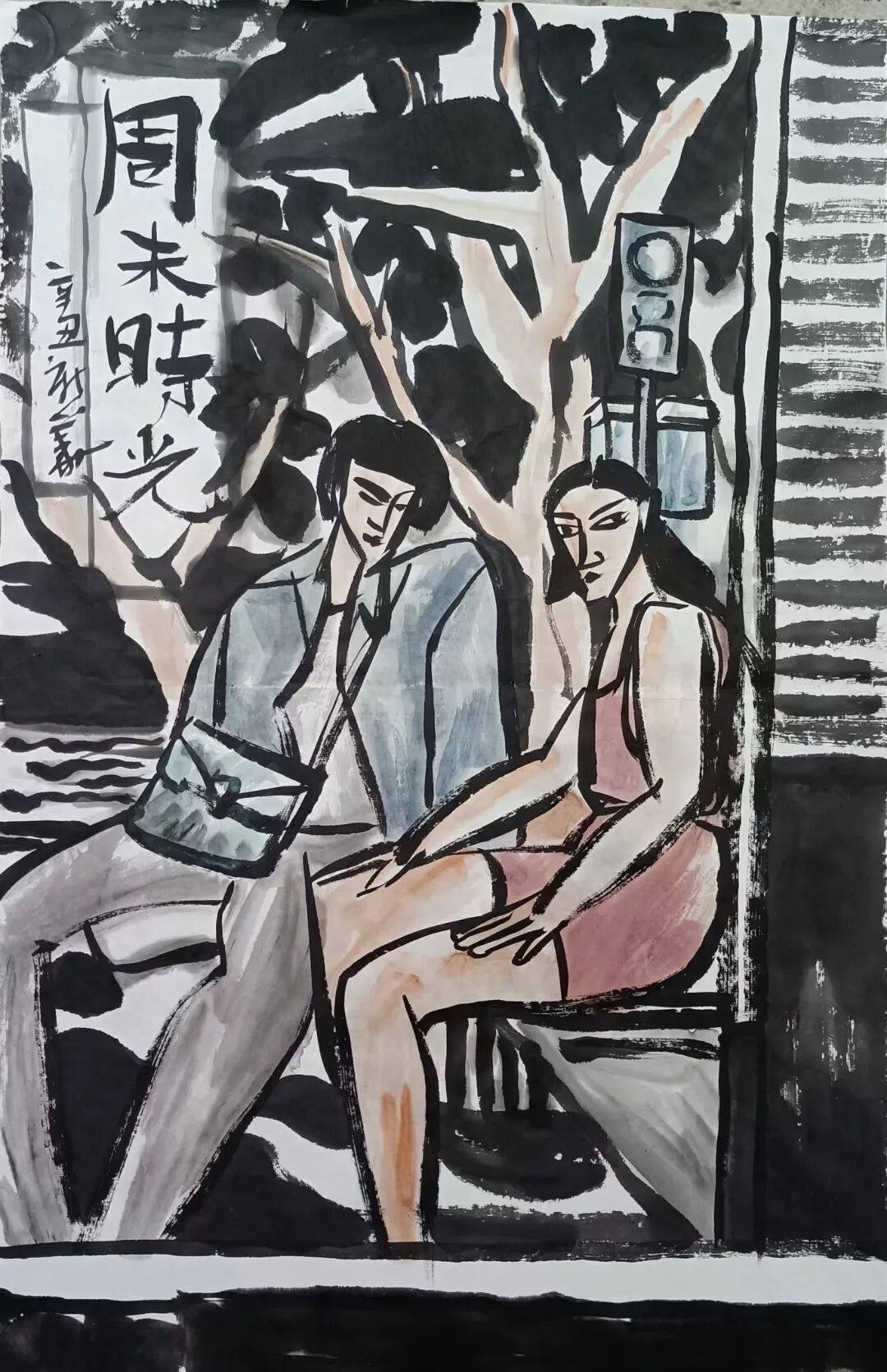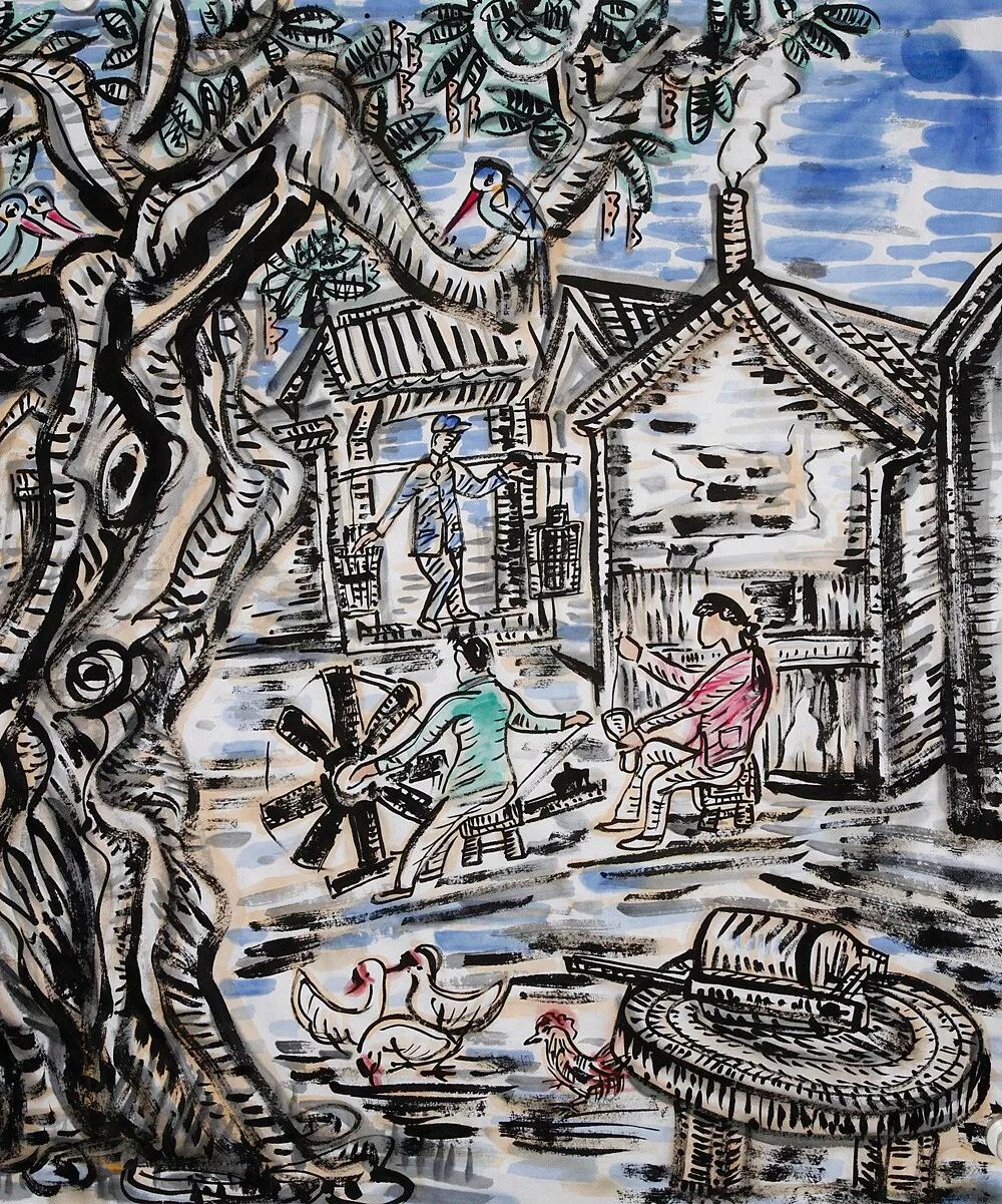 他的造型上仿佛着剪纸、石刻、戏剧、年画、民间艺术甚至儿童画的痕迹。笔下的人物敦厚稚拙,鲜活生猛,他说他喜欢精神上原始纯朴野性,但画面要新鲜清新,喜欢小鲜肉,不能总是以老气横秋示人,像个油腻老男人。他打破了传统笔墨的造型样态,着力构建全新的审美样式。