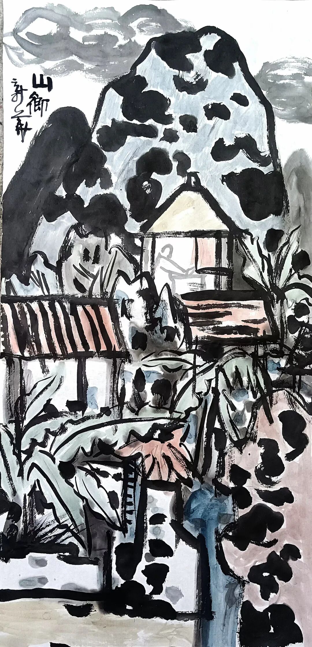 他喜欢用毛笔画画,也不分什么中国画水墨画。只是用毛笔画。他不刻意什么笔法书法,他说他是业余的,只专注笔尖,守住笔尖在纸上的感觉。笔尖在他心底游走,从他笔尖游动的线,不断地生长延展,把时空串起来,把人和物联起来,也把山河大地虚空粉碎、打成一盘散沙……