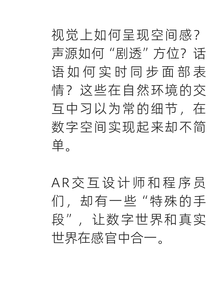 利用AR眼镜上的多个麦克风采集音频,并通过分析用户的头部运动,来判断当前人物处于空间的位置,实现数字世界的秩序感。