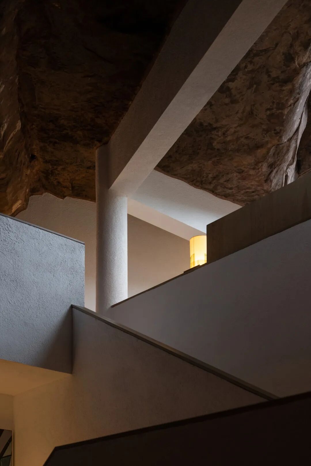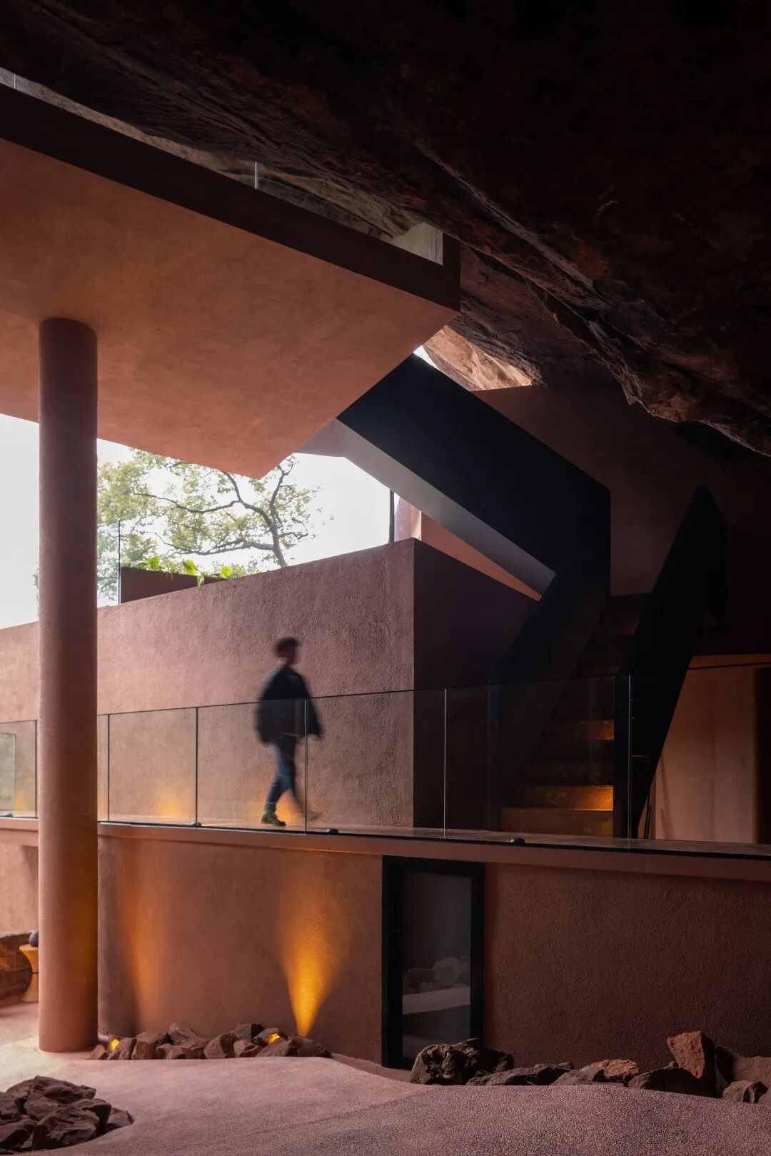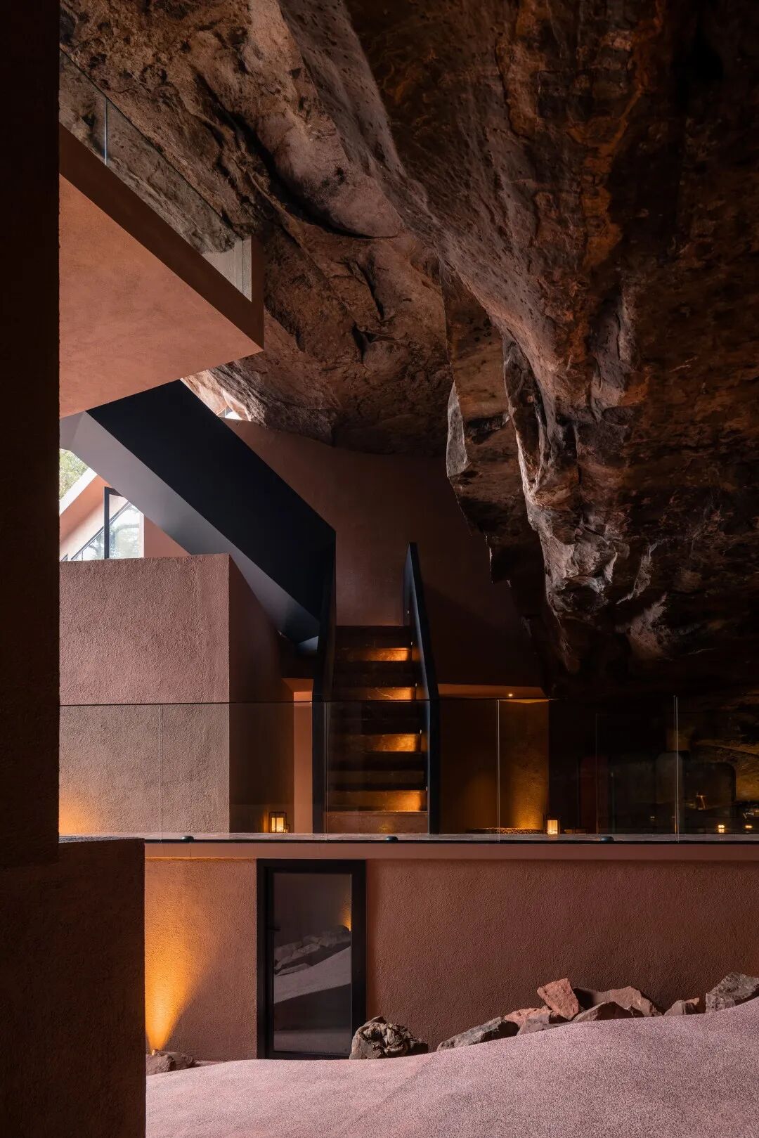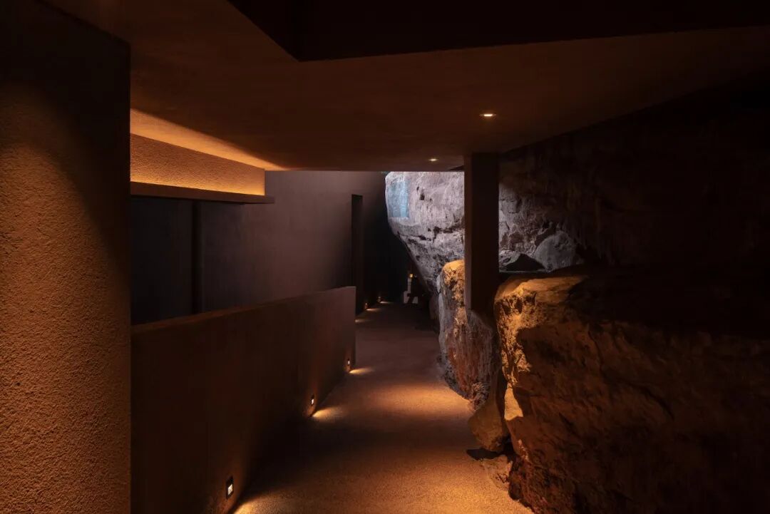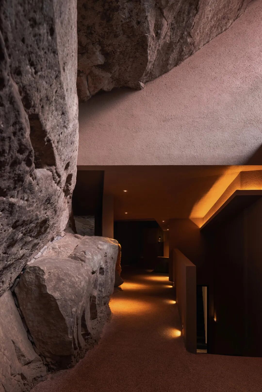 客房区域自然的洞穴岩壁与现代建筑进行对话,两者协调地融合,打破千篇一律的建筑感觉。通过凹凸不平富有肌理的触感,形成了一个围合的空间,让体验者能与岩石有亲密独特的接触。当置身其中,会迫不及待地探索空间的角落。