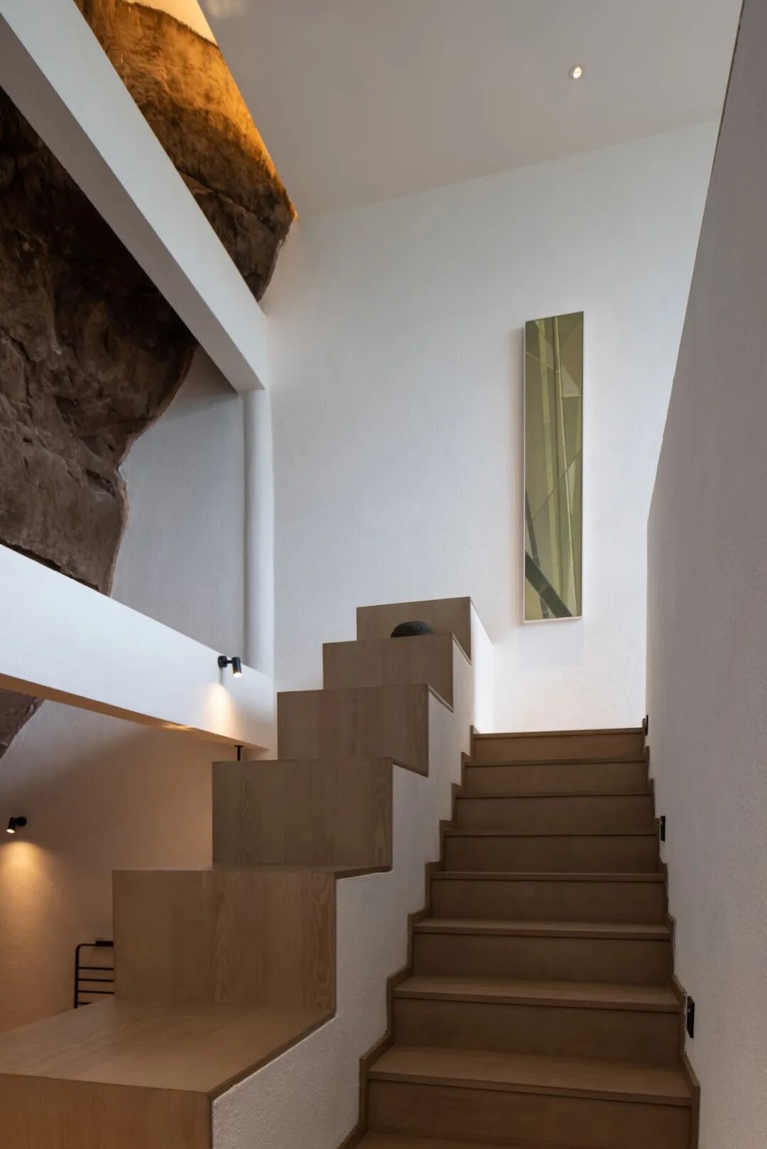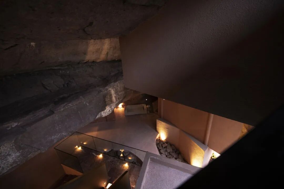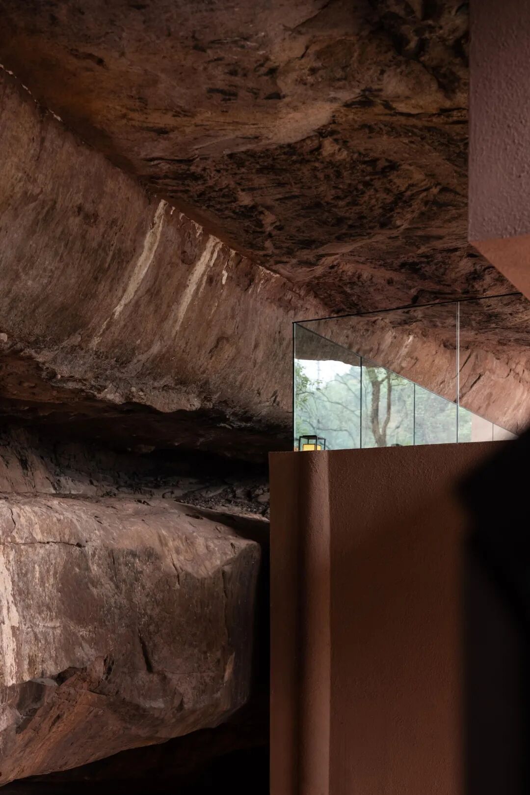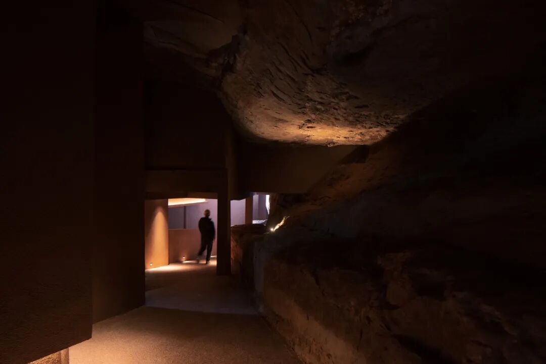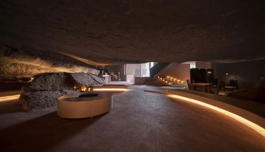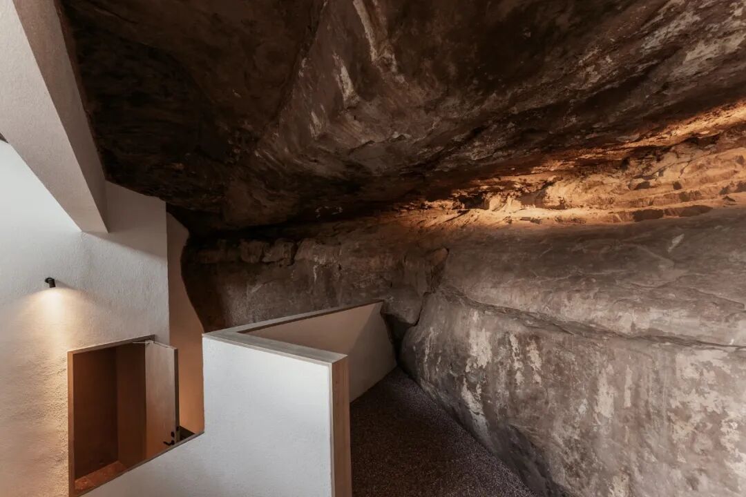 客房区域自然的洞穴岩壁与现代建筑进行对话,两者协调地融合,打破千篇一律的建筑感觉。通过凹凸不平富有肌理的触感,形成了一个围合的空间,让体验者能与岩石有亲密独特的接触。当置身其中,会迫不及待地探索空间的角落。
