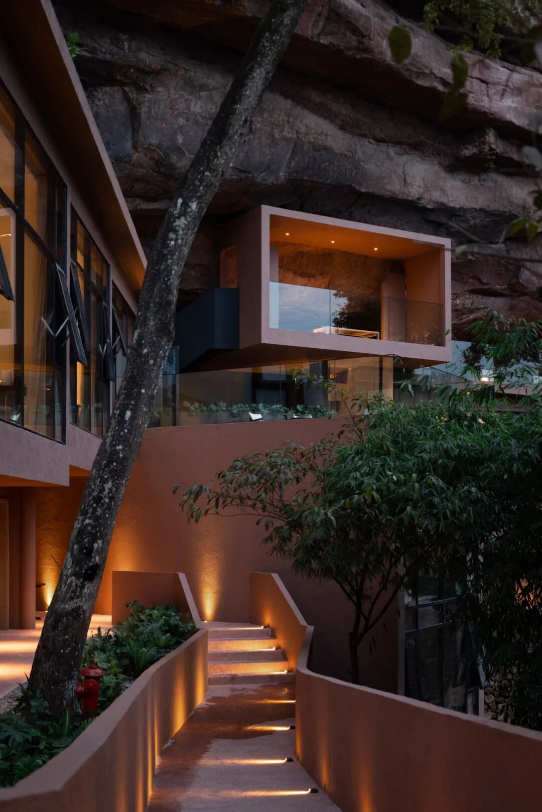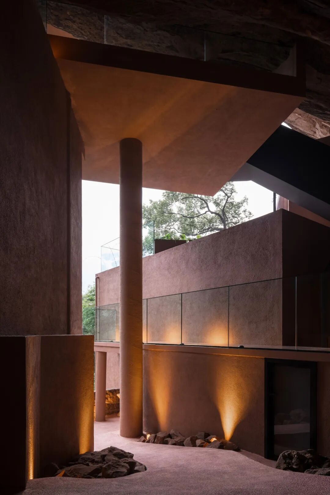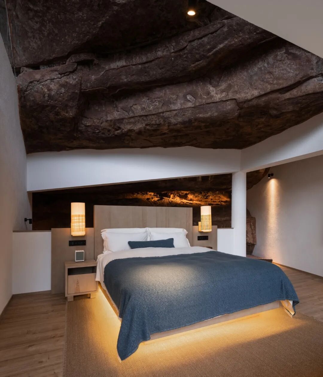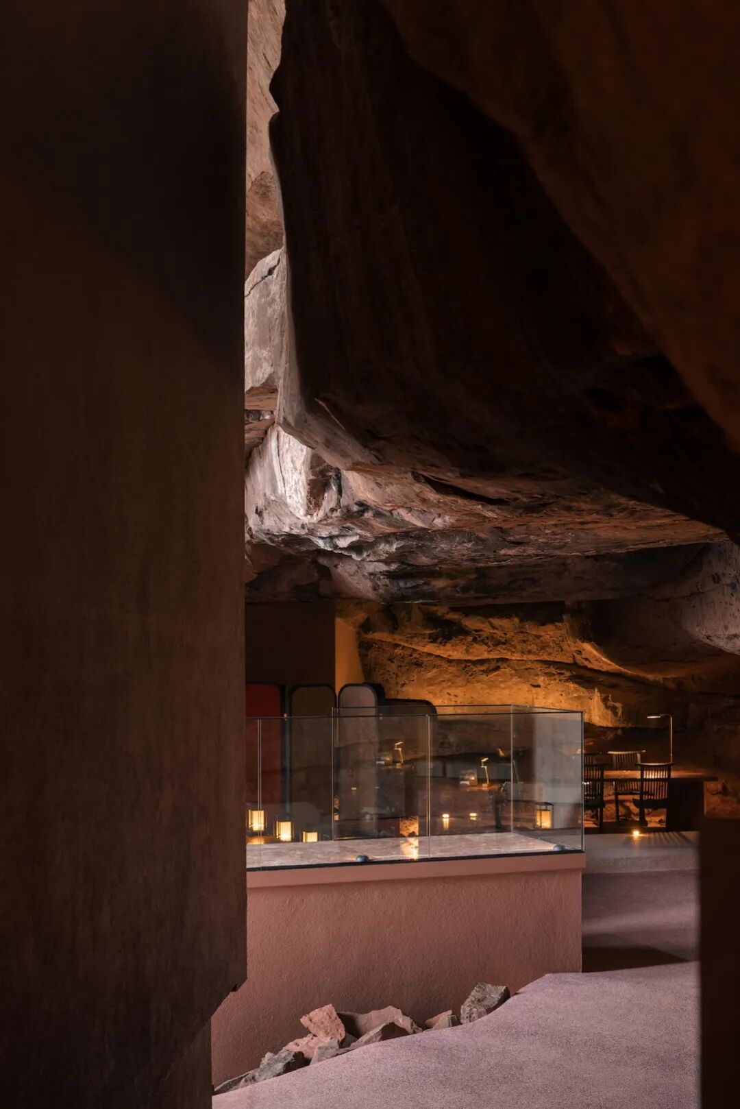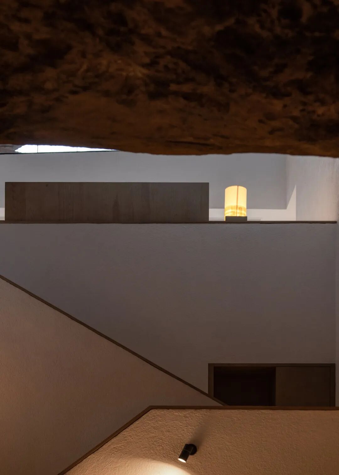客房区域自然的洞穴岩壁与现代建筑进行对话,两者协调地融合,打破千篇一律的建筑感觉。通过凹凸不平富有肌理的触感,形成了一个围合的空间,让体验者能与岩石有亲密独特的接触。当置身其中,会迫不及待地探索空间的角落。