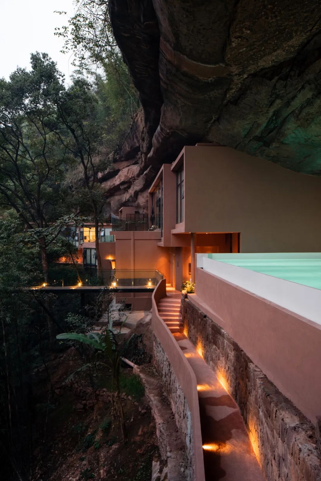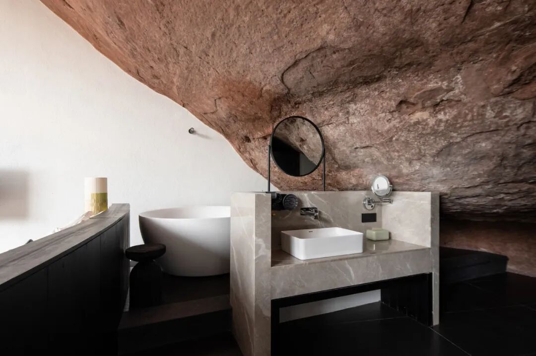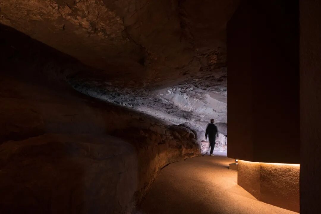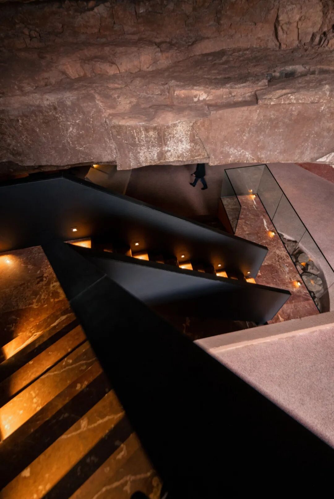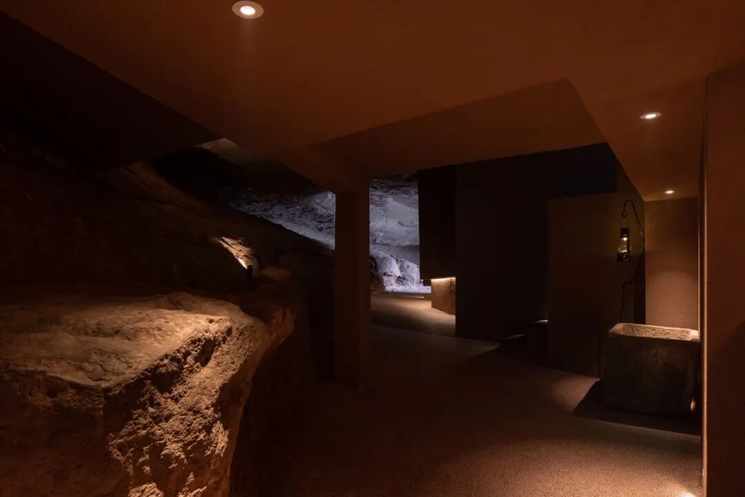 客房区域自然的洞穴岩壁与现代建筑进行对话,两者协调地融合,打破千篇一律的建筑感觉。通过凹凸不平富有肌理的触感,形成了一个围合的空间,让体验者能与岩石有亲密独特的接触。当置身其中,会迫不及待地探索空间的角落。