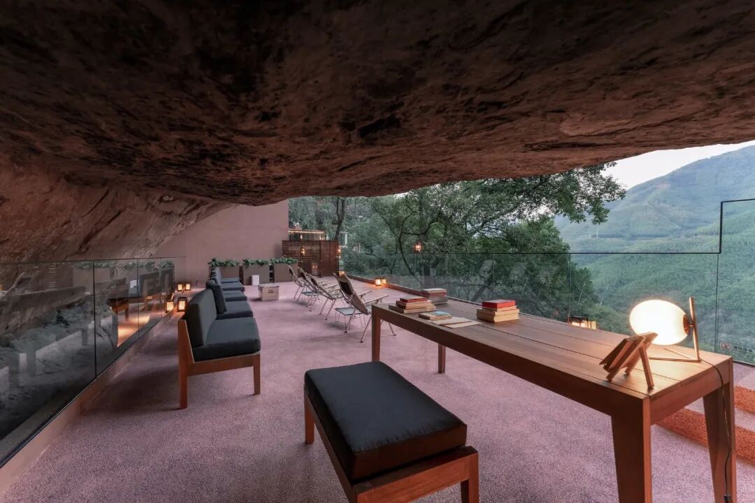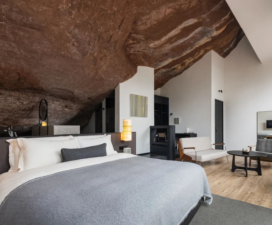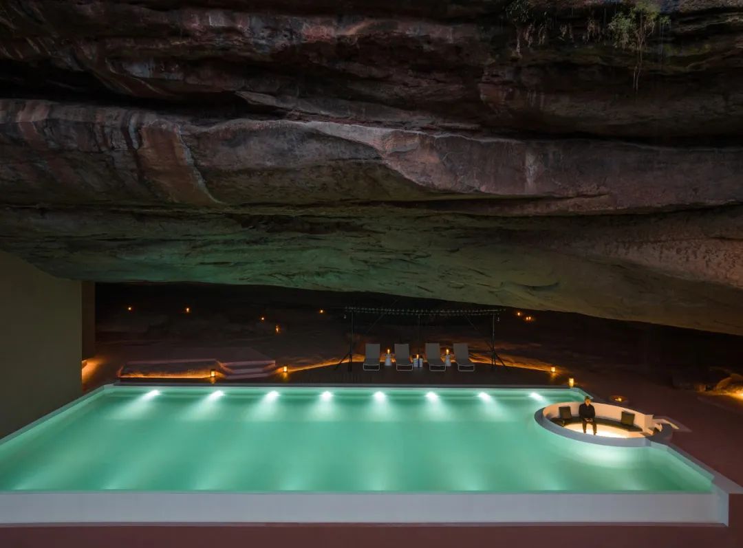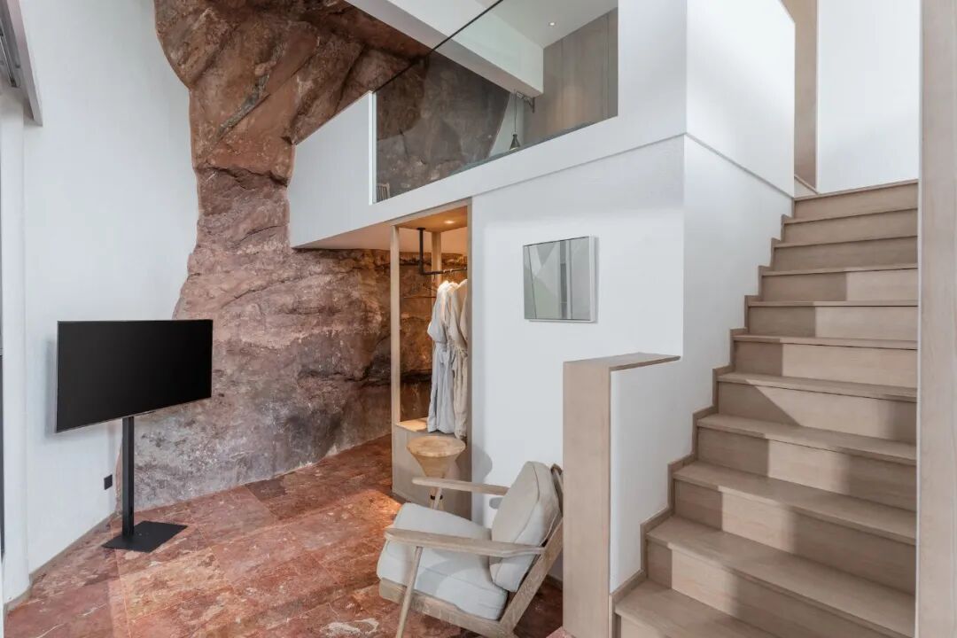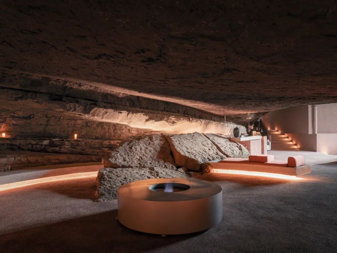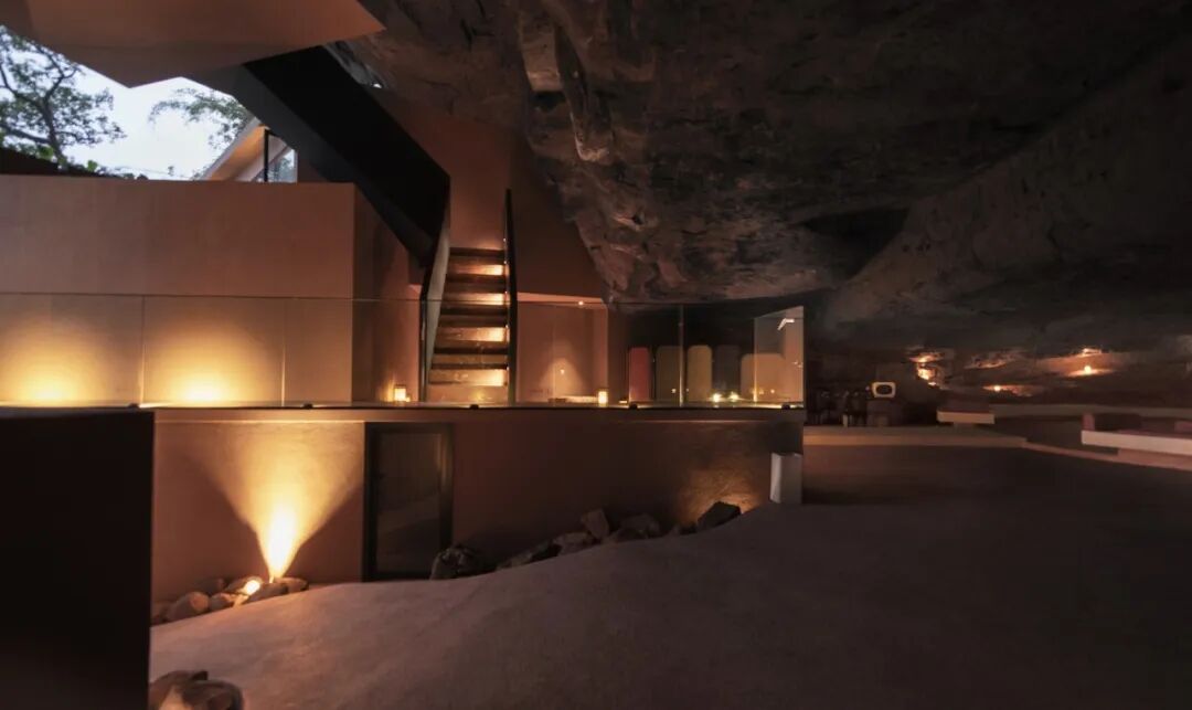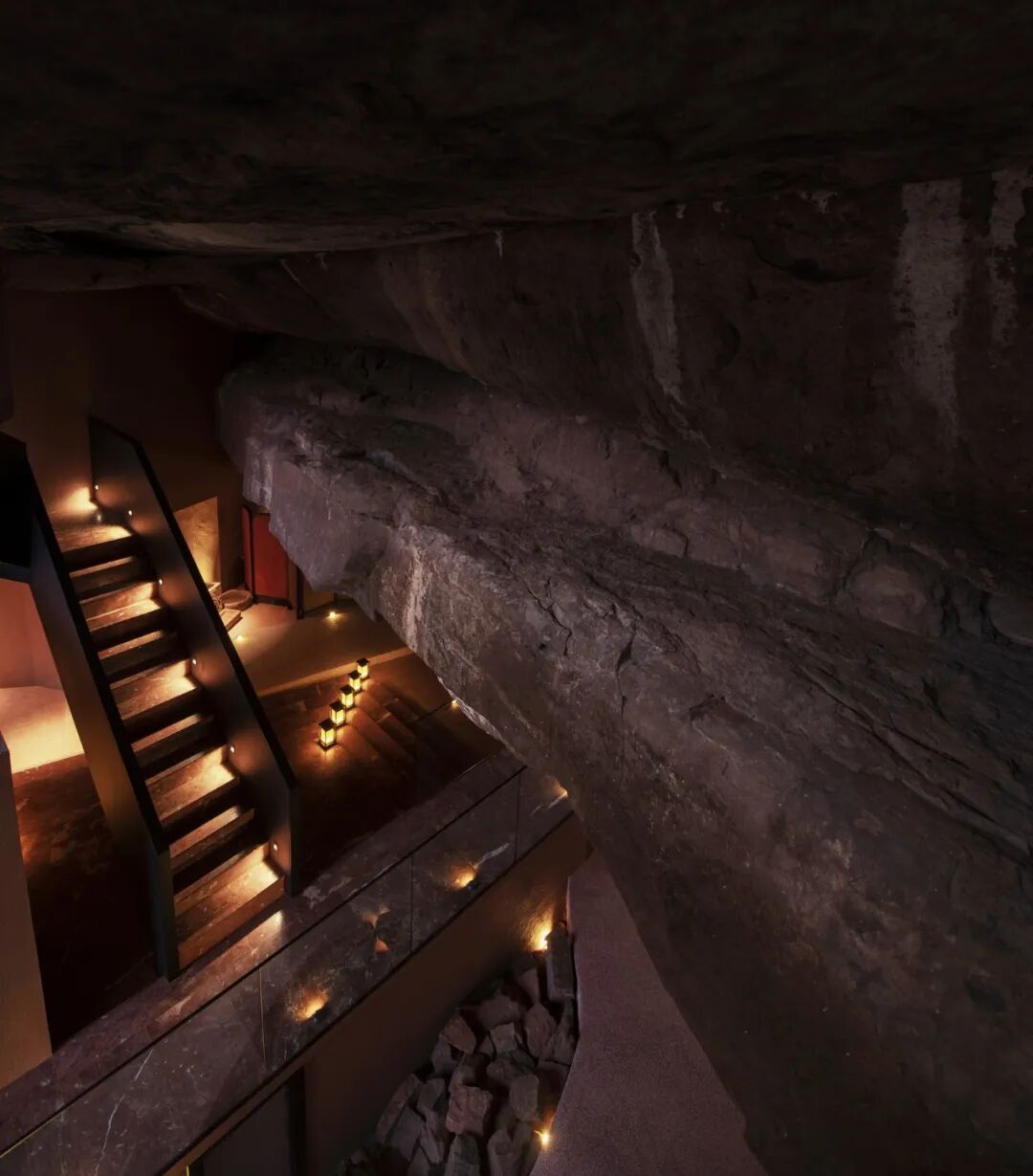 客房区域自然的洞穴岩壁与现代建筑进行对话,两者协调地融合,打破千篇一律的建筑感觉。通过凹凸不平富有肌理的触感,形成了一个围合的空间,让体验者能与岩石有亲密独特的接触。当置身其中,会迫不及待地探索空间的角落。