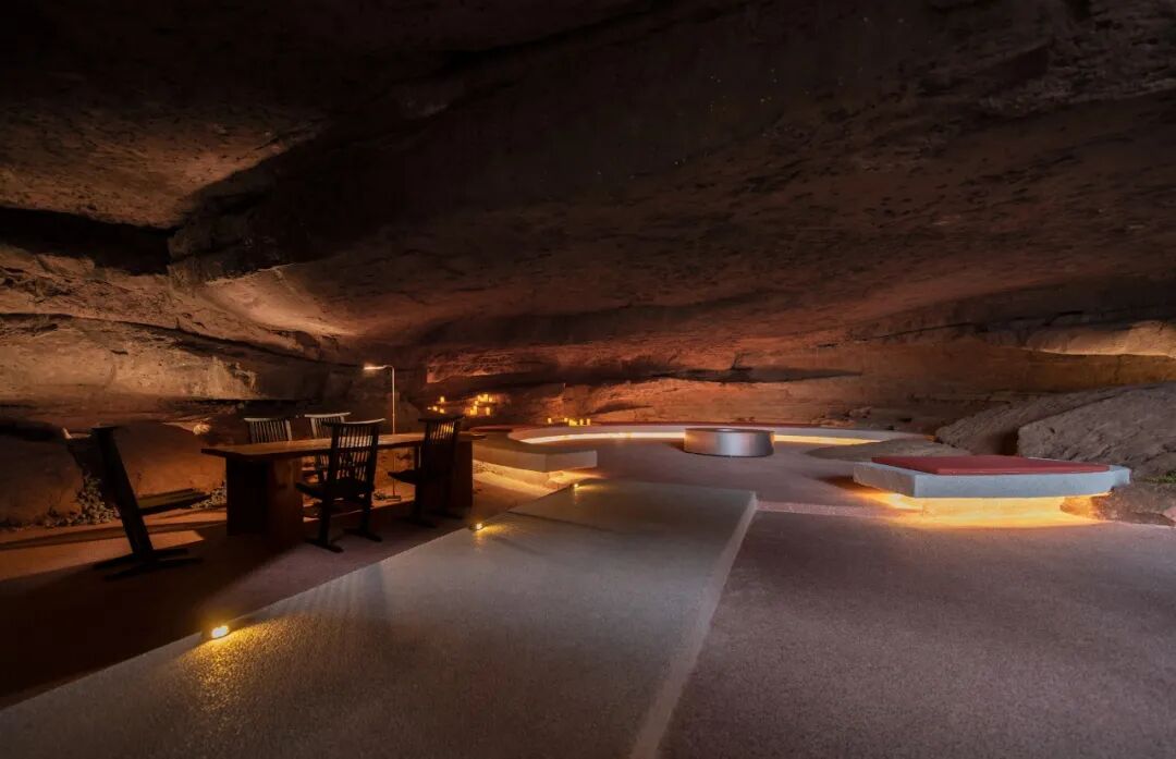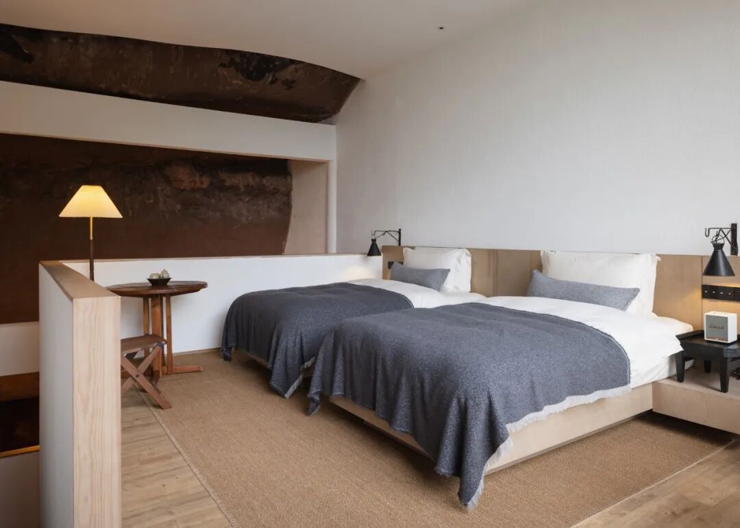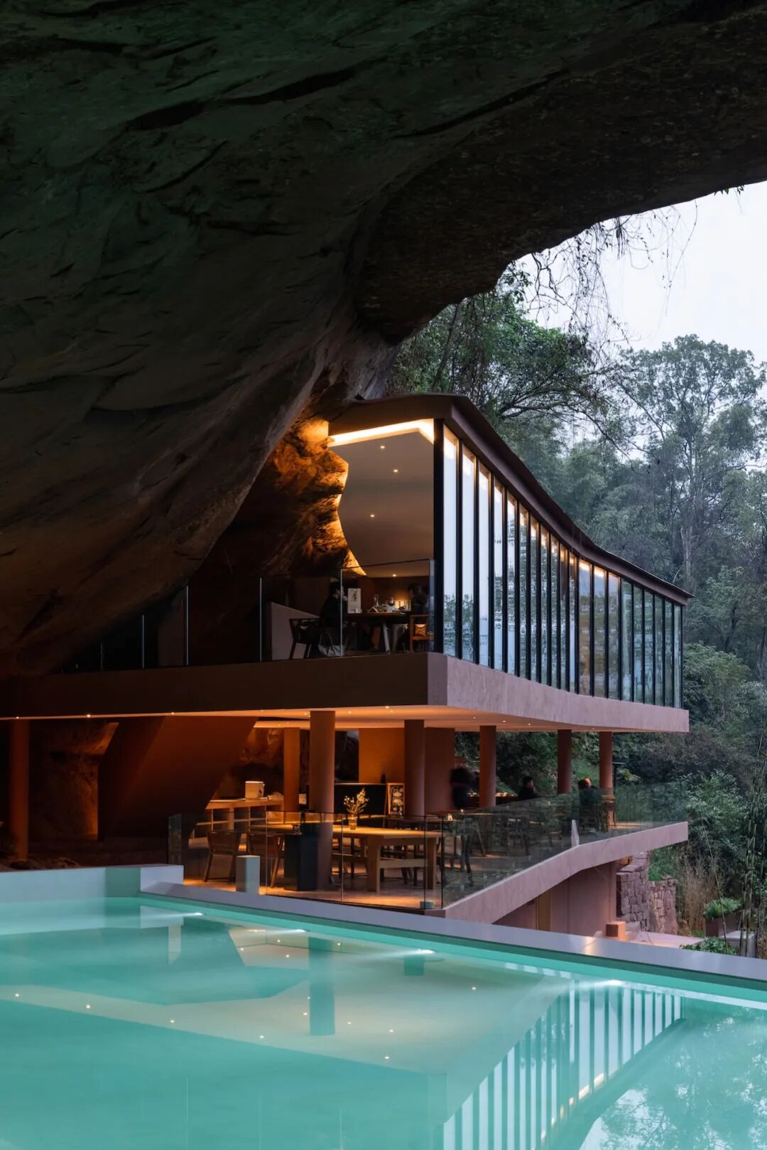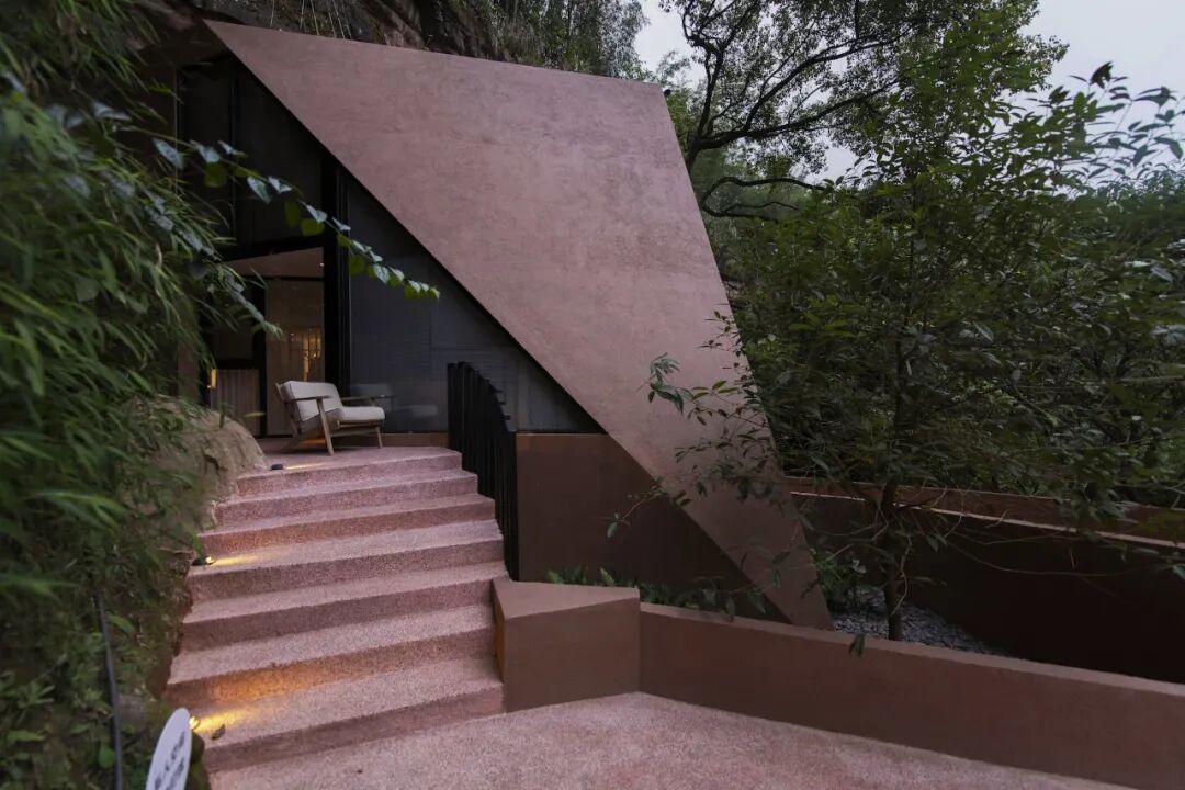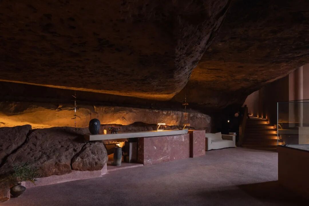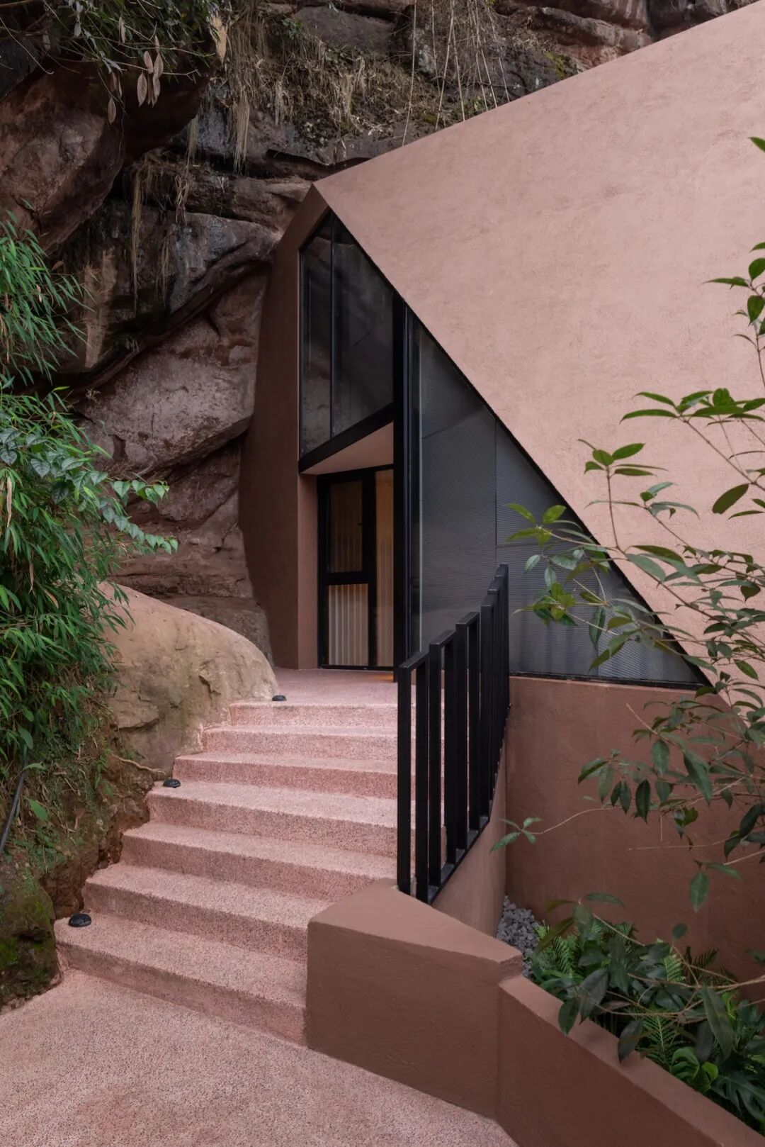 客房区域自然的洞穴岩壁与现代建筑进行对话,两者协调地融合,打破千篇一律的建筑感觉。通过凹凸不平富有肌理的触感,形成了一个围合的空间,让体验者能与岩石有亲密独特的接触。当置身其中,会迫不及待地探索空间的角落。