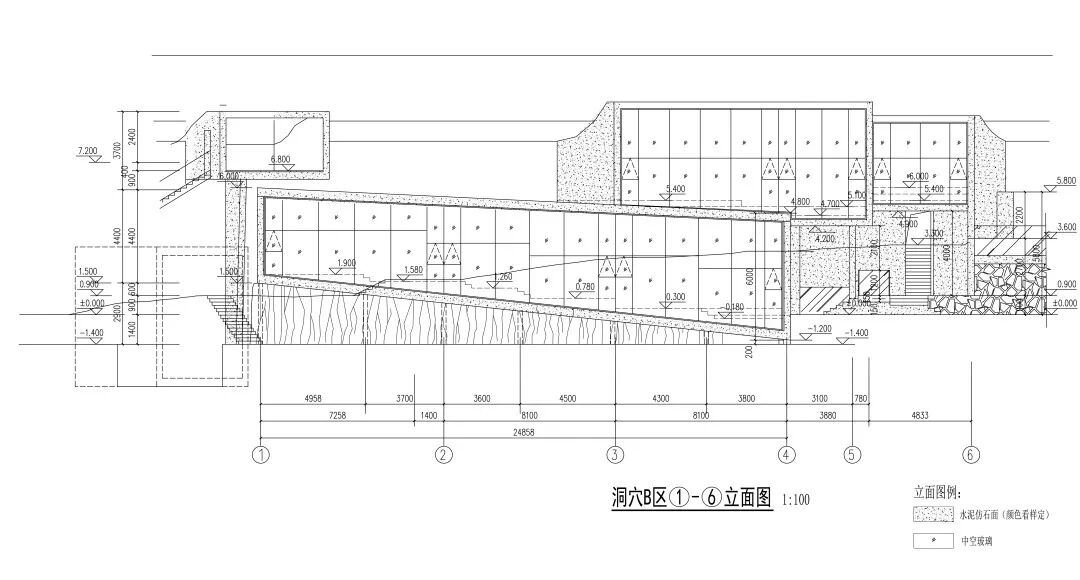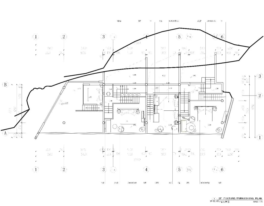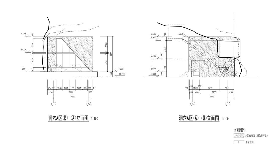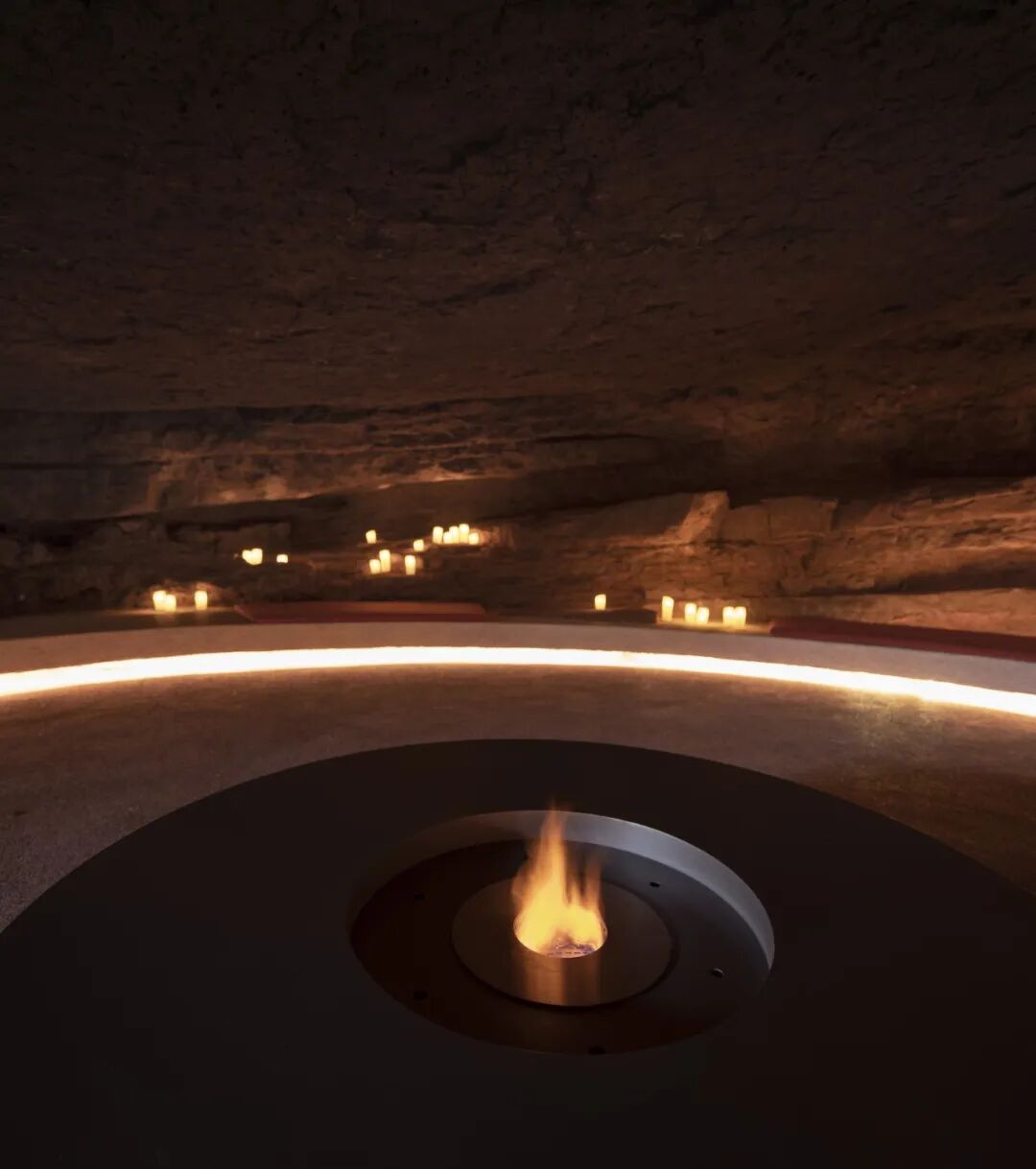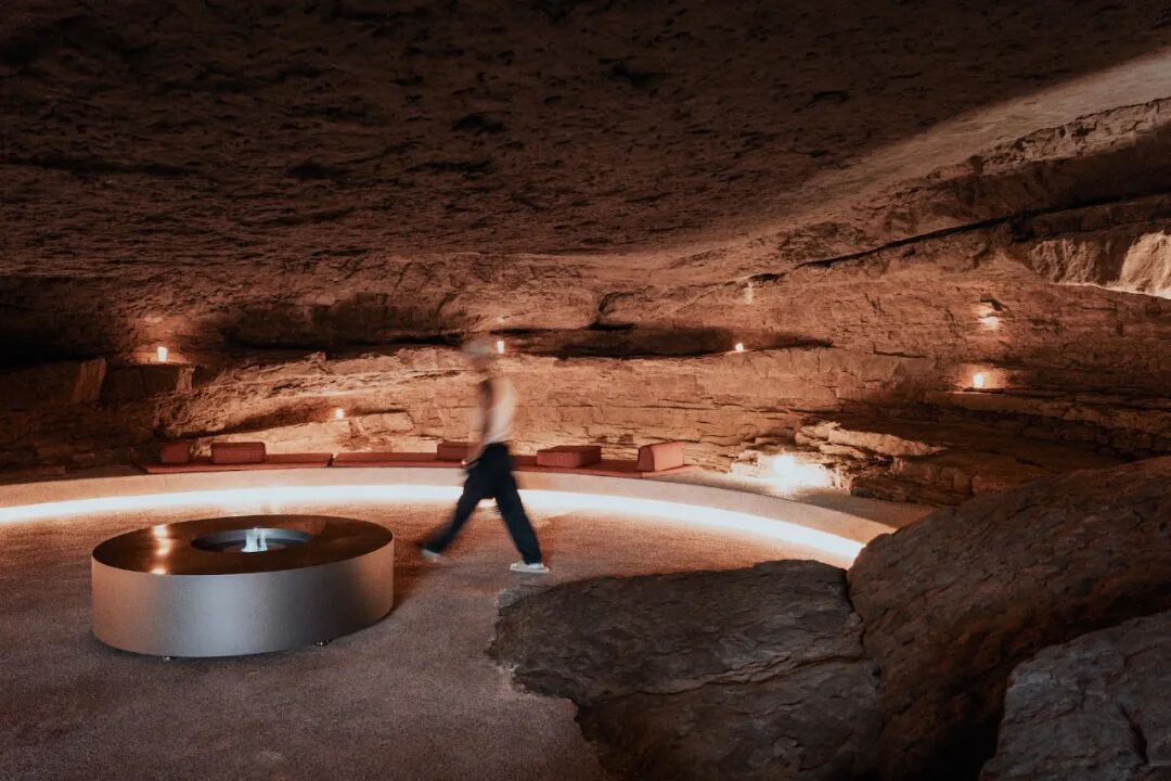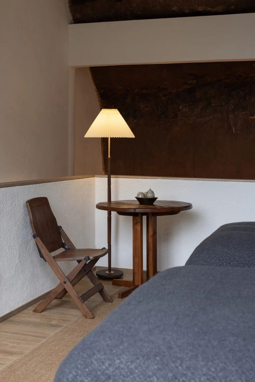 客房区域自然的洞穴岩壁与现代建筑进行对话,两者协调地融合,打破千篇一律的建筑感觉。通过凹凸不平富有肌理的触感,形成了一个围合的空间,让体验者能与岩石有亲密独特的接触。当置身其中,会迫不及待地探索空间的角落。