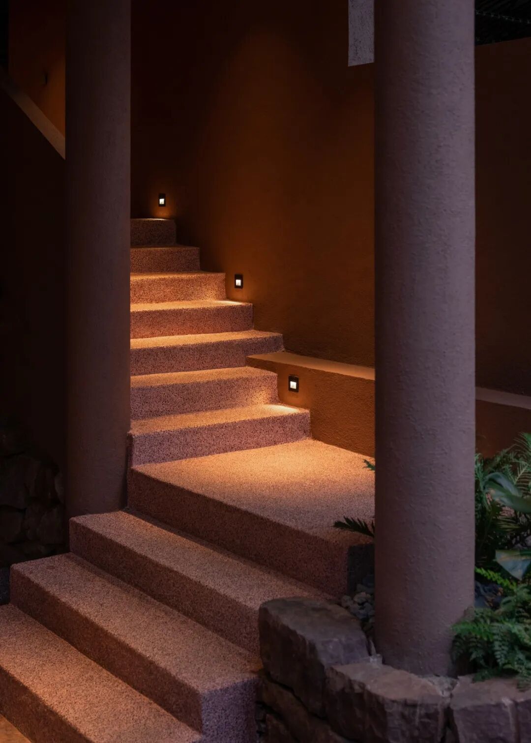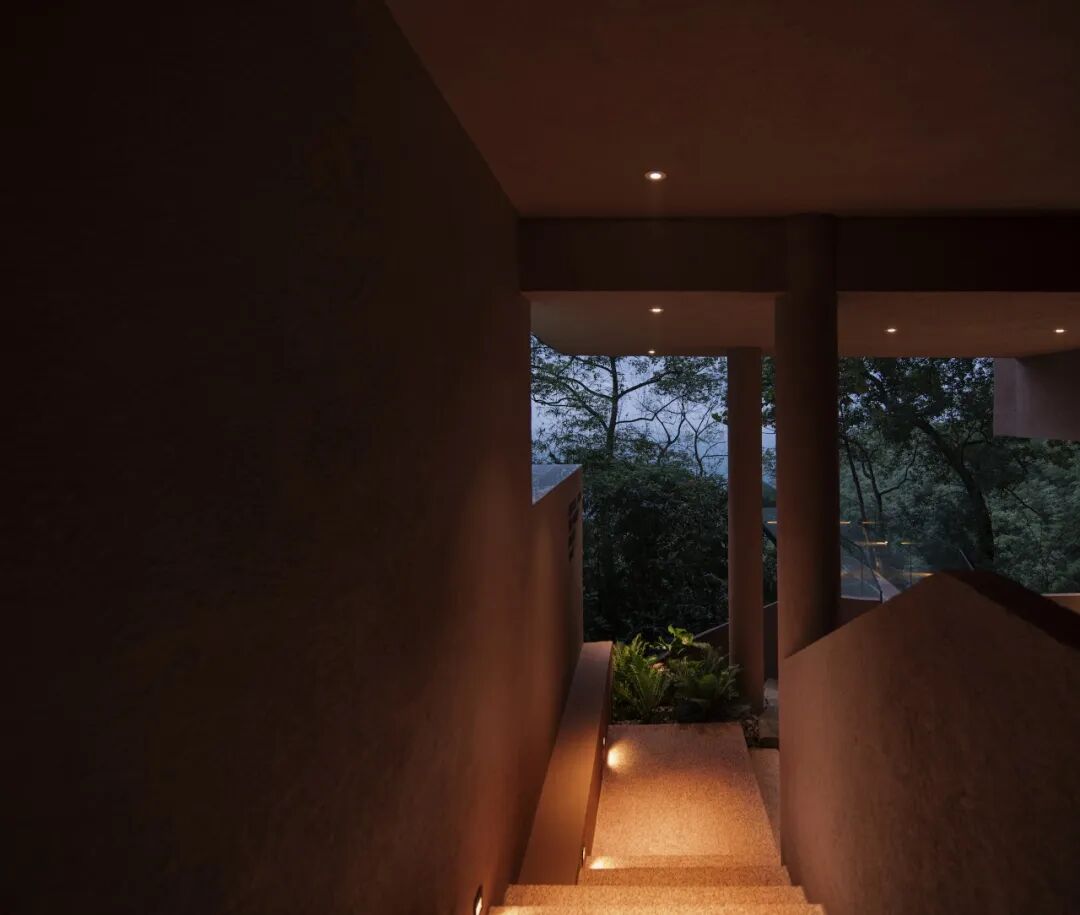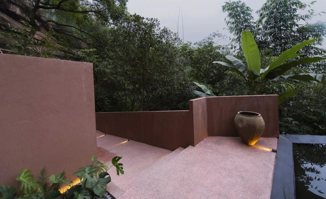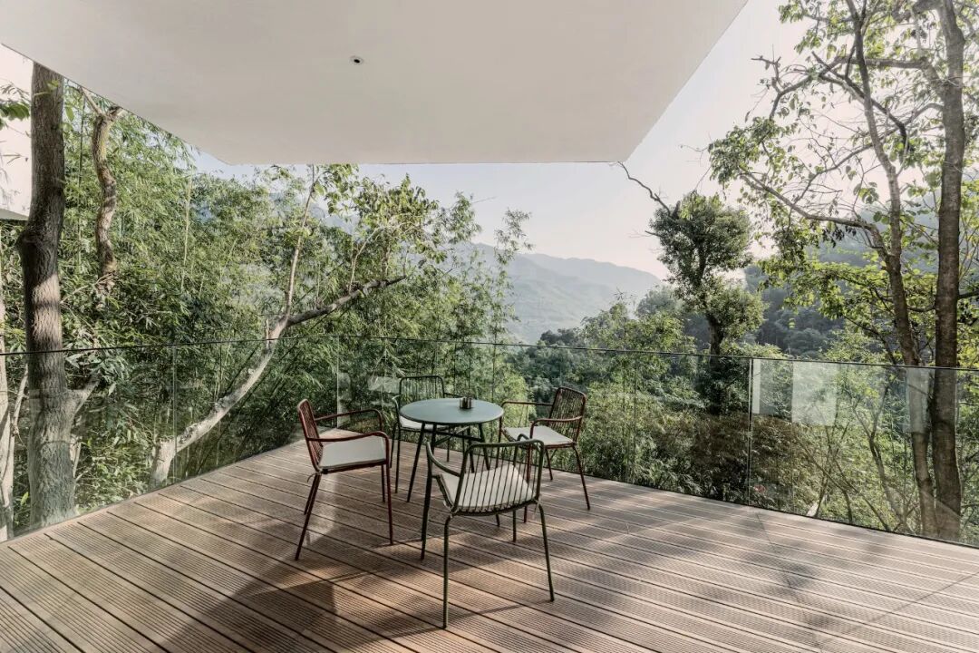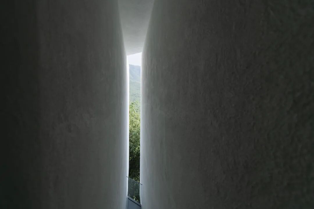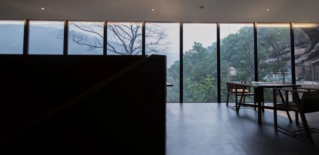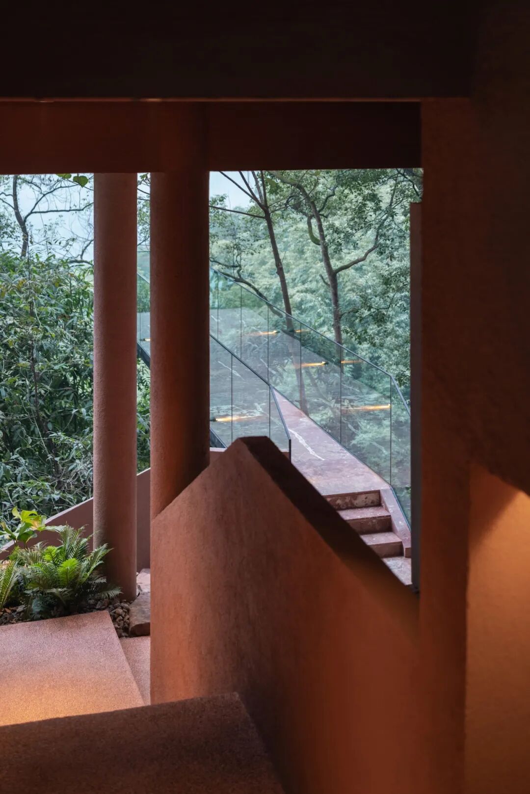 往上一段楼梯可以去往高处的冥想空间,是建筑与岩壁的自然碰撞。有着开阔的视野眺望远处的山与河,俯瞰近处的溪与林。登高望远,自有一番让人冥想的意境……