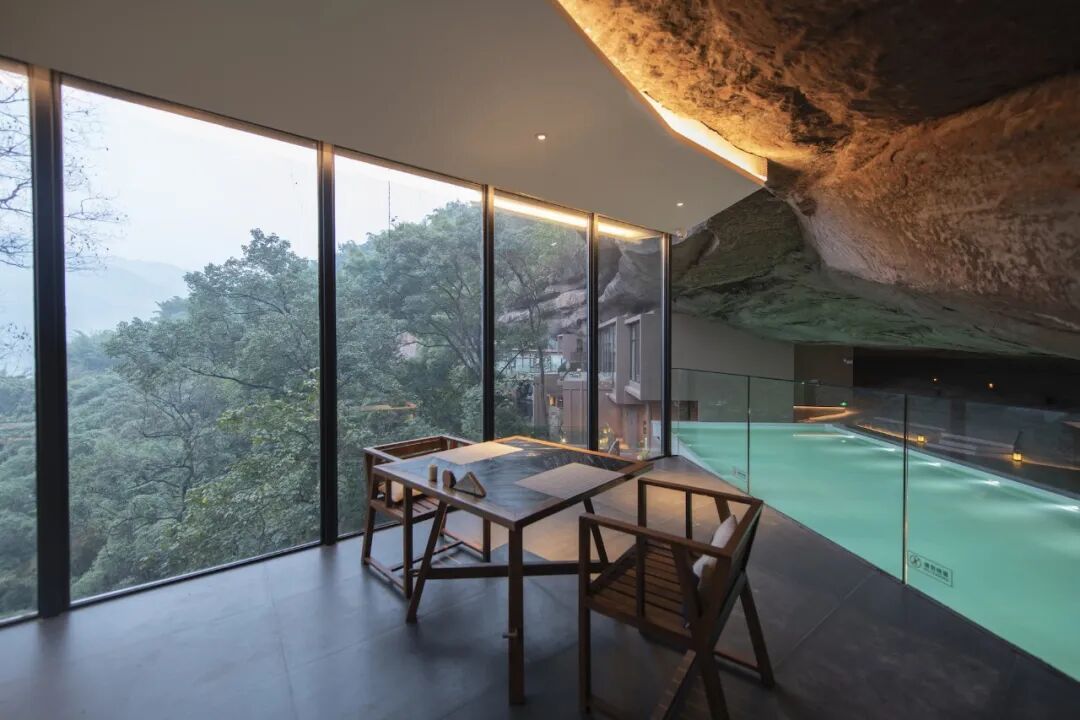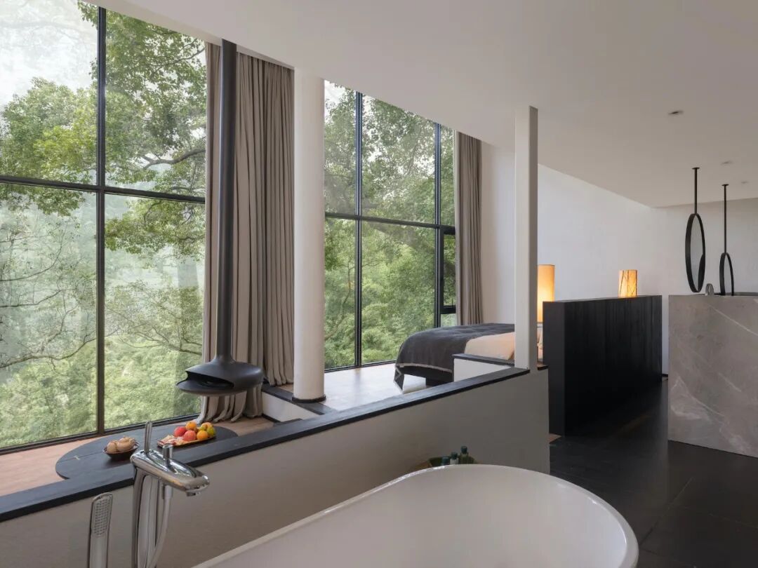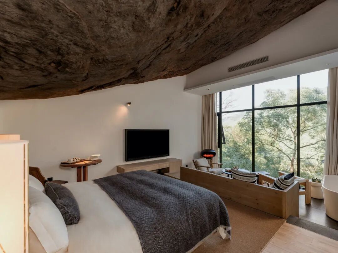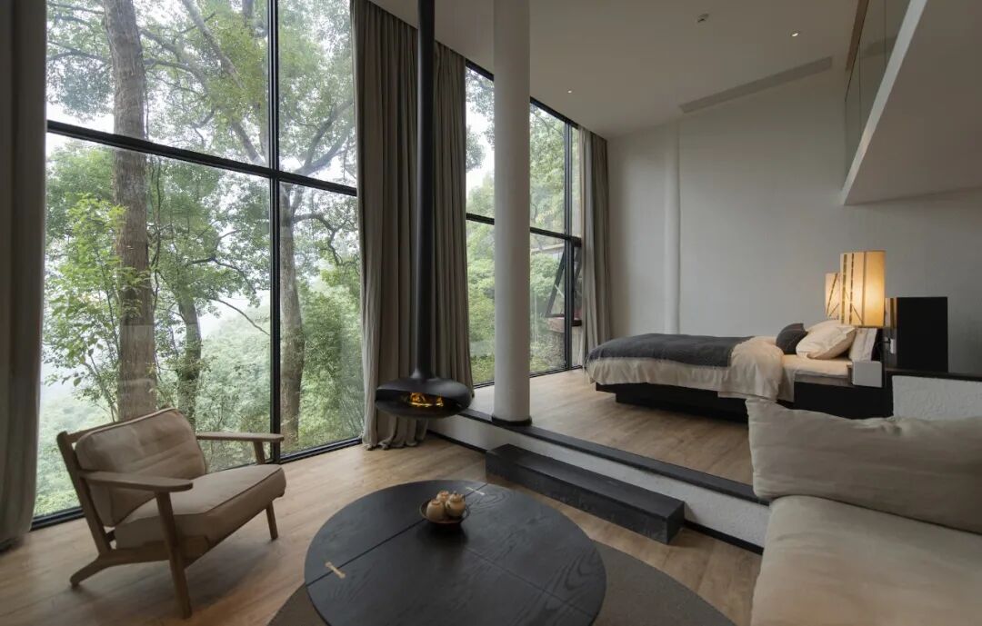 由于岩洞的限制性高差,因此采用错落的解构,将卫生间和水吧放在空间后端,卧室放在前端,跨度大的落地窗连接着露台,让卧室拥有开阔的视野和风景。