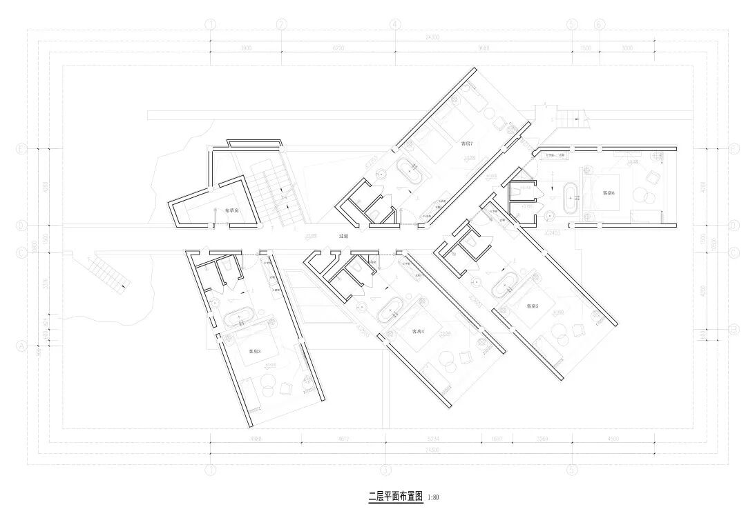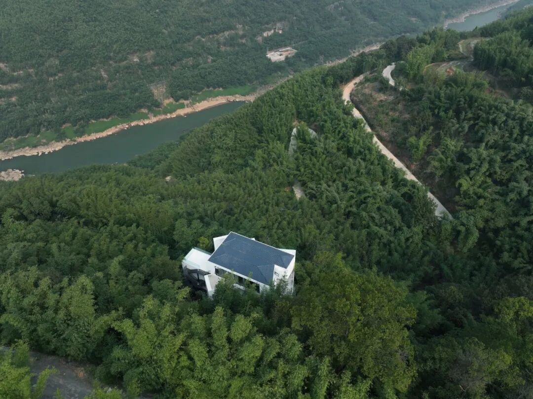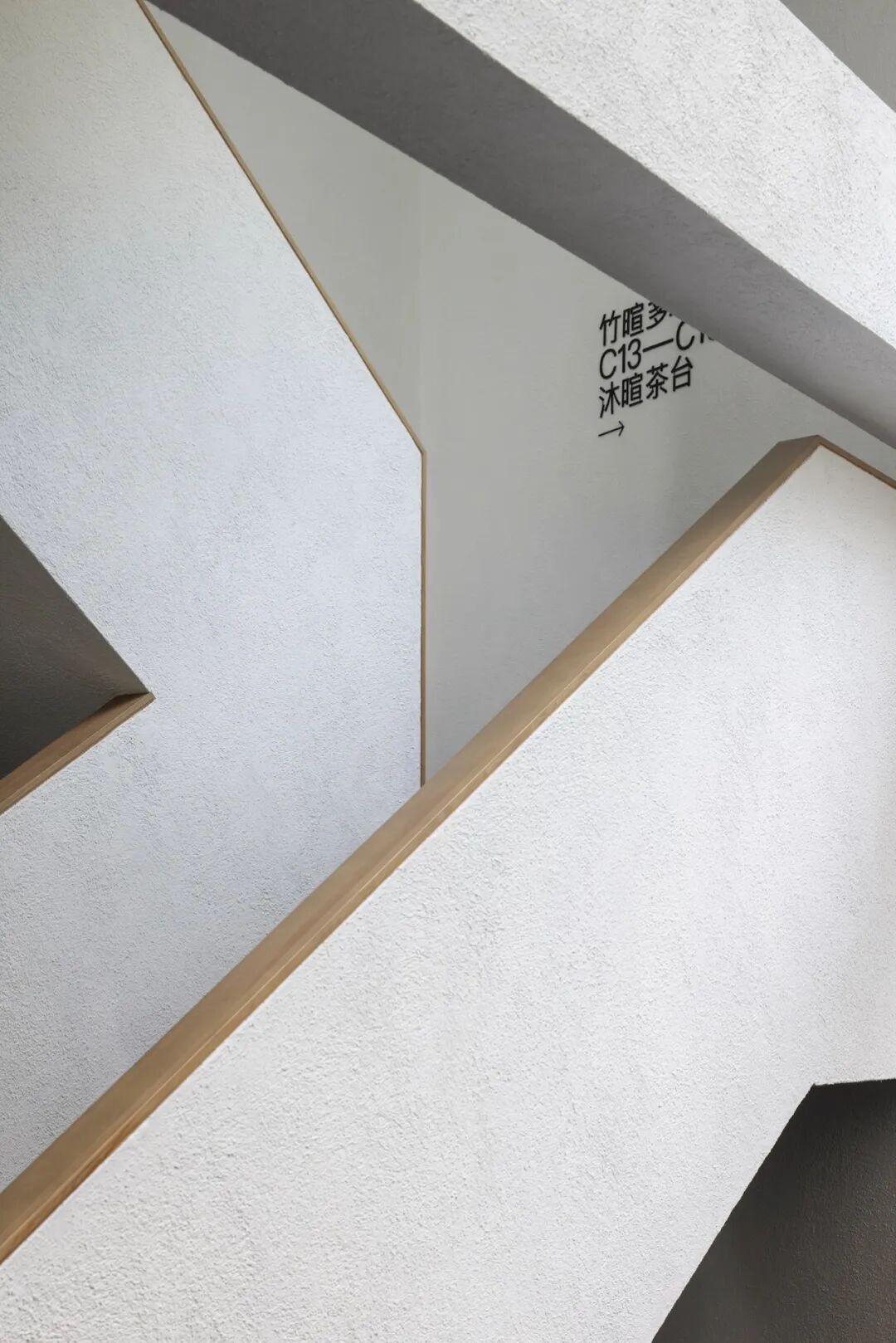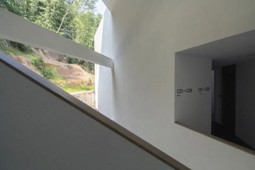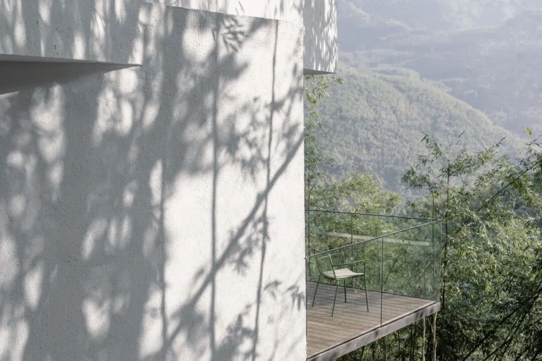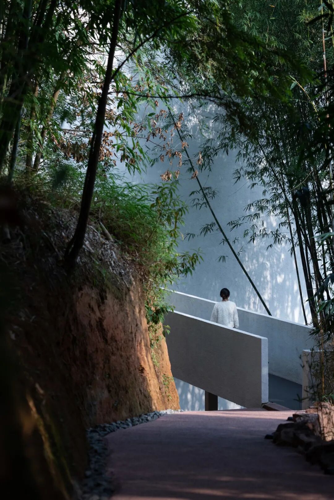 白色建筑外表与竹林形成对比,清新醒目。由于地势因素,考虑到搬运行李的方便性,增加了通往二楼的过道。