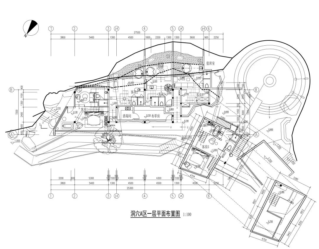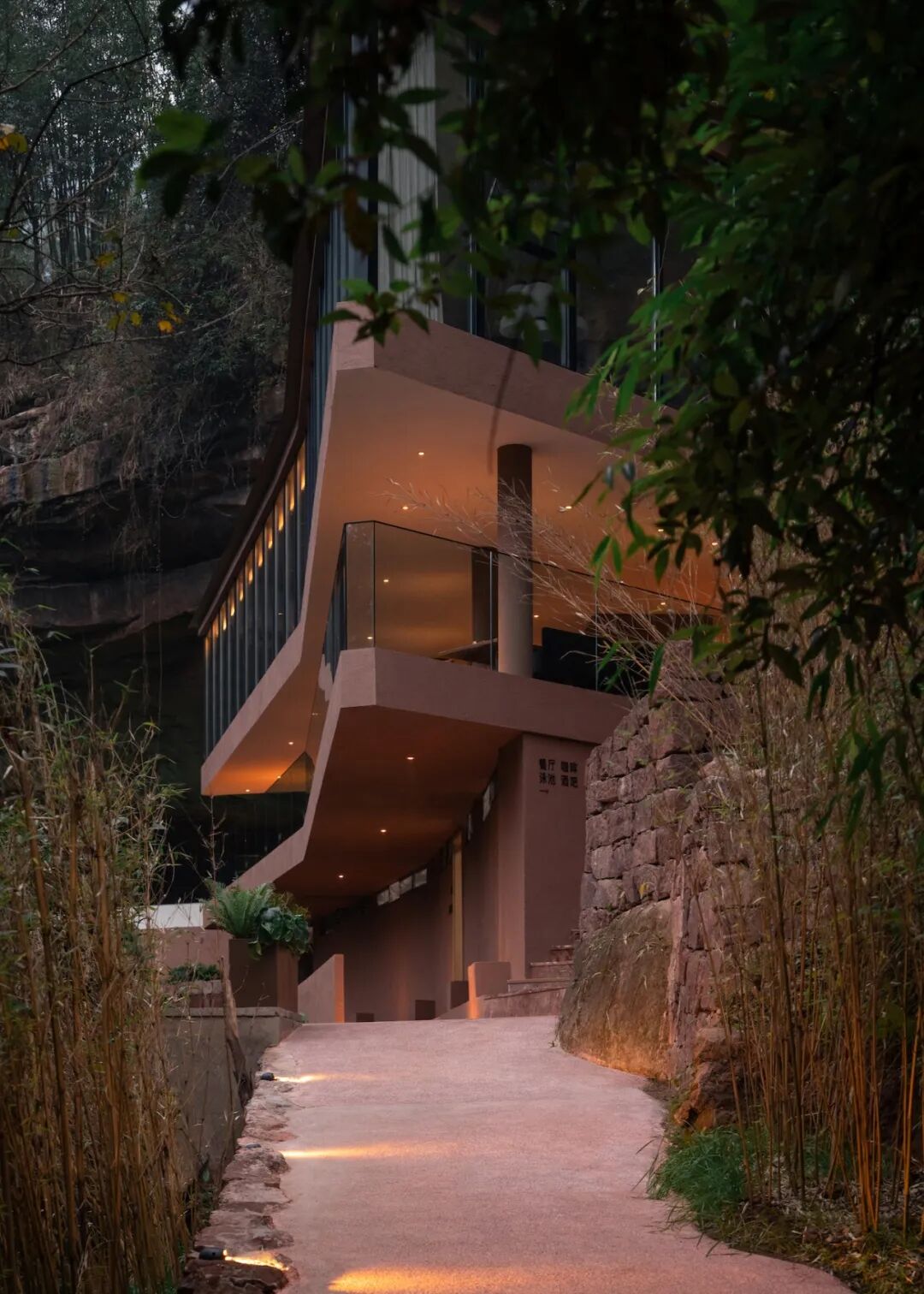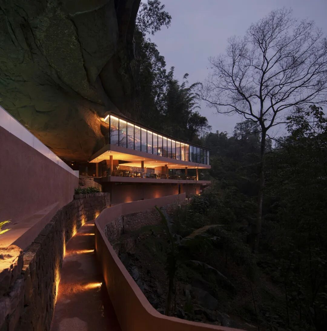 在入口方式上除了采用传统的进入方式,还采用栈道的形式穿过丛林直接进入大堂区域,与客房互不干扰,丛木、栈道、洞穴的遮掩关系,使栈道犹如一条去往世外桃源的秘境。