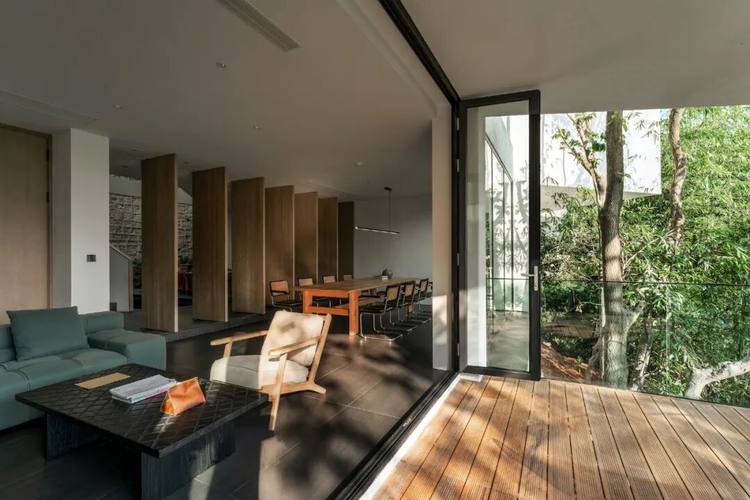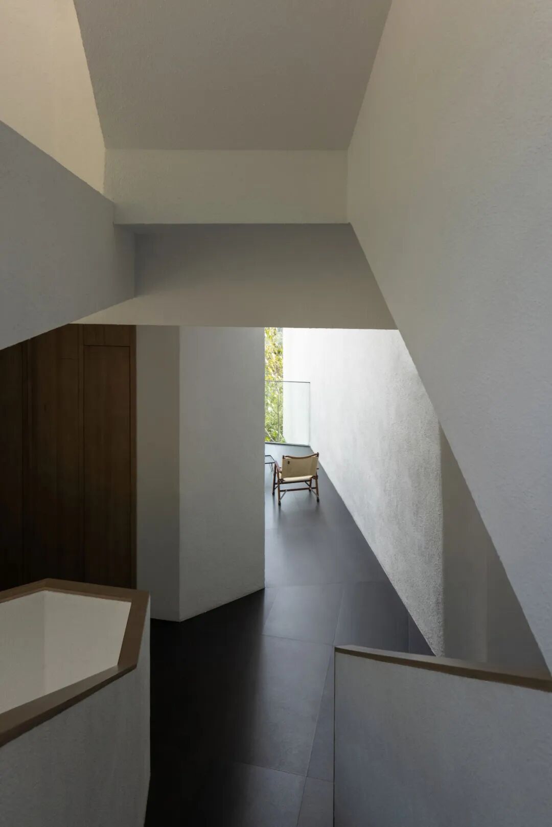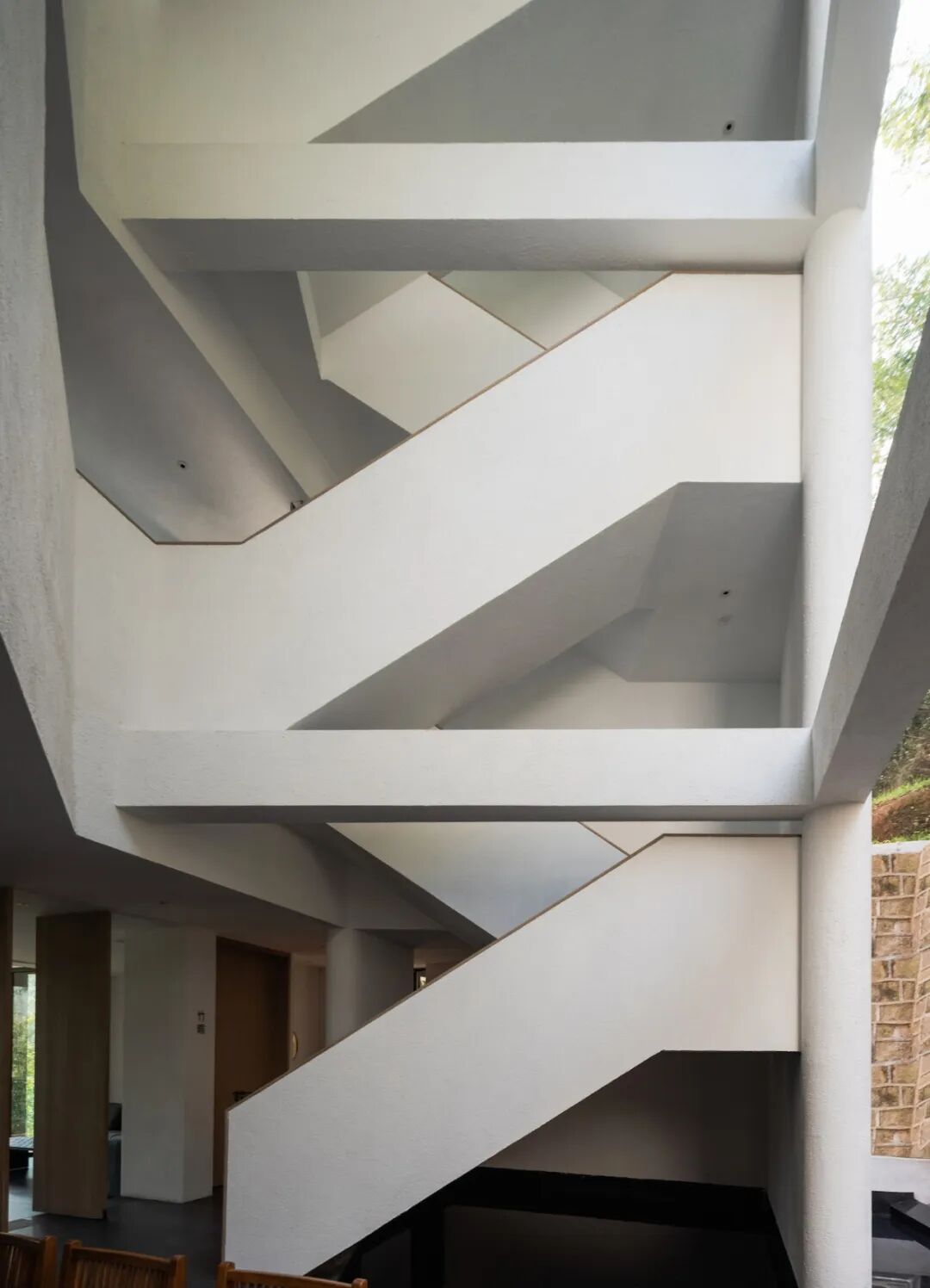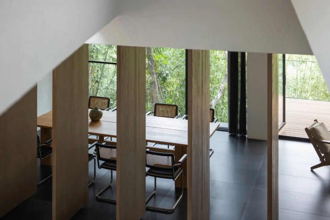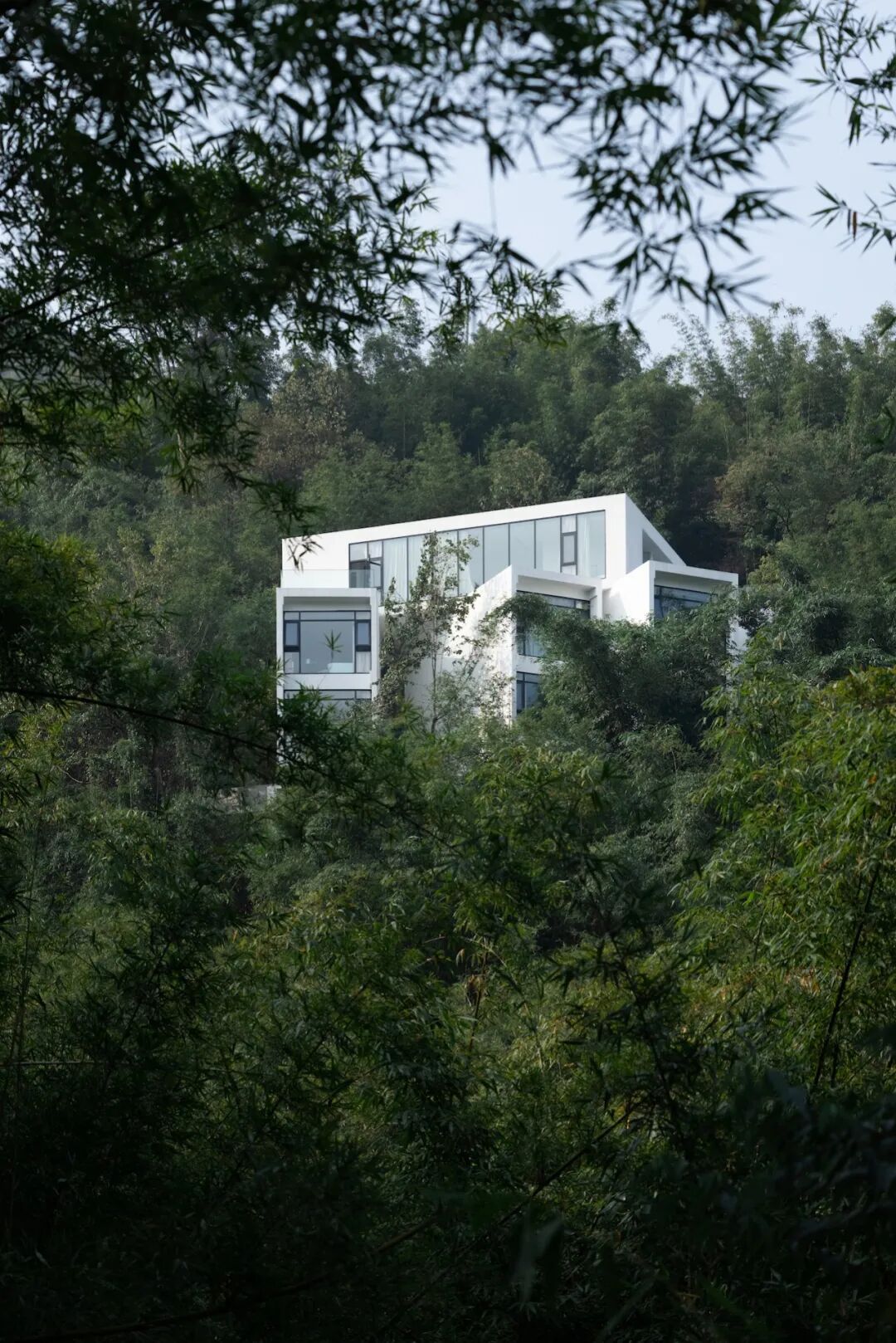 通过泳池下方的过道,经过餐厅,穿过一片竹林,就能看到一栋置身竹林之中的白色建筑,它是一栋坡地建筑,也是形式与功能相结合的房子。