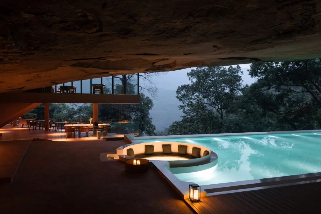 在泳池的上方是洞穴的第二条瀑布,瀑布营造独特的就餐环境,潺潺流水,与泳池相呼应。餐厅的户外平台,人与水近距离接触,听着林涧鸟语,感受细水长流......